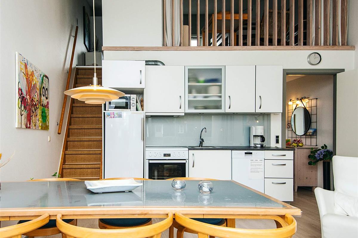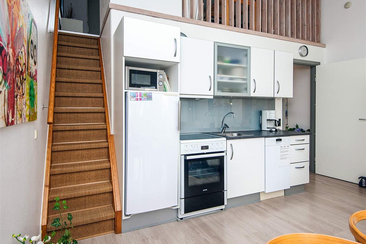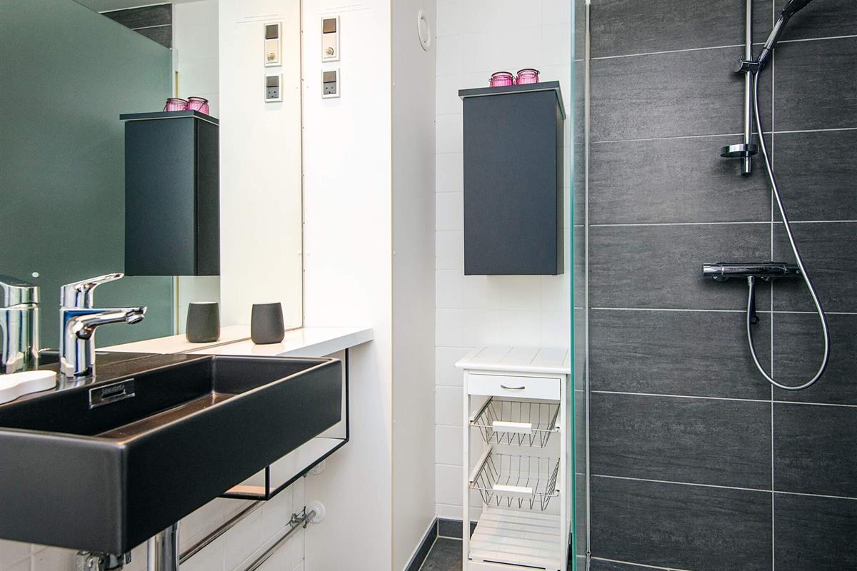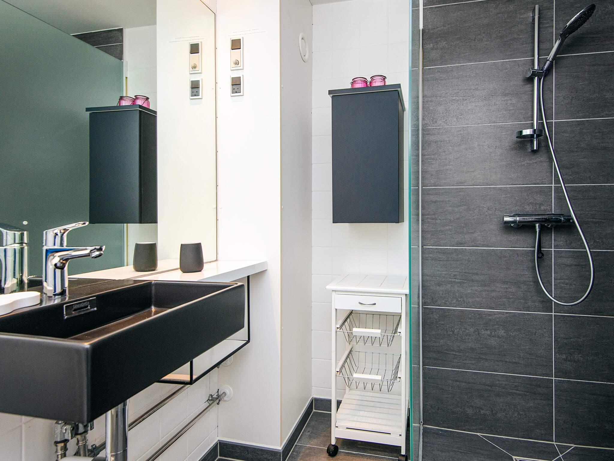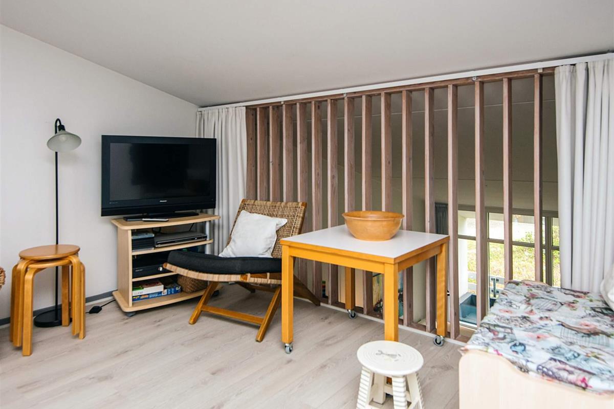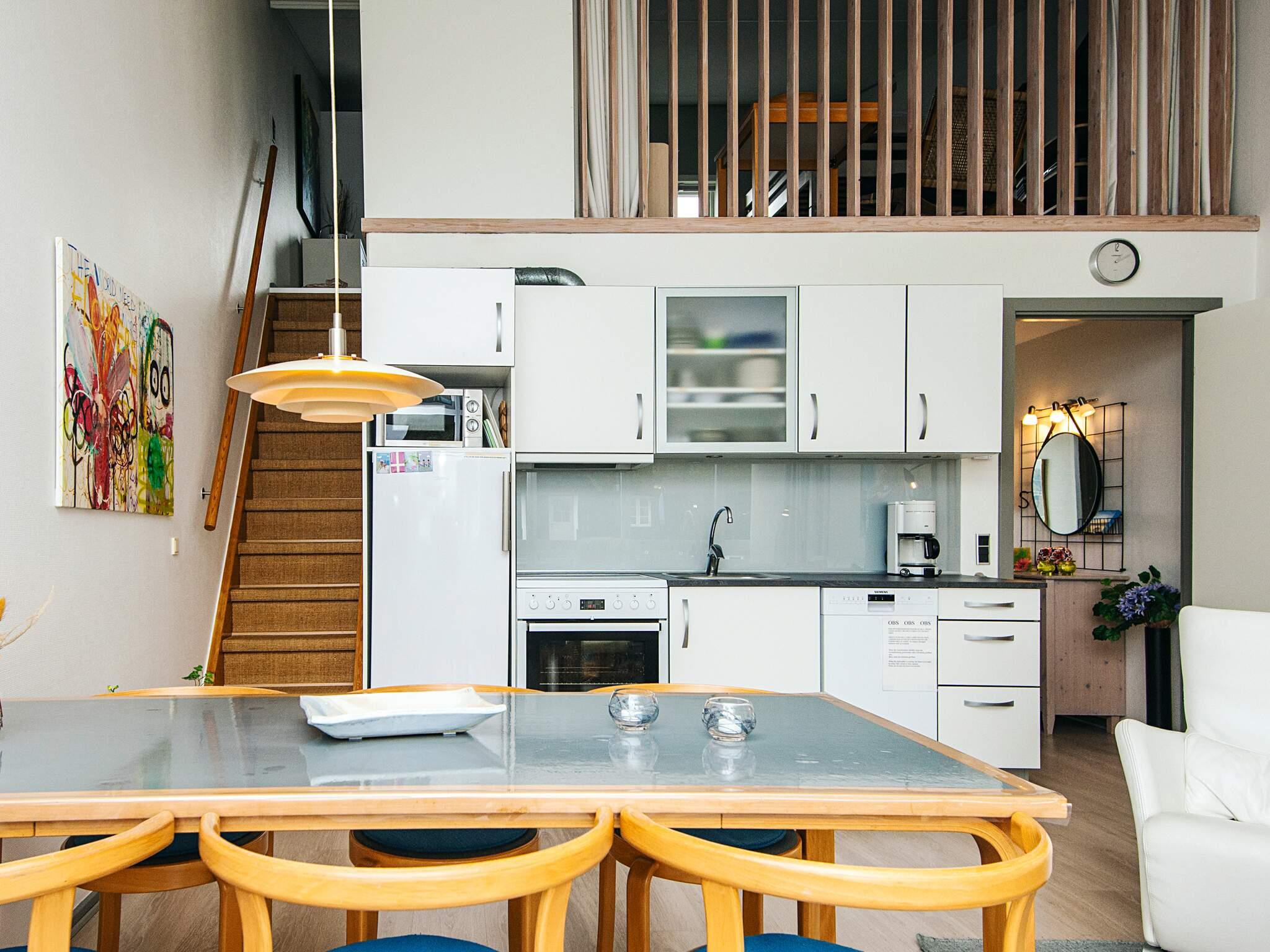 Die Wohnung verfügt über ein Badezimmer mit Dusche und ein Schlafzimmer mit einem Doppelbett. Vom Wohnzimmer aus führt eine Treppe zu einem offenen Raum mit einem Doppelbett und einem Etagenbett. Der Raum kann mit Vorhängen abgetrennt werden und dient so als zusätzlicher Raum. Die Wohnung ist mit einer Wärmepumpe ausgestattet. Ein Hochstuhl, ein Wochenendbett für Kinder und ein Wickeltisch sind ebenfalls vorhanden.