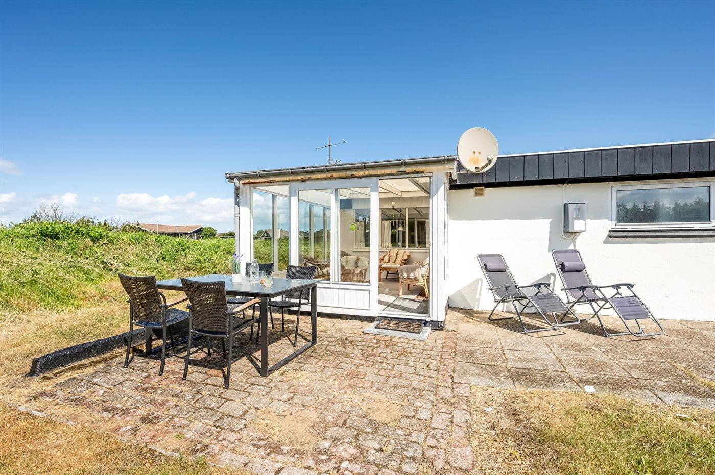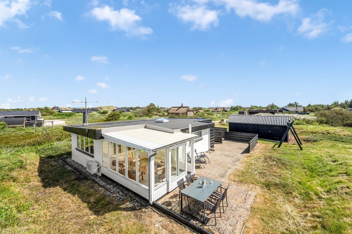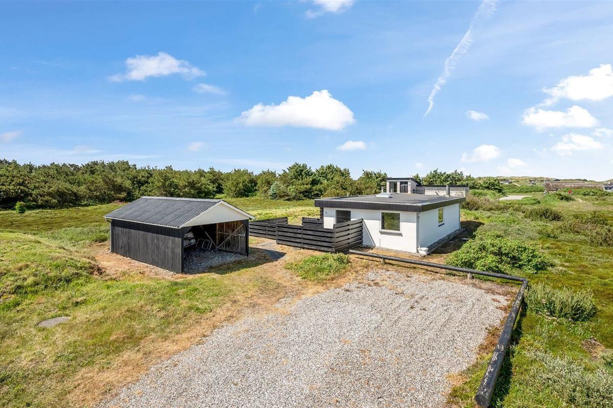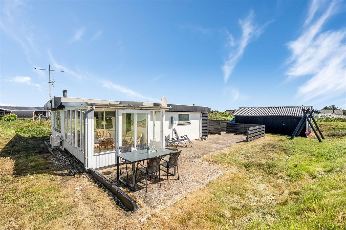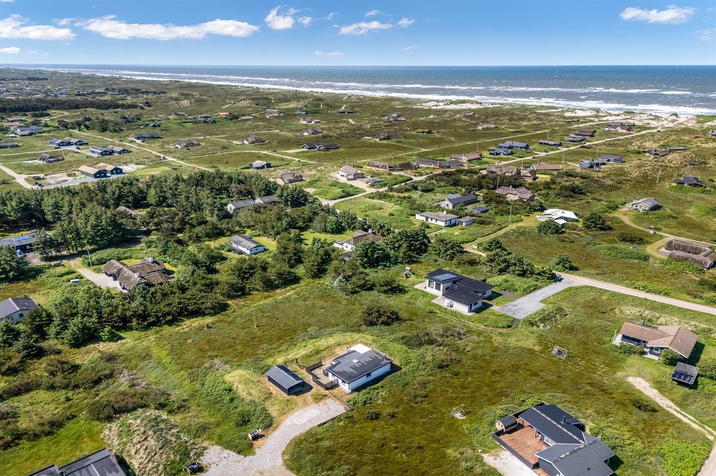 De vakantiewoning is gelegen op een 2500 m² groot natuural grond. Afstand tot de zee 700 m. Afstand tot de fjord 1500 m. Dichtstbijzijnde winkel 2000 m. Er is een golfbaan op een afstand van 3000 m. Bij de vakantiewoning hoort 40 m² terras. Schommel. Carport ter beschikking. Parkeerplaats bij het huis.