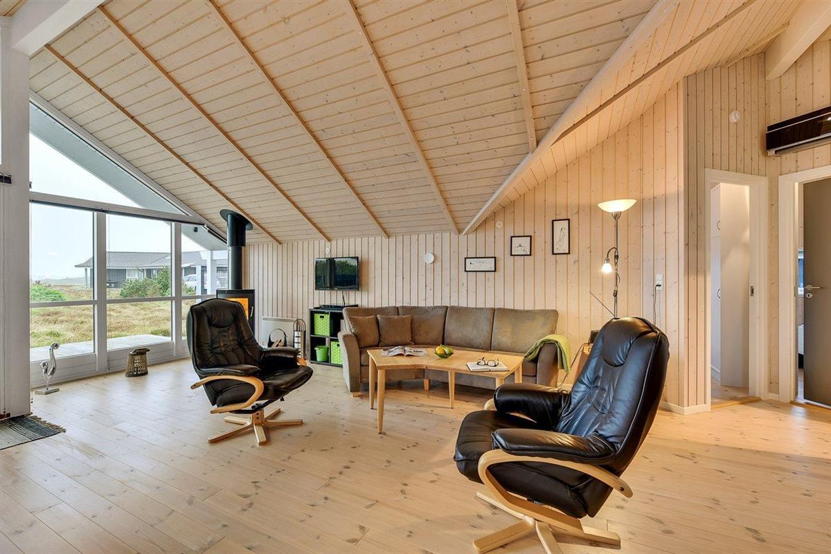 Modern vakantiehuis in Søndervig met bubbelbad, houtkachel en ruime tuin dichtbij zee en fjord.