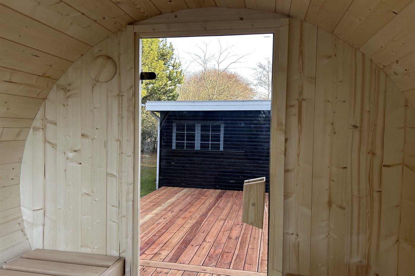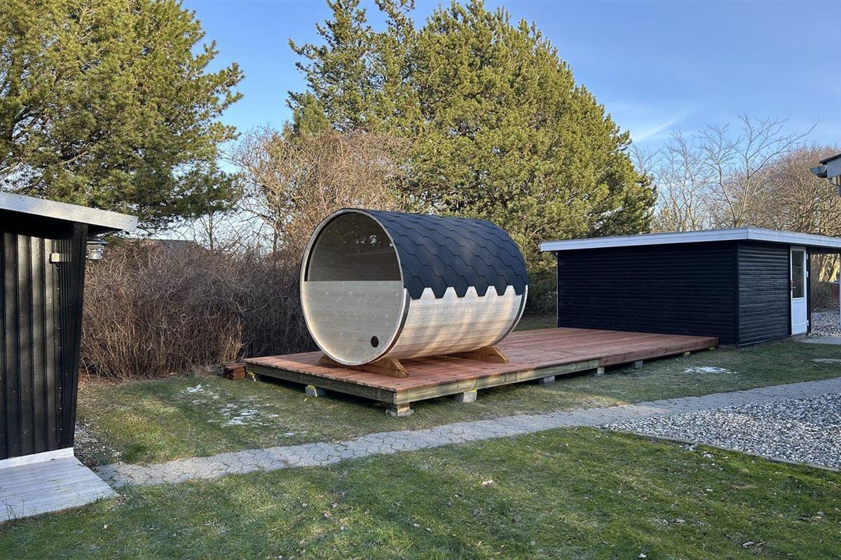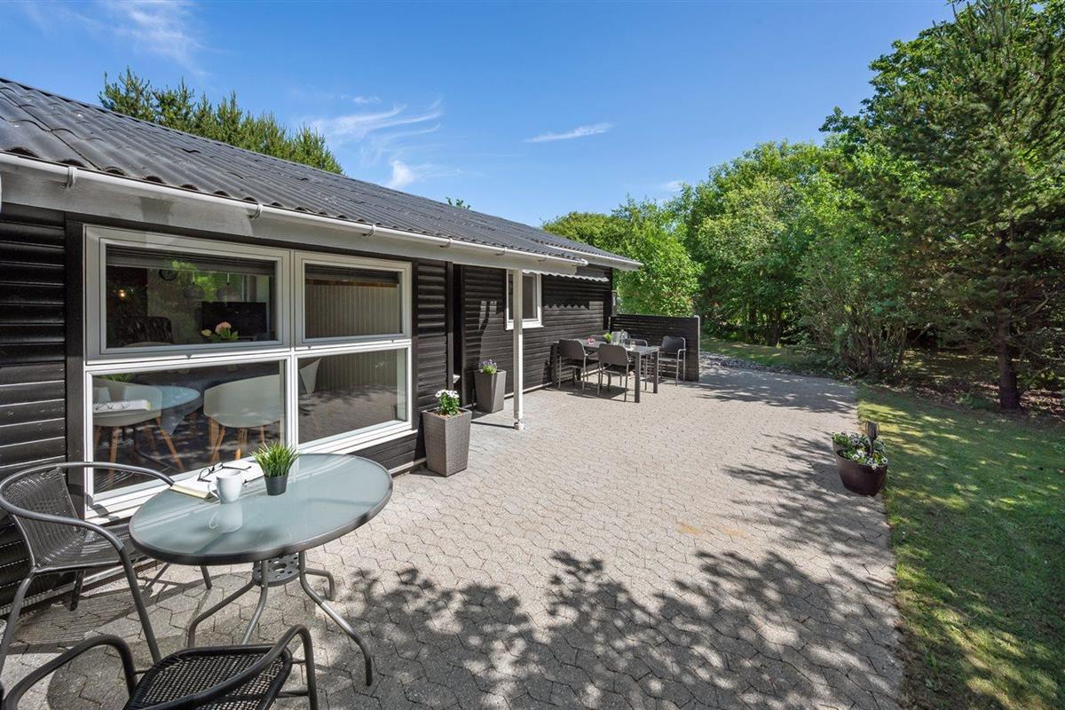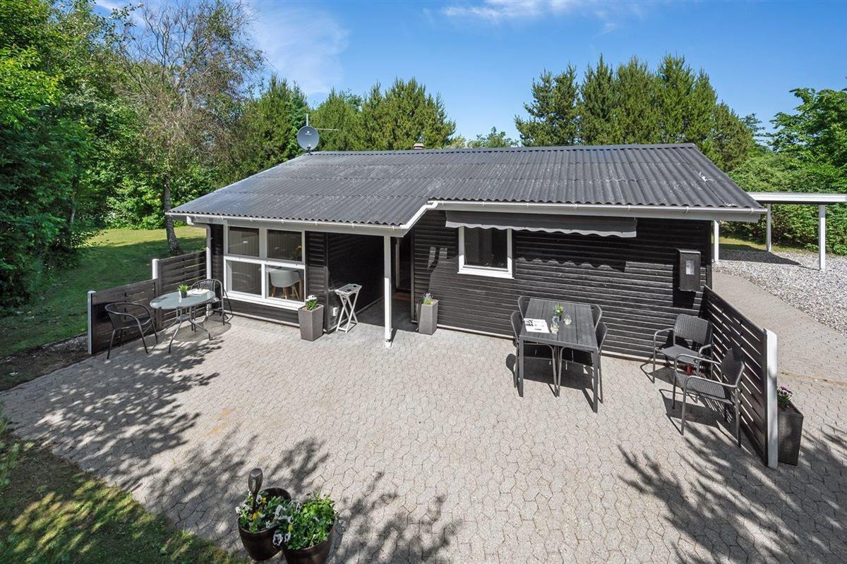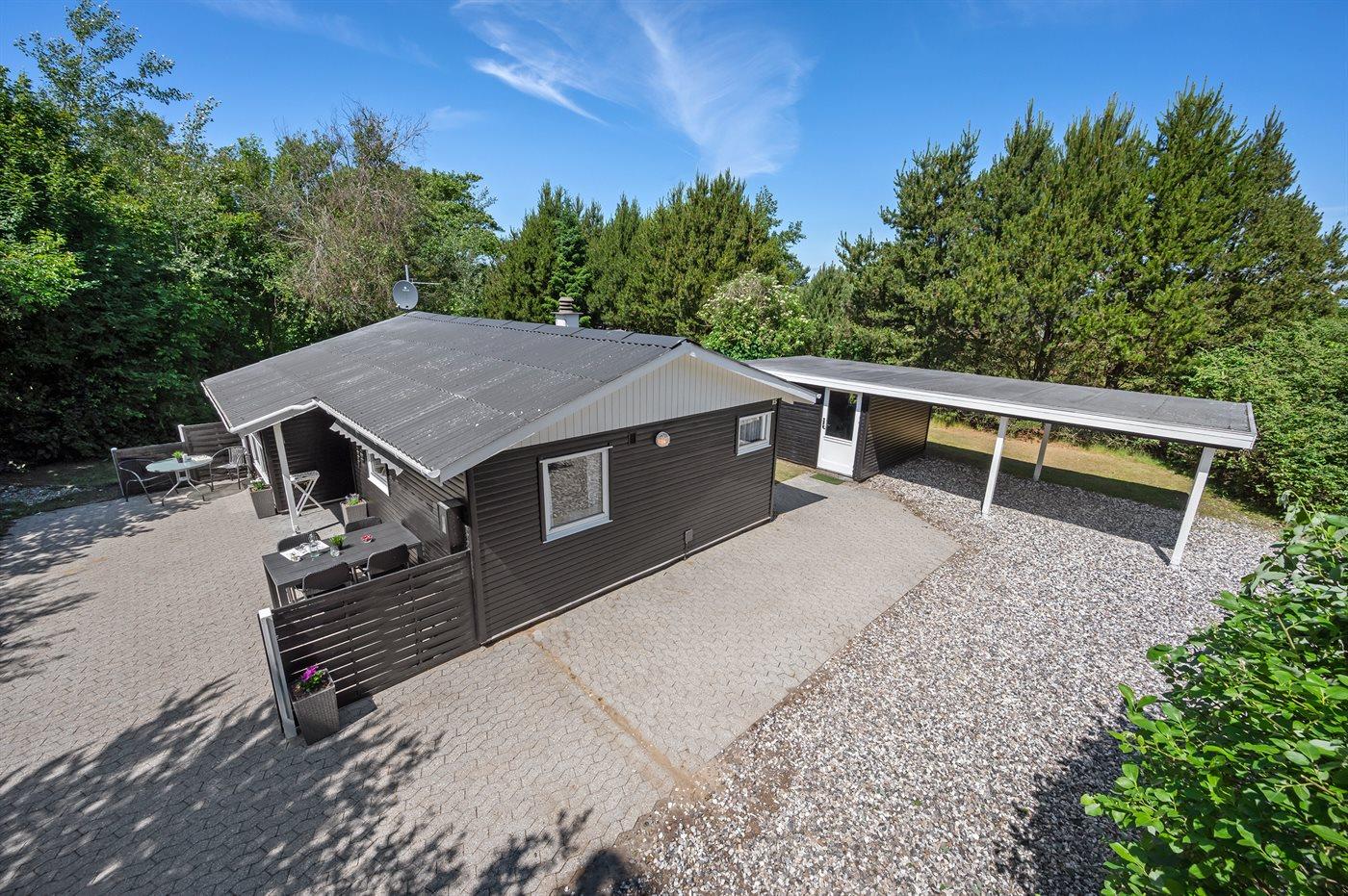 De vakantiewoning is gelegen op een 2300 m² groot aangelegde tuin. Afstand tot de zee 1600 m. Dichtstbijzijnde winkel 1400 m. Er is een golfbaan op een afstand van 600 m. Bij de vakantiewoning hoort 40 m² terras. Voetbaldoel. Buitensauna. Carport ter beschikking. Parkeerplaats bij het huis.