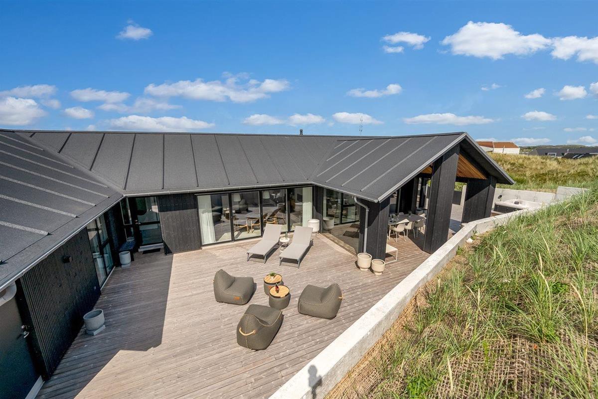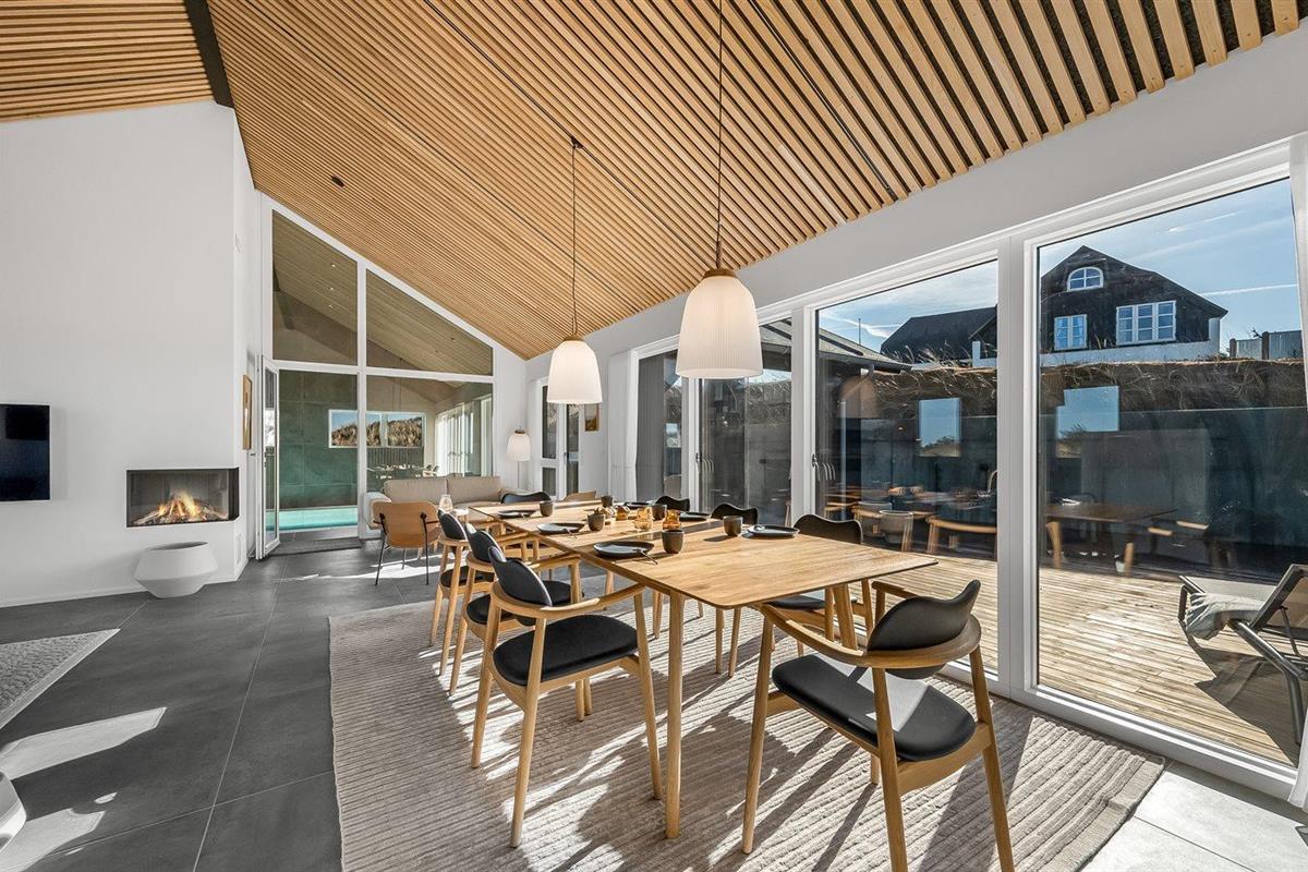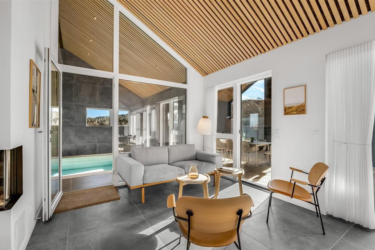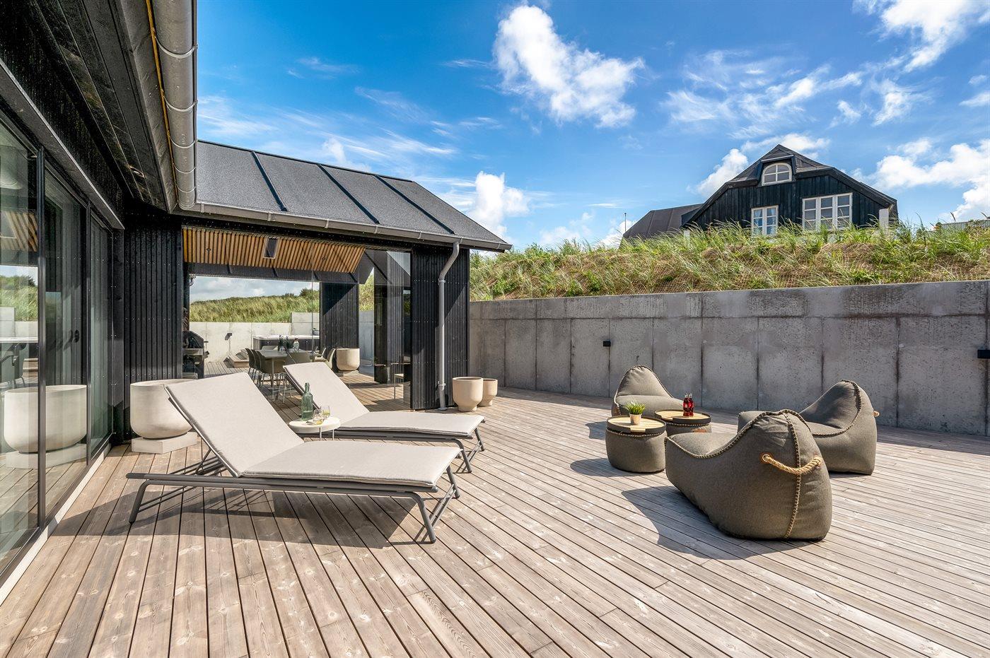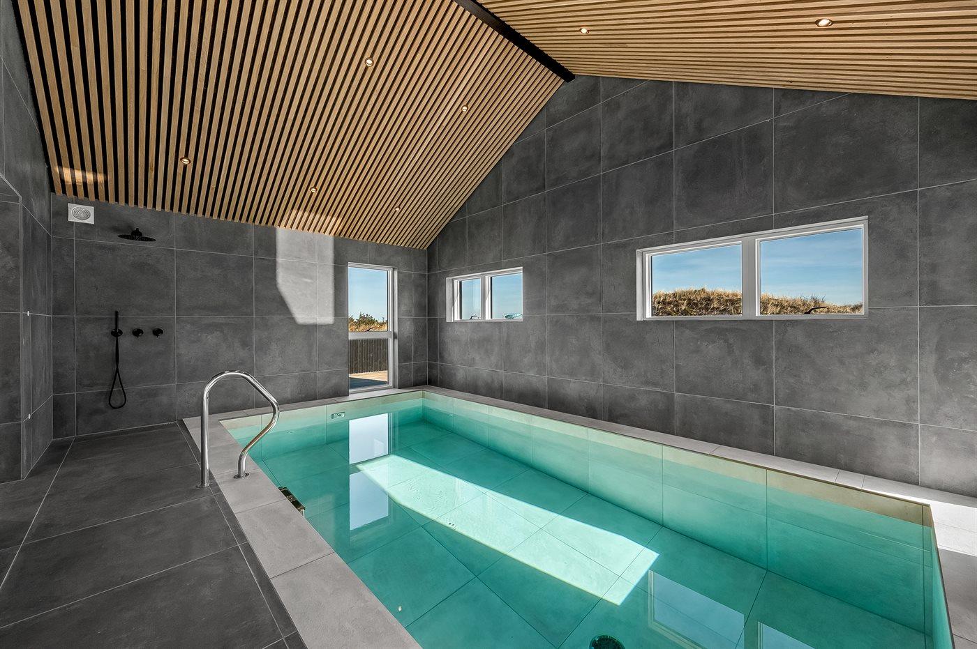 Modern vakantiehuis in Søndervig met binnenzwembad, bubbelbad en grote terrassen, vlak bij zee en fjord.