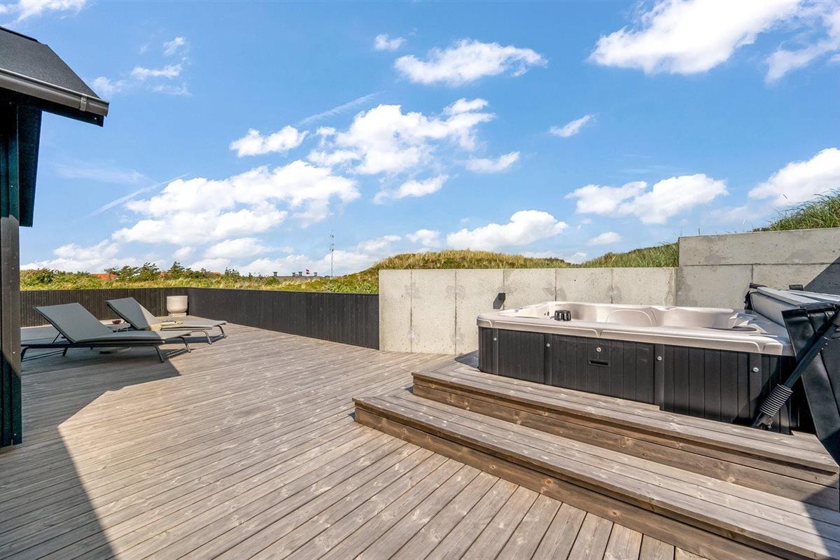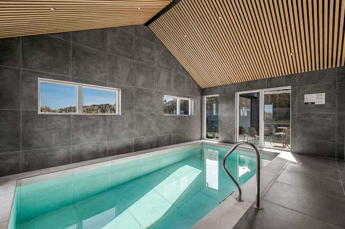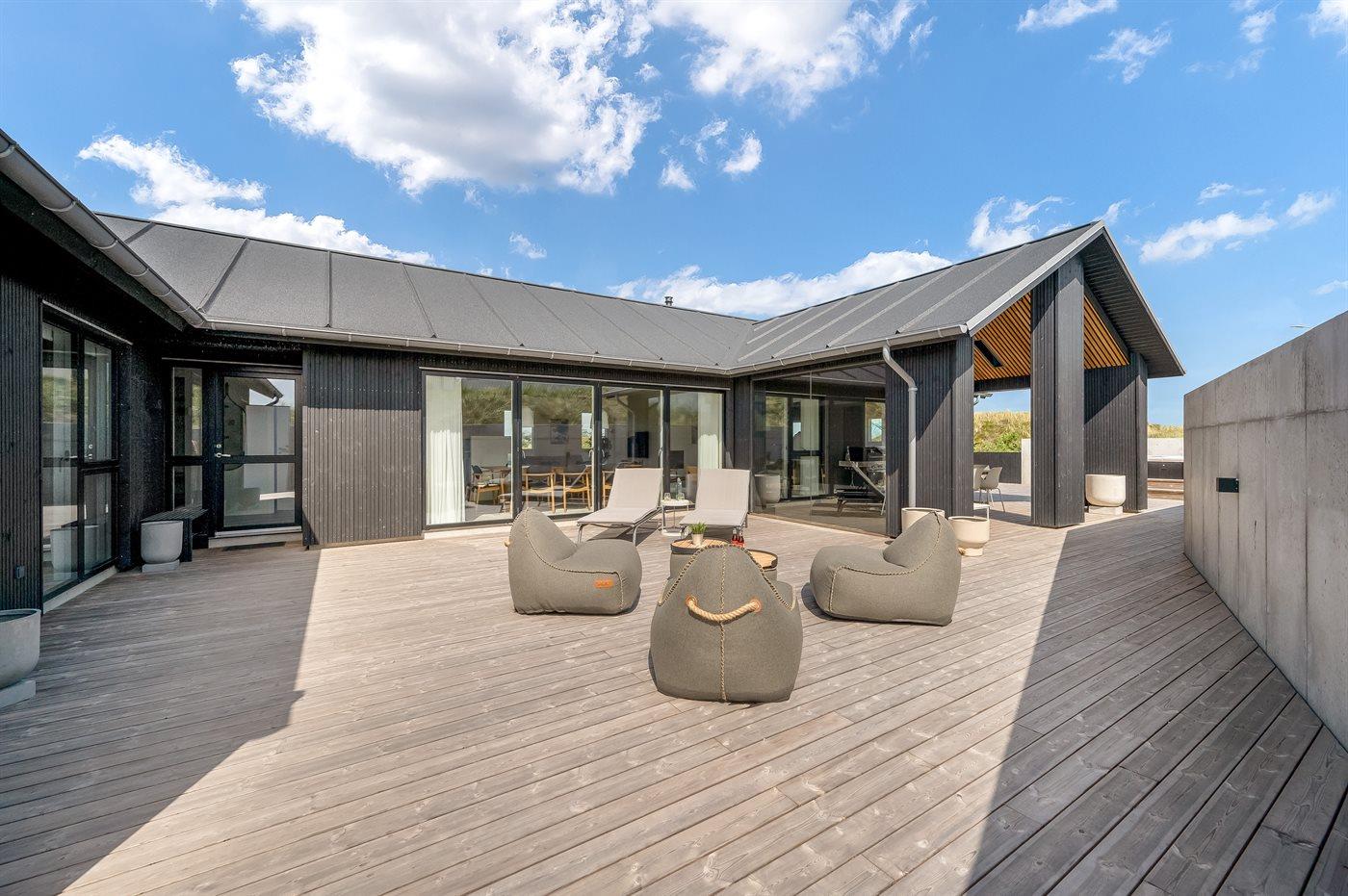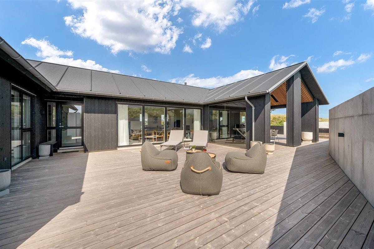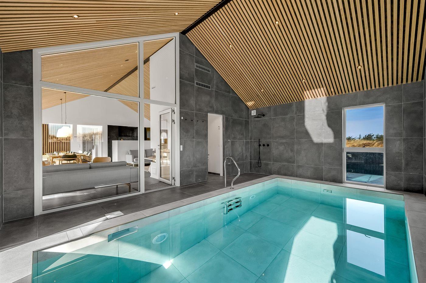 Modern vakantiehuis in Søndervig met binnenzwembad, bubbelbad en grote terrassen, vlak bij zee en fjord.