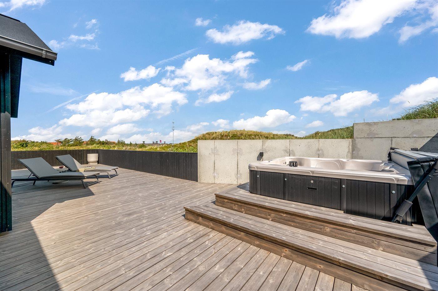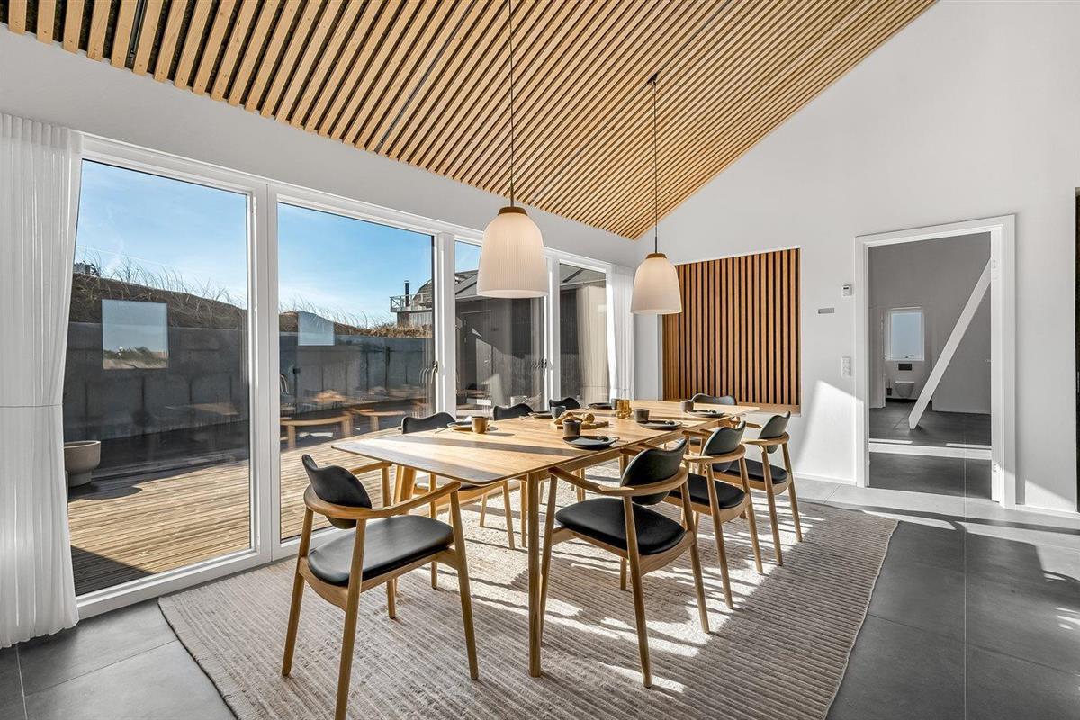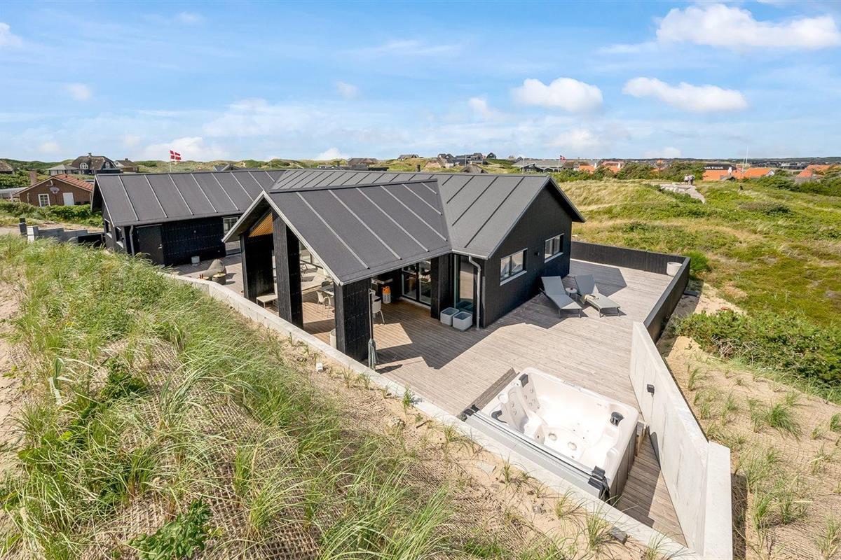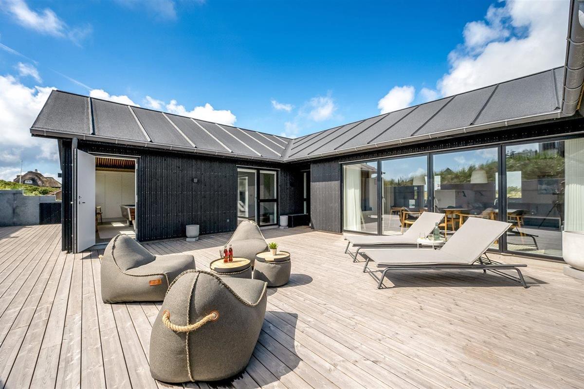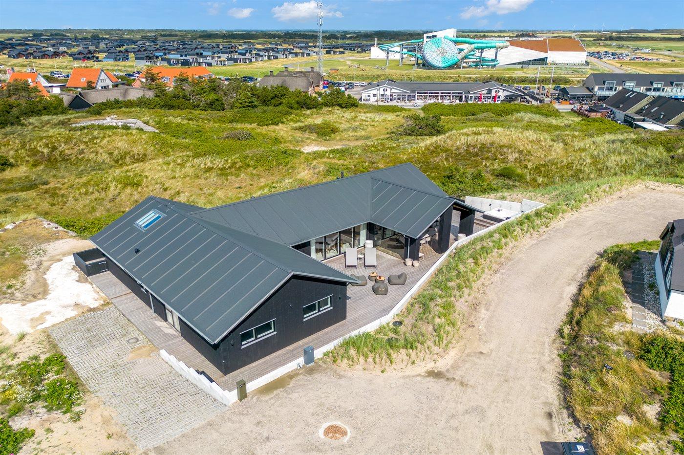 Modern vakantiehuis in Søndervig met binnenzwembad, bubbelbad en grote terrassen, vlak bij zee en fjord.