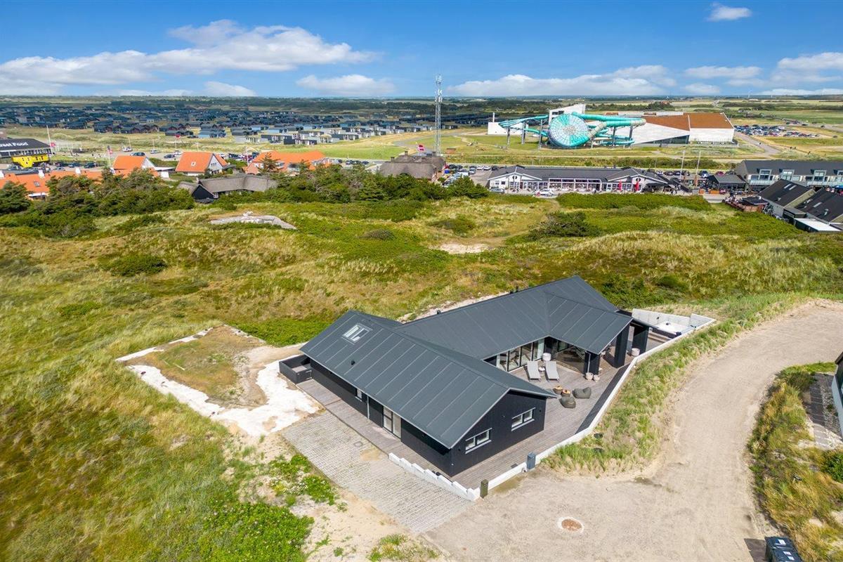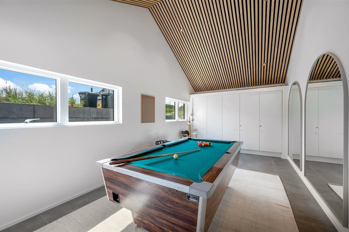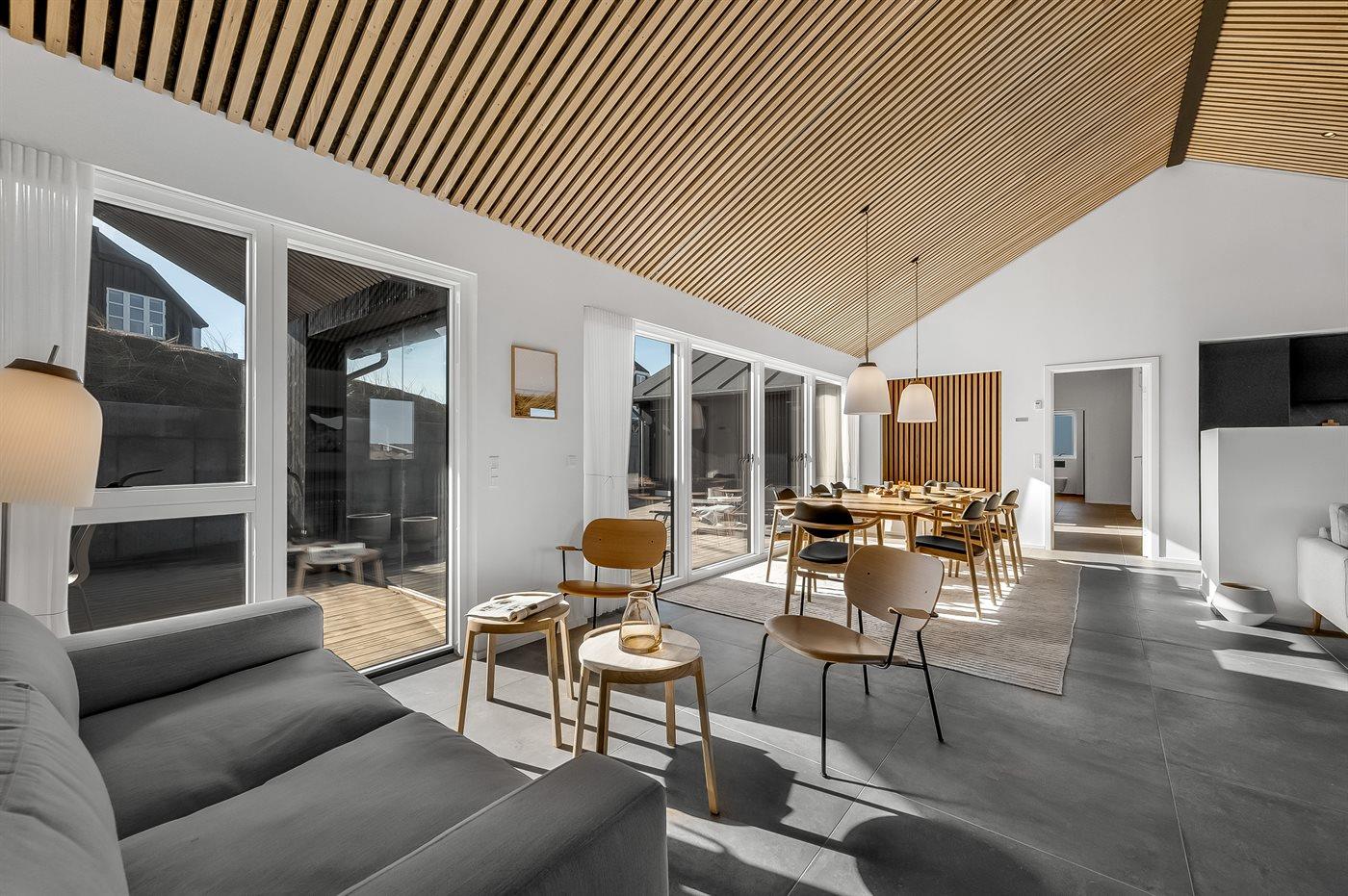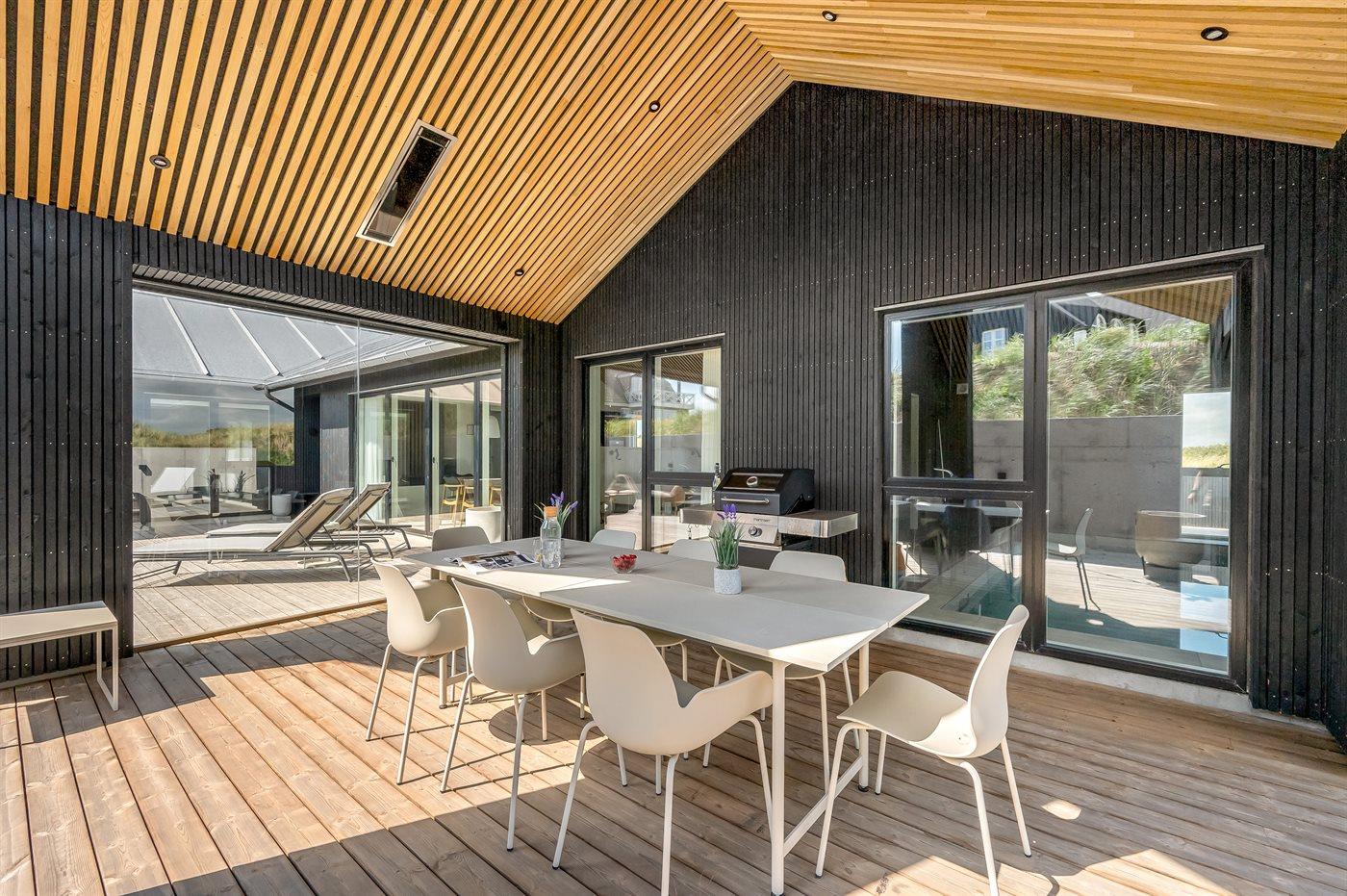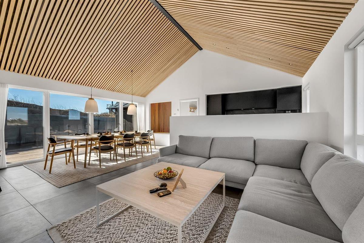 Modern vakantiehuis in Søndervig met binnenzwembad, bubbelbad en grote terrassen, vlak bij zee en fjord.