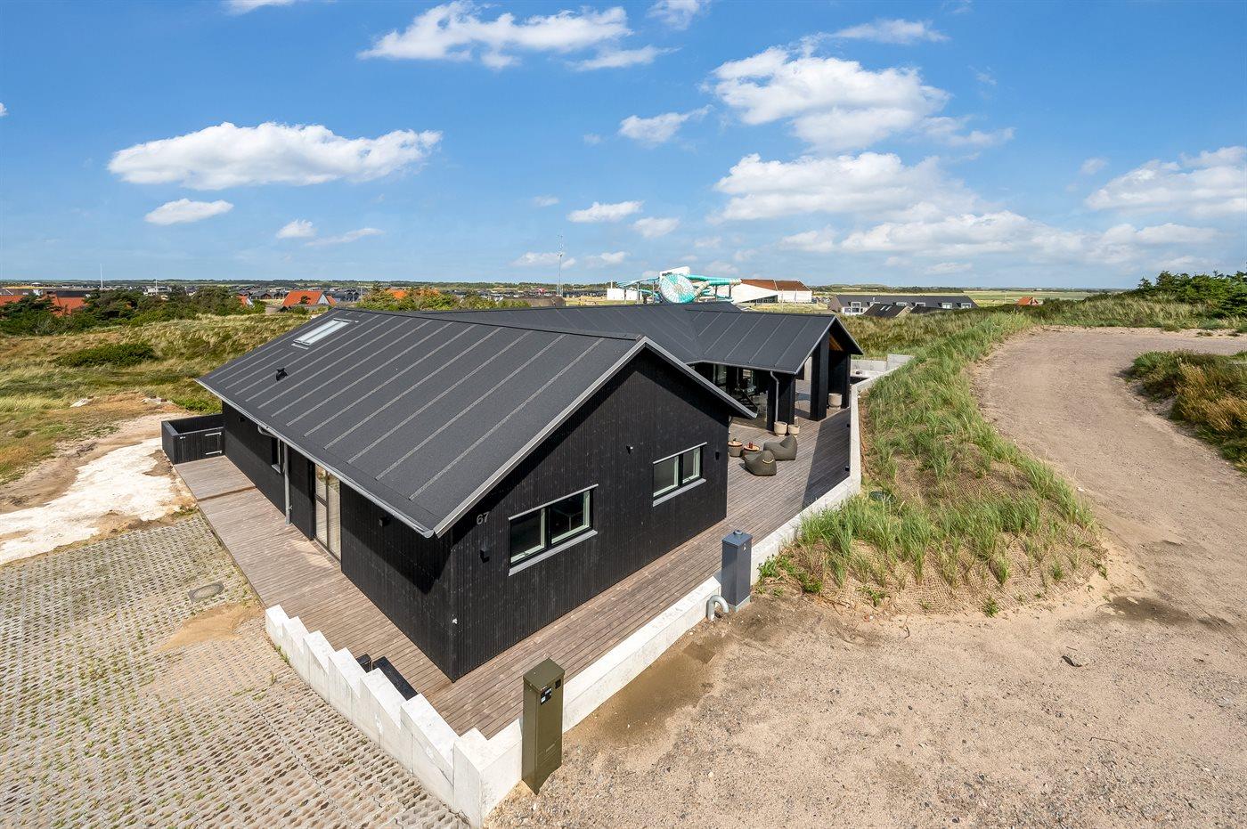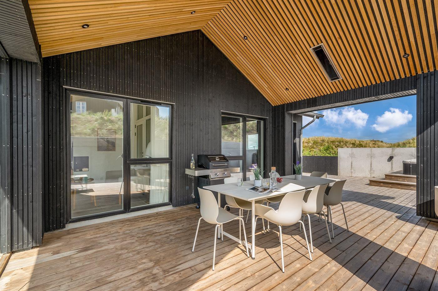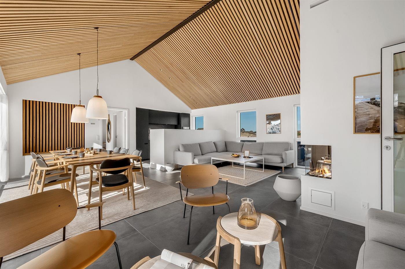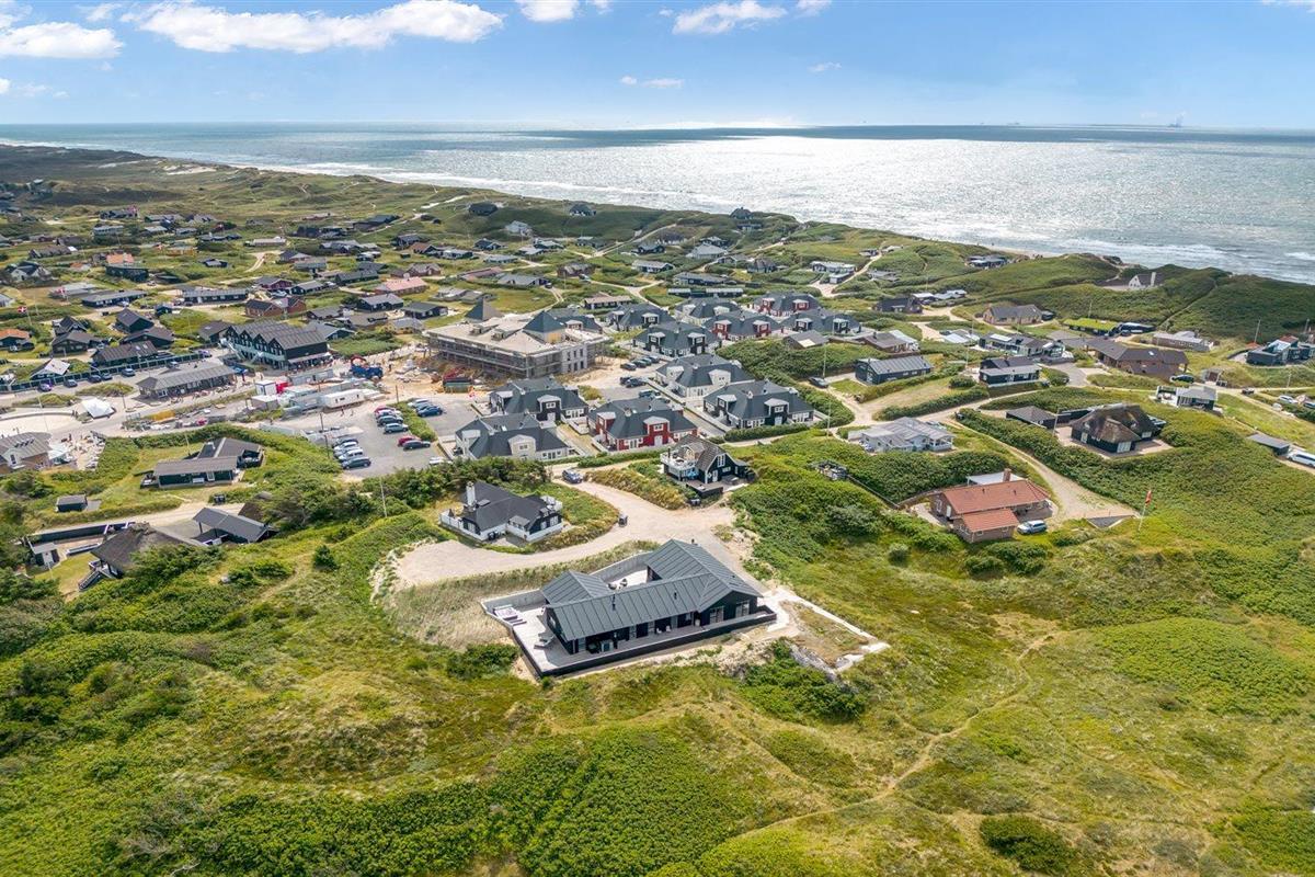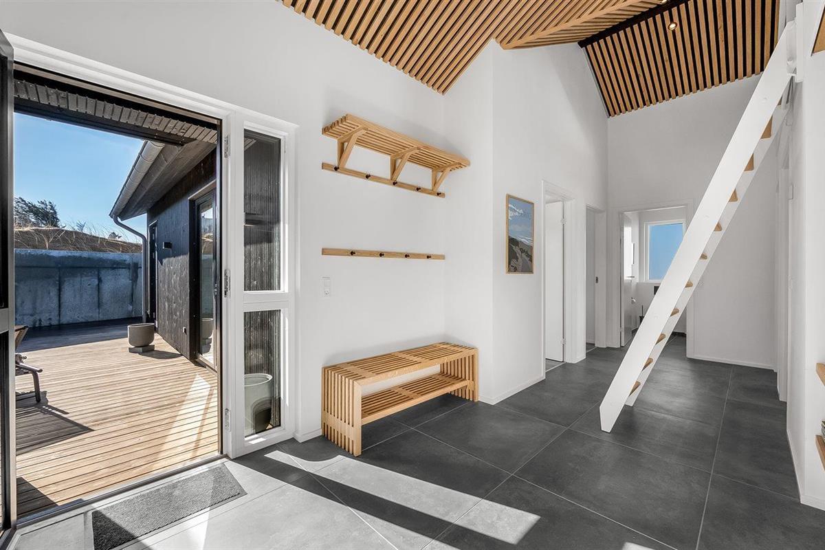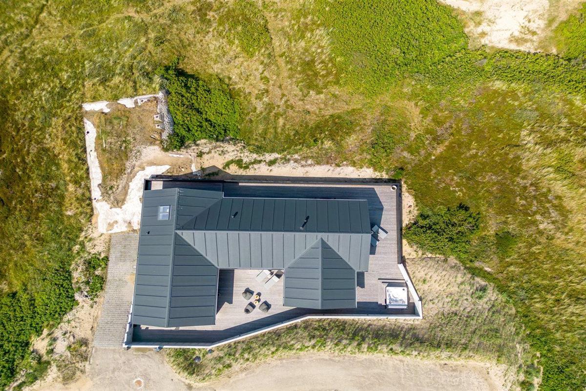 De vakantiewoning is gelegen op een 1200 m² groot natuural grond. Afstand tot de zee 250 m. Afstand tot de fjord 750 m. Dichtstbijzijnde winkel 100 m. Er is een golfbaan op een afstand van 1000 m. Bij de vakantiewoning hoort 135 m² terras en 15 m² groot overdekt terras - waarvan in totaal 150 m² beschut terras. Buitendouche. Het huis heeft een stopcontact voor het opladen van een elektrische auto. Oplaadstekker type 2. Met 11 kW-laadvermogen. Parkeerplaats bij het huis.