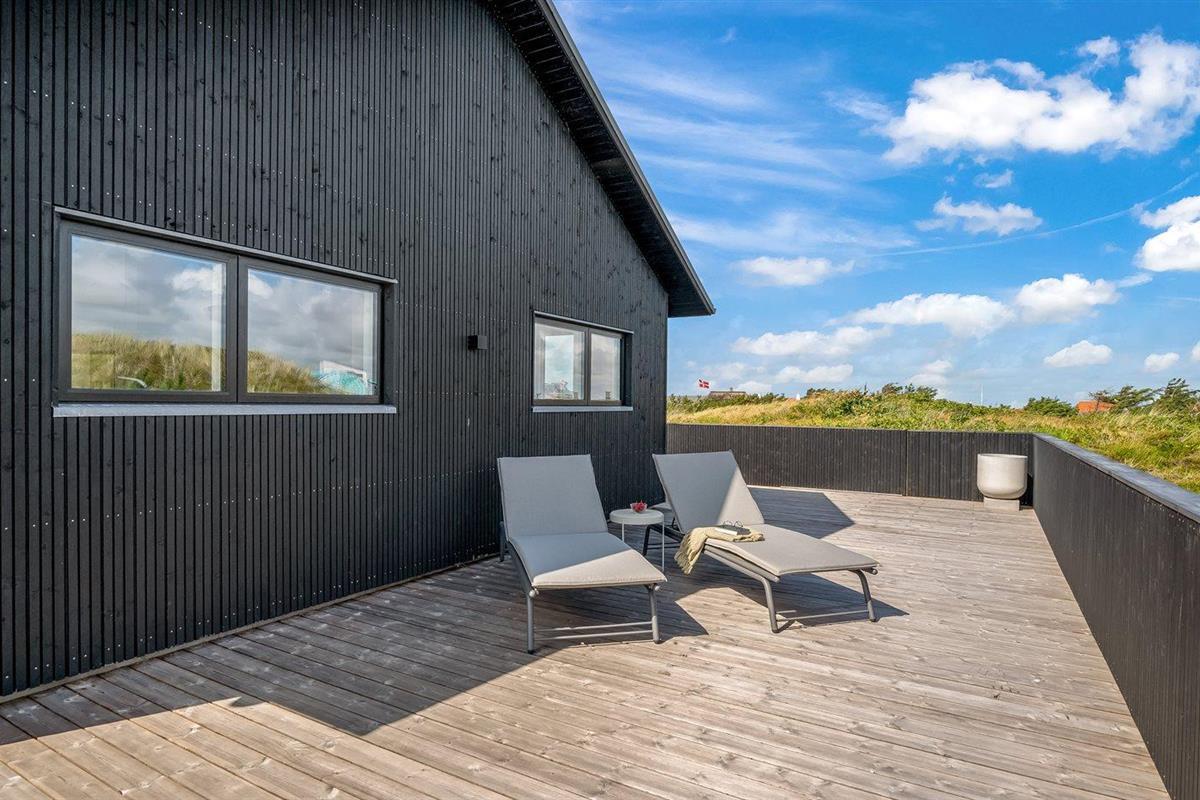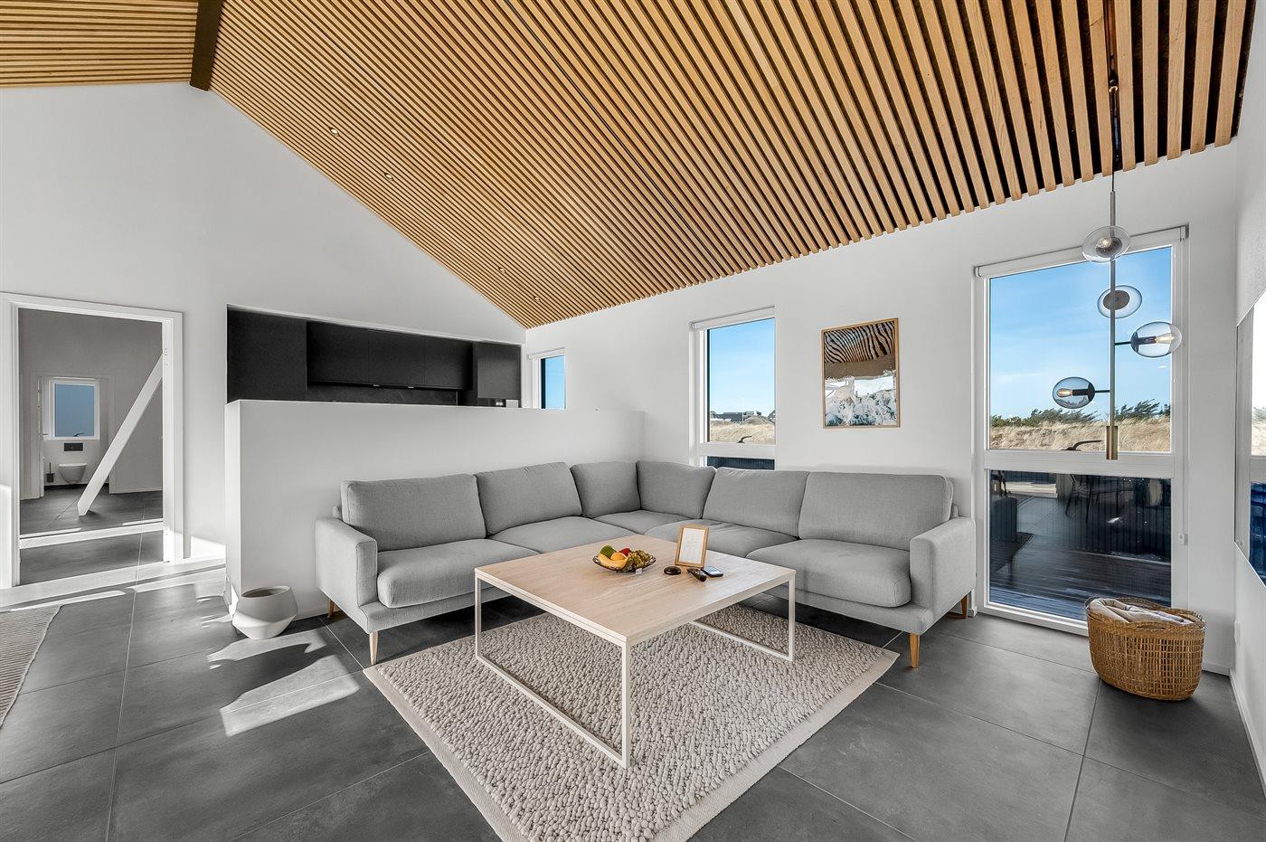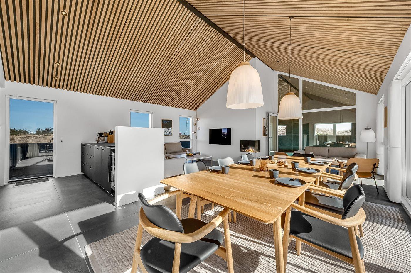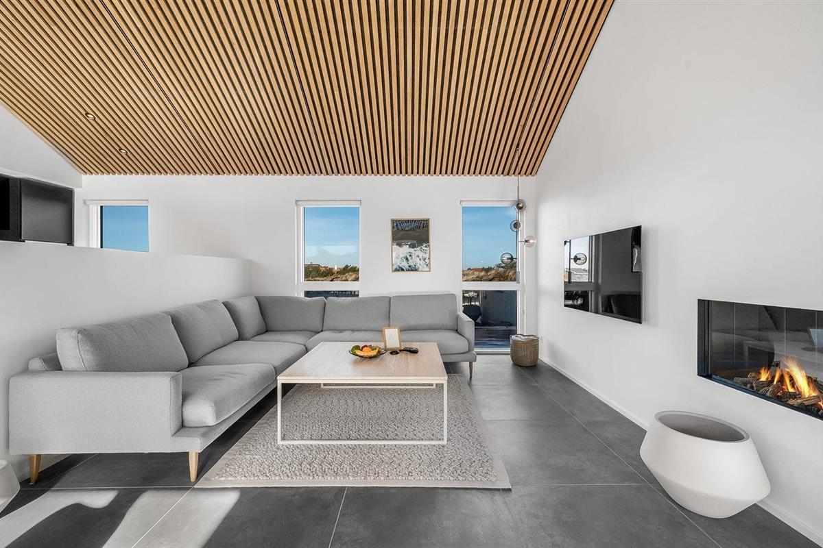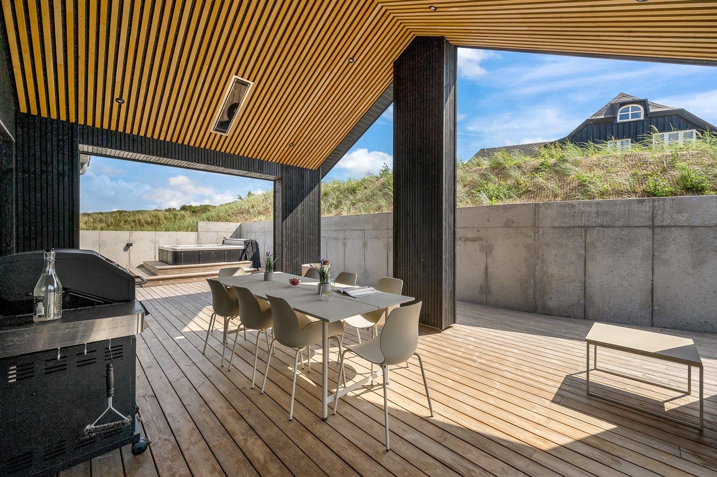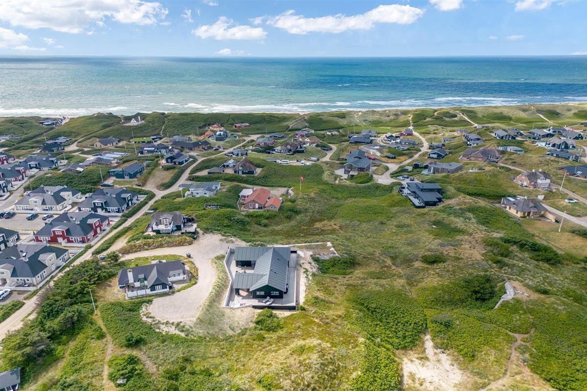 De vakantiewoning is gelegen op een 1200 m² groot natuural grond. Afstand tot de zee 250 m. Afstand tot de fjord 750 m. Dichtstbijzijnde winkel 100 m. Er is een golfbaan op een afstand van 1000 m. Bij de vakantiewoning hoort 135 m² terras en 15 m² groot overdekt terras - waarvan in totaal 150 m² beschut terras. Buitendouche. Het huis heeft een stopcontact voor het opladen van een elektrische auto. Oplaadstekker type 2. Met 11 kW-laadvermogen. Parkeerplaats bij het huis.