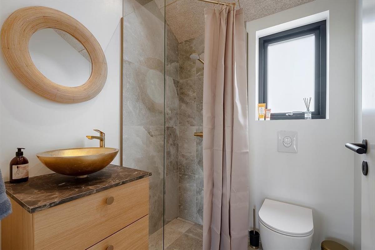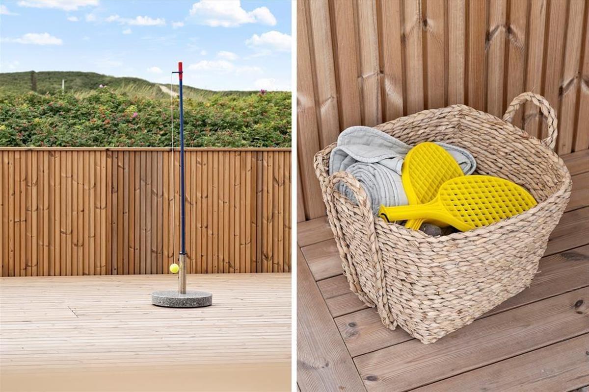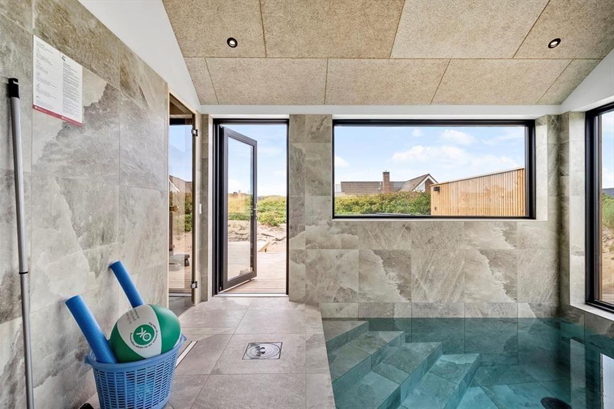 Schon beim Betreten dieser einladenden vier Wände wirst du die Ausstrahlung und Qualität des Interieurs bemerken. Dieses neu erbaute, moderne Pool-Ferienhaus mit seinen180 m2 bietet den perfekten Rahmen für einen aktiven und zugleich erholsamen Urlaub mit der Familie. Auf einem wunderschönen Naturgrundstück gelegen, bietet das Haus ein stilvoll luxuriöses Urlaubsdomizil mit großen Fenstern nach Westen – somit hast du einen fantastischen Blick auf die Dünen und die atemberaubenden Sonnenuntergänge. Die 10 Schlafplätze sind auf 4 Schlafräume aufgeteilt, wobei 3 der Zimmer über Doppelbetten verfügen und das letzte Schlafzimmer mit Etagenbetten ausgestattet ist. Der natürliche Treffpunkt ist der Wohnraum, der in offener Verbindung mit der gut ausgestatteten und einladenden Küche steht, in der köstliche Speisen für die ganze Gesellschaft zubereitet werden können. Und während das Essen zubereitet wird, kannst du den Blick auf die Dünen von den Wohnzimmermöbeln aus genießen - macht euch den Gaskamin an, das sorgt für die allergemütlichste Atmosphäre. Auch könnt ihr Filme über Chromecast auf dem Fernseher streamen oder aus den vielen hinterlegten TV-Kanälen wählen. Eines der Highlights des Hauses ist der Poolbereich mit Bassin mit Gegenstromanlage, der über eine große New Yorker Glastrennwand zugänglich ist. Hier lassen sich viele angenehme Stunden im und am Schwimmbad verbringen und du hast direkten Zugang zu einer Außendusche und dem herrlichen Freiluft-Whirlpool. Nach einem erfrischenden Bad oder einer Runde im Whirlpool kannst du dich in die Sauna zurückzuziehen, wo Ruhe und Wärme dich umhüllen. Beschäftigungen im Innenbereich gibt es reichlich, denn neben dem Poolbereich gibt es auch einen Aktivitätsraum mit Tischtennis und Dart.