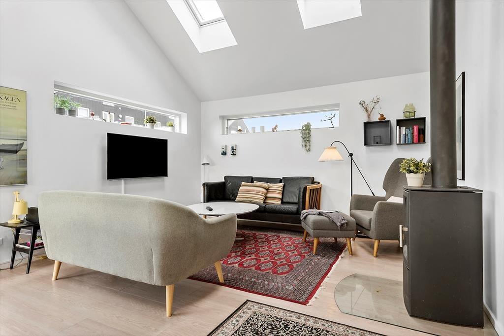 Dieses Ferienhaus beherbergt mit seinen beiden guten Schlafräumen und dem geräumigen Schlafboden bis zu sechs übernachtende Urlauber. Unabhängig davon, mit wie vielen Personen du anreist, ist es stets ein herrliches Gefühl, sich im Wohnraum dieses Hauses aufzuhalten und zu entspannen. Der Wohnraum besticht mit hohen Decken, Dachflächenfenstern und einer durchweg einladenden Einrichtung, die schöne, komfortable Möbelstücke umfasst. Während du es dir mit deinen Lieben in der Polstersitzgruppe gemütlich machst, blickst du entweder auf die tanzenden Flammen im Kaminofen oder auf den Flachbild-TV, der Unterhaltung und Abwechslung verspricht. Die kleinen und großen Mahlzeiten des Tages bereitest du mithilfe deiner Familie gern in der modernen offenen Küche zu. Nach langen, erlebnisreichen Urlaubstagen lädt die hauseigene Sauna zu traumhaft entspannten Momenten ein.