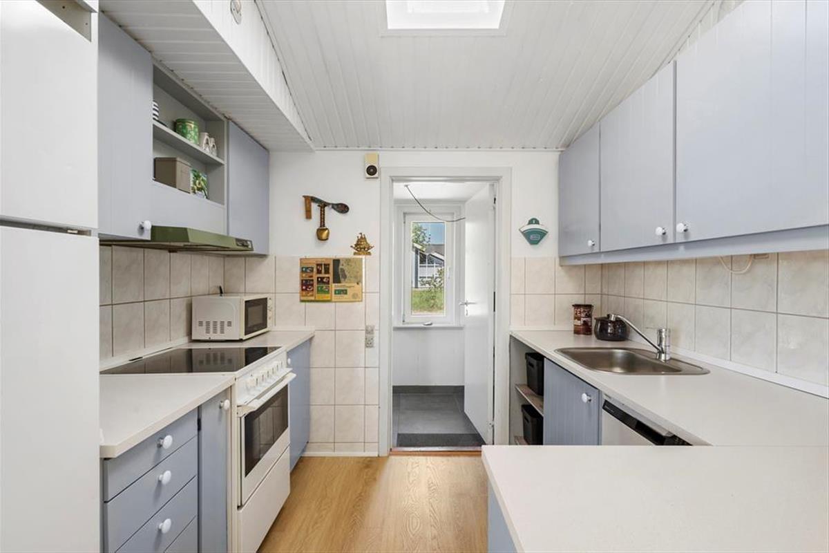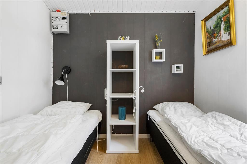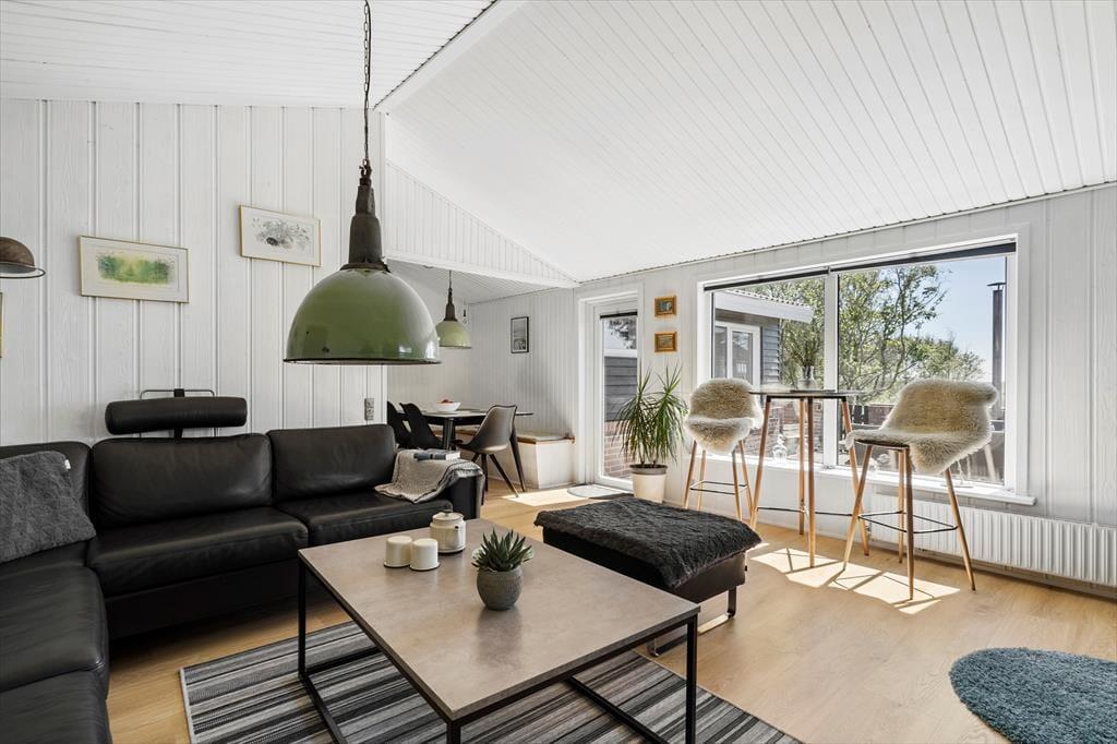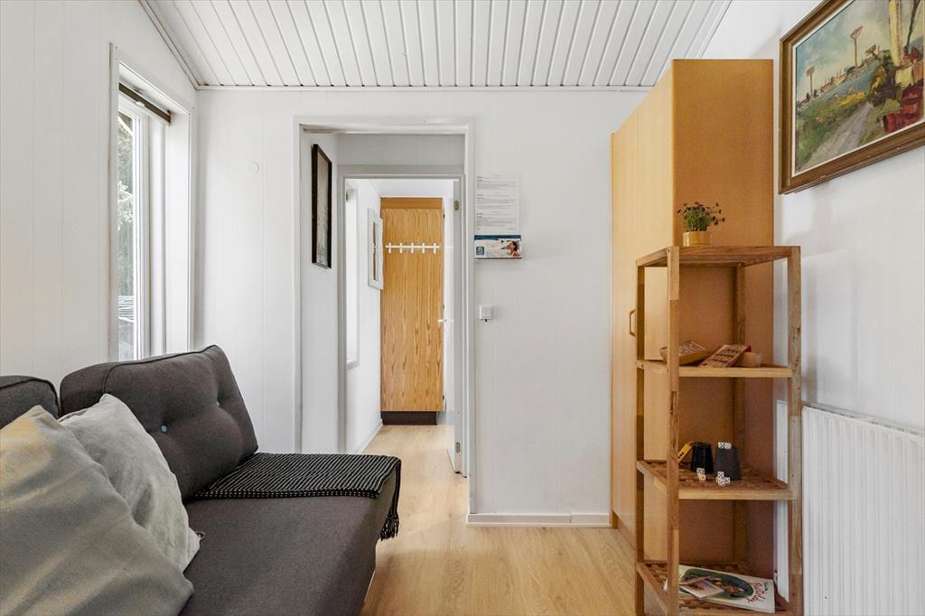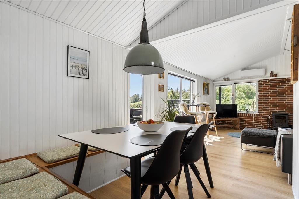 Das Sommerhaus liegt in ruhiger Umgebung an einer geschlossenen Straße und durch die Wohnzimmerfenster können Sie nicht nur auf das Naturgrundstück, sondern auch über die offene Feldlandschaft hinaus blicken. Im Innenbereich ist die Einrichtung überwiegend in gedeckten und hellen Tönen gehalten. Die Möbel sind ansprechend und bequem, denn eine behagliche Atmosphäre gehört dazu, wenn man sich im Wohnzimmer mit einem spannenden Roman oder einem vergnüglichen Film auf dem Flachbildfernseher zurücklehnt. Die Essecke mit Bänken und Stühlen ist ein gemütlicher Treffpunkt für die ganze Familie – und diese ist sehr praktisch direkt neben der Küche platziert. Das Plaudern kann also problemlos fortsetzen, während Sie nochmal Kaffee aufsetzen oder ein weiteres Ei zum Brunch bereiten.