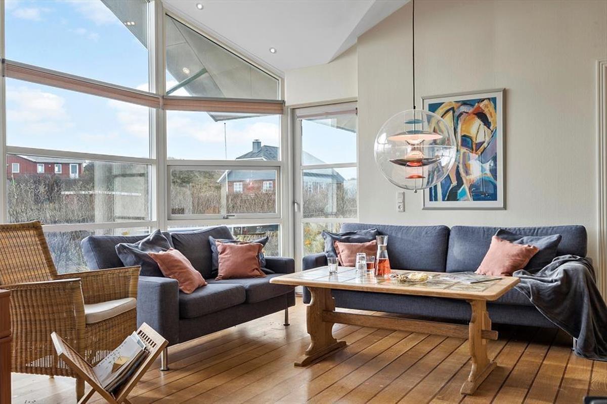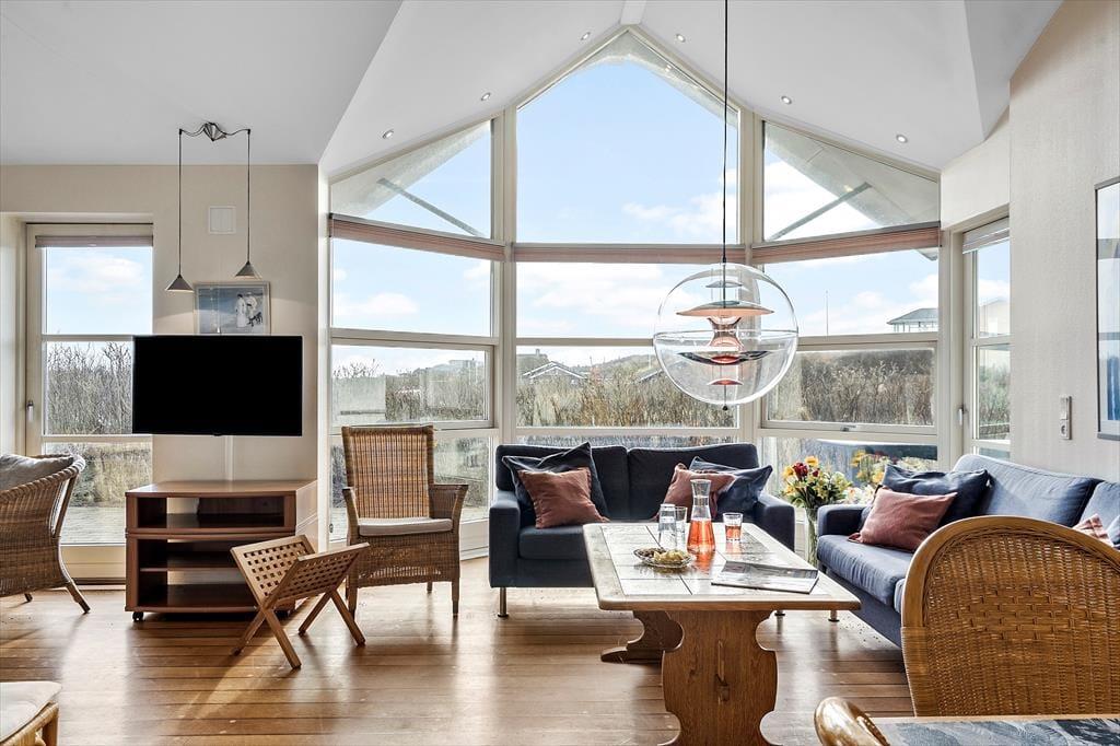 Dieses Ferienhaus bietet eine einzigartige Kombination aus modernem Komfort und einer malerischen Umgebung. Mit den großen Fenstern, die einen atemberaubenden Blick auf die umliegende Landschaft bieten, fühlt sich das Haus hell und offen an. Hier könnt ihr gemütliche Stunden mit Familie und Freunden im geräumigen Wohnbereich verbringen und seid gleichzeitig der Natur ganz nahe. Die Lage auf der kleinen Anhöhe sorgt für eine ruhige Atmosphäre, und die große Terrasse lädt zum Entspannen unter freiem Himmel ein. Hier ist der ideale Ort zum Zurückzuziehen, Ruhe zu genießen und gleichzeitig in der Nähe von Strand und lokalen Erlebnissen zu urlauben.