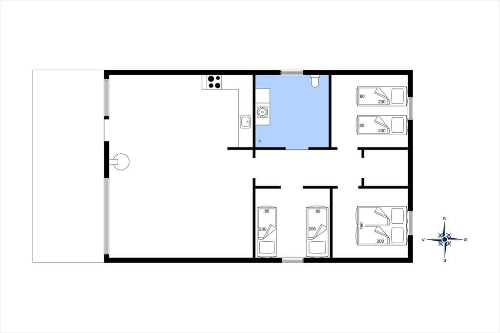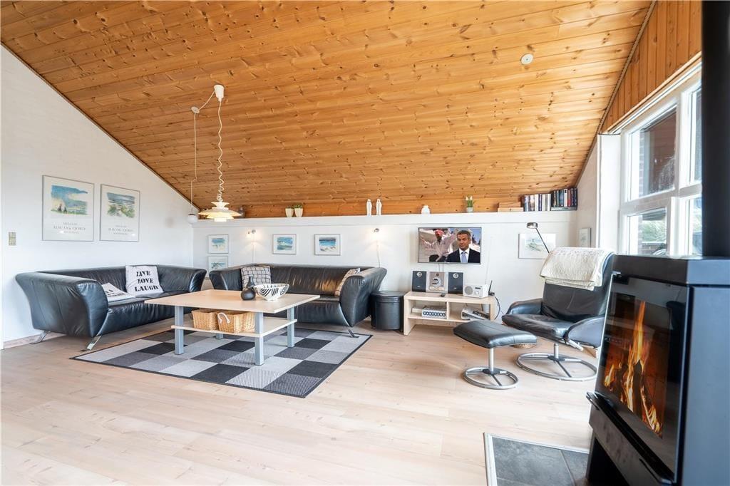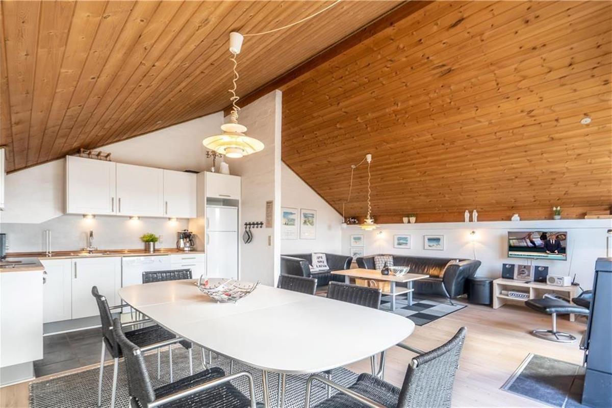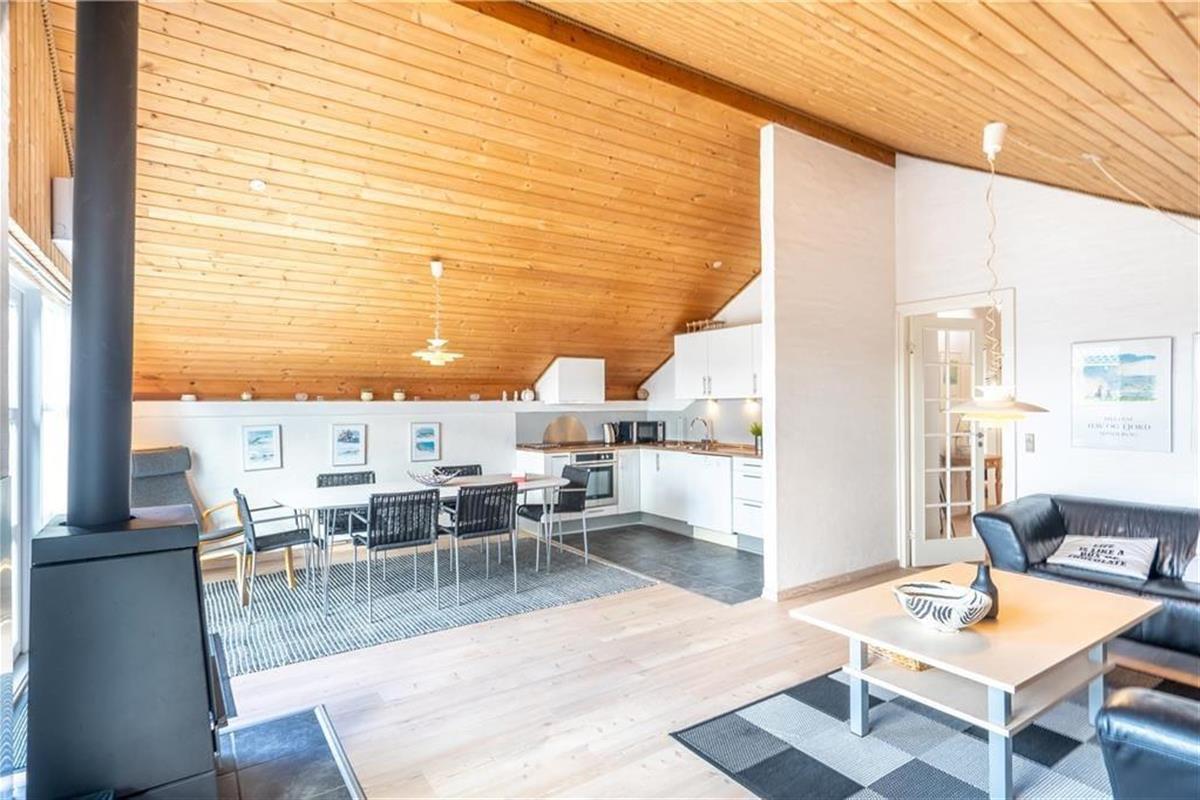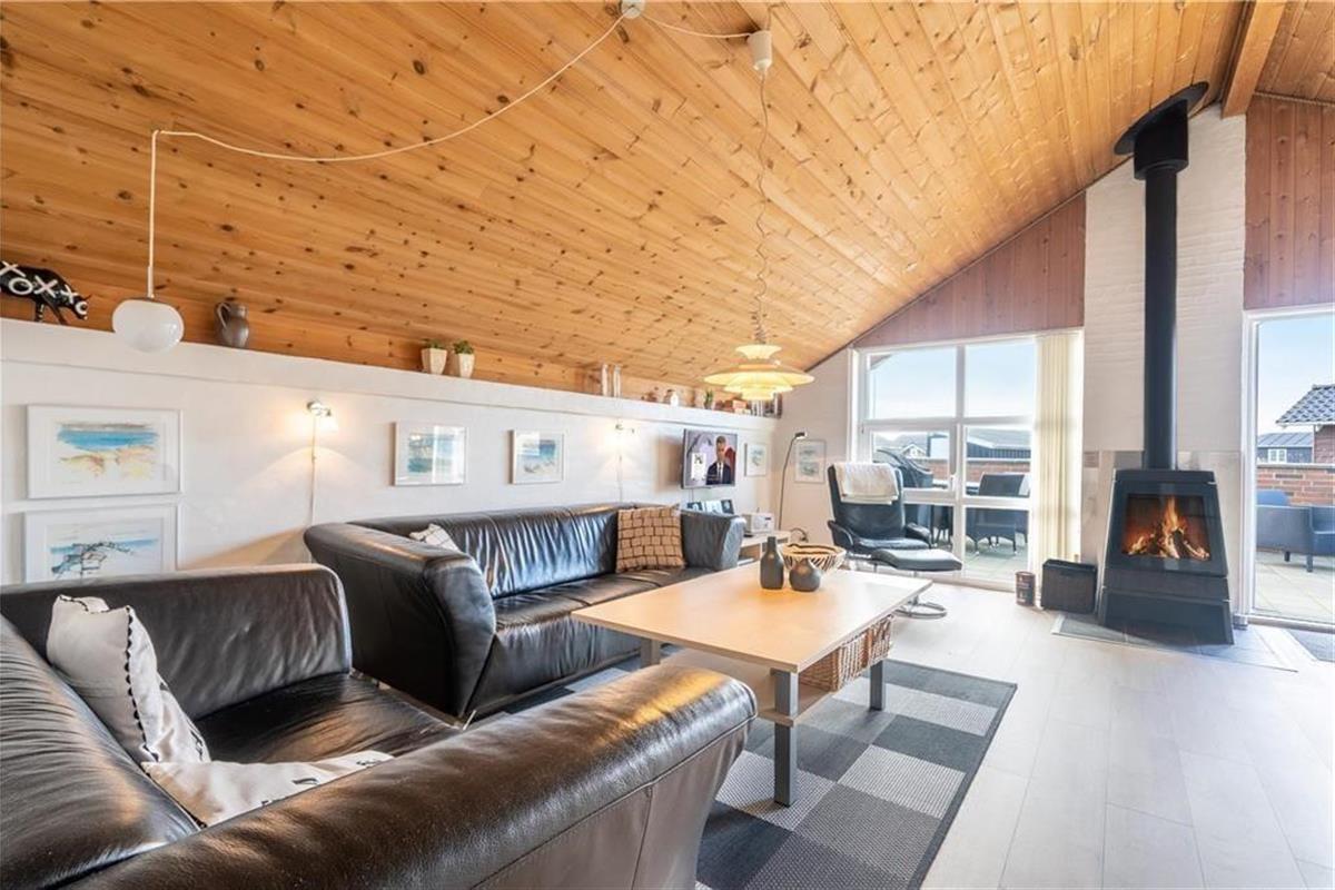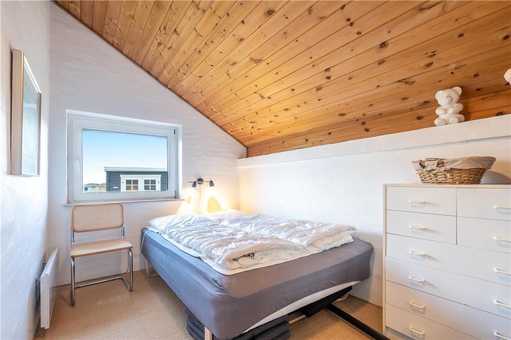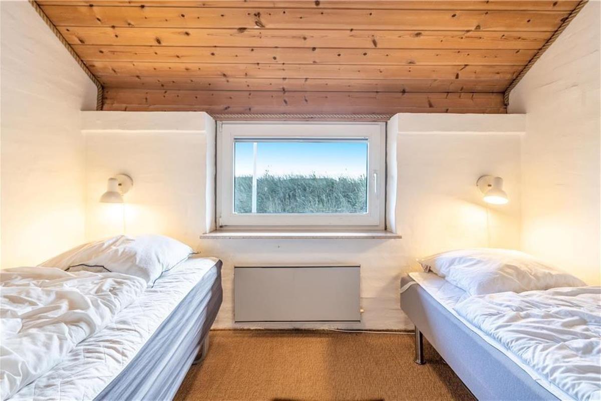 Das Herzstück des Hauses ist die große Wohnküche, die offen mit dem Wohnzimmer verbunden ist. Das Wohnzimmer ist geschmackvoll und einfach eingerichtet und lädt zum Entspannen ein: Hier steht ein schöner Holzofen mit großer Glasscheibe, damit Sie das Feuer bewundern können, während Sie an einem kalten Tag Wärme verbreiten. Vor den Fenstern steht ein guter Sessel, damit Sie es können Vertiefen Sie sich in ein gutes Buch oder lassen Sie einfach die Seele baumeln, während Sie auf das Dünennetz im Westen blicken. Wenn Sie unterhalten werden möchten, können Sie sowohl deutsche als auch dänische Kanäle auf dem Flachbildfernseher sehen oder das kostenlose WLAN nutzen. Das Ferienhaus hat auch eine neue und leckere Sauna und das Badezimmer ist gut ausgestattet mit Dusche und Waschmaschine. Es gibt 3 gute Zimmer - eines mit Doppelbett, das andere mit 2 Einzelbetten - die zu einem Doppelbett zusammengestellt werden können und das dritte Zimmer hat zwei Einzelbetten.