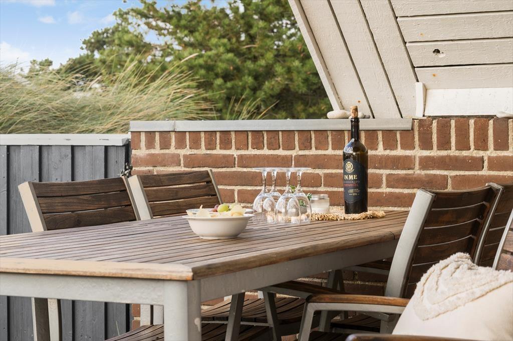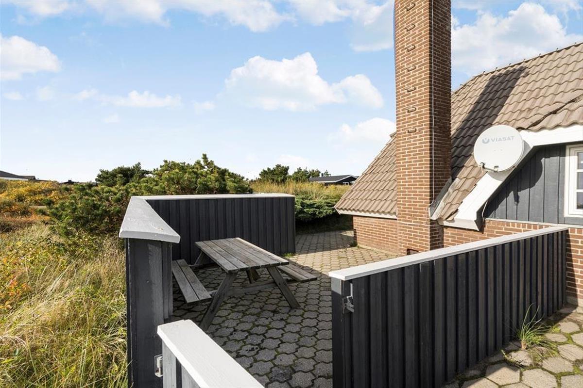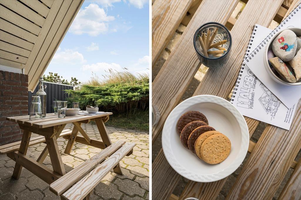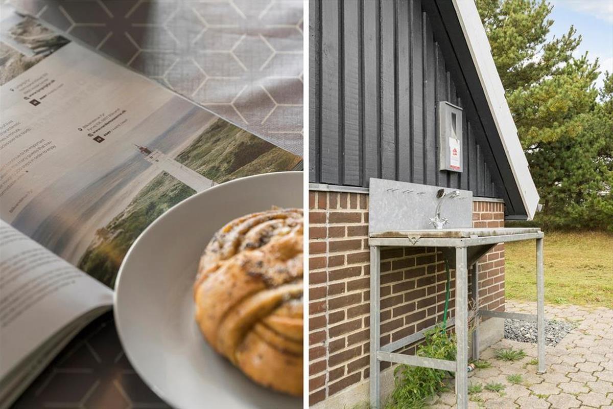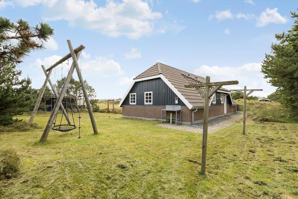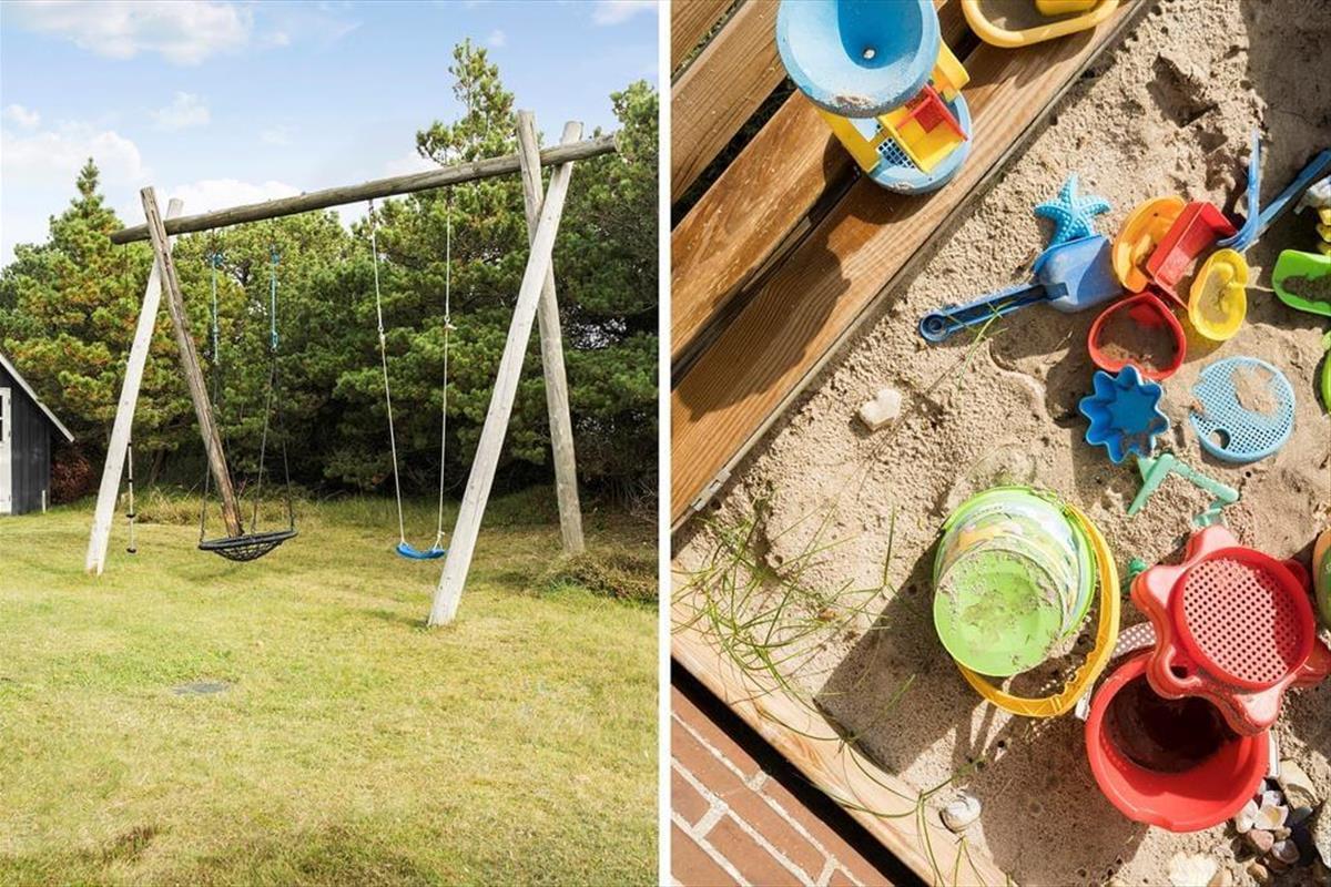 An der Süd- und Westseite des Ferienhauses befindet sich eine schöne Terrasse. Sie ist teilweise überdacht, gefliest und wird durch einen Holzzaun und eine kleine Böschung abgeschirmt. Außerdem gibt es viel Platz zum Toben auf der Rasenfläche des Naturgrundstücks, die wunderschön von Bäumen und Dünenvegetation eingerahmt wird. Für Kinder sind eine Schaukel und einen Sandkasten vorhanden. Angler werden sich freuen, dass es einen Fischreinigungsplatz im Freien und eine 100-Liter-Tiefkühltruhe im Ferienhaus gibt.