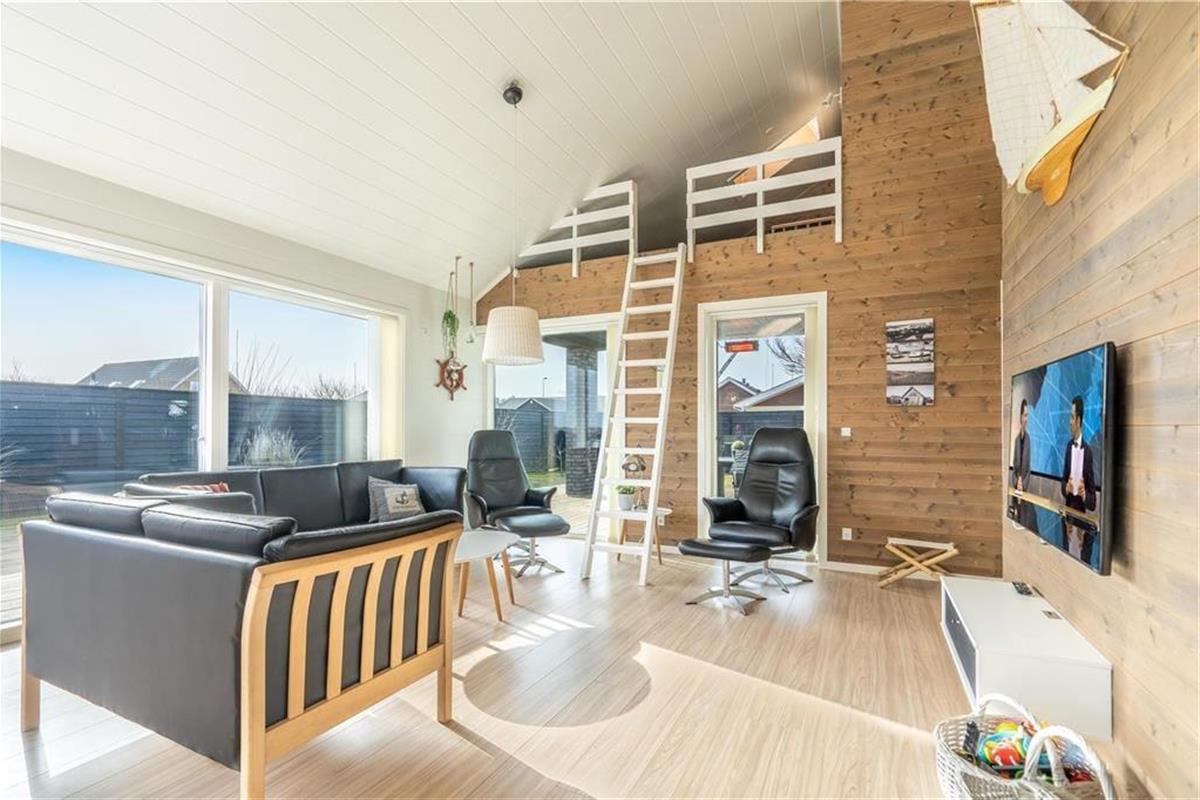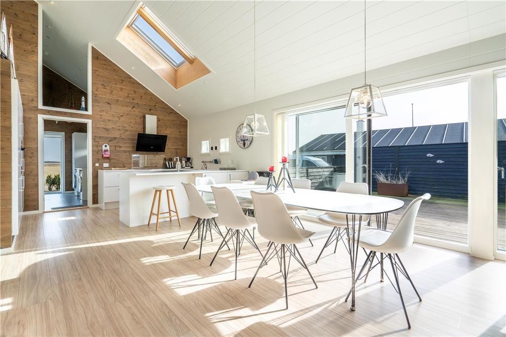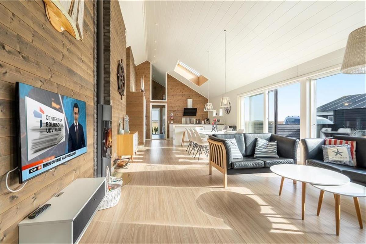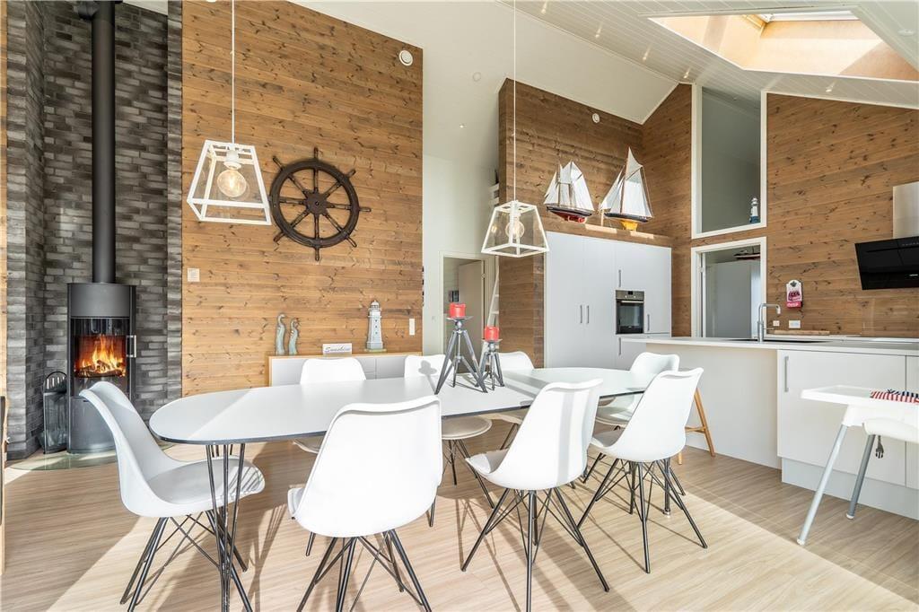 Das 2017 neu erbaute und durchweg aus qualitativ hochwertigen Materialien errichtete Ferienhaus besticht sowohl innen als auch außen durch seine geschmackvolle Gestaltung.Das Herzstück dieses prachtvollen Hauses bildet der offen miteinander kombinierte Wohn- und Küchenbereich. Die hellen Holzwände und die hohen und ebenfalls hellen Holzdecken, lassen den Wohnbereich wunderbar freundlich und luftig wirken. Die tolle, sehr gut ausgestattete Küche verfügt über sämtliche modernen Hilfsmittel wie beispielsweise einen Geschirrspüler und ist gut ausgestattet, so dass das Kochen einfach wird. Im Wohnzimmer können Sie es sich vor dem Holzofen gemütlich machen und das Flammenspiel hinter der Glasscheibe genießen. Ein großer Flachbildfernseher mit Satellitenschüssel sorgt für Unterhaltung und auch an einem windigen Tag ist ein gutes Buch in den bequemen Ledermöbeln schön. Hinzu gesellen sich der moderne Essplatz und ein kleiner Tresenbereich, der sich hervorragend für Arbeiten am Laptop oder dergleichen eignet. Die großen Fenster gewährleisten nicht nur einen wunderbaren Lichteinfall, sondern bieten Ihnen auch einen fantastischen Ausblick über die hügelige Umgebung und die Dünen. Ihnen stehen in diesem herrlichen Haus zwei komplette Bäder mit Dusche, WC und Fliesenboden mit Fußbodenheizung zur Verfügung. Eines der Bäder versprüht mit seinem Whirlpool und der Sauna einen Hauch von Luxus und verspricht entspannte Stunden nach einem langen Urlaubstag. Das 130 m2 große, stilvolle Backsteingebäude kann problemlos acht Erwachsene und zwei Kinder beherbergen, da es vier große Schlafzimmer und einen großen Schlafboden gibt. Neben dem Kamin sorgt auch eine energiesparende Wärmepumpe für ein behagliches Wohnklima. Im Hauswirtschaftsbereich steht Ihnen eine Waschmaschine zur Verfügung.Damit Sie auch im Urlaub auf dem Laufenden bleiben, erwartet Sie im Ferienhaus kostenloses WLAN.