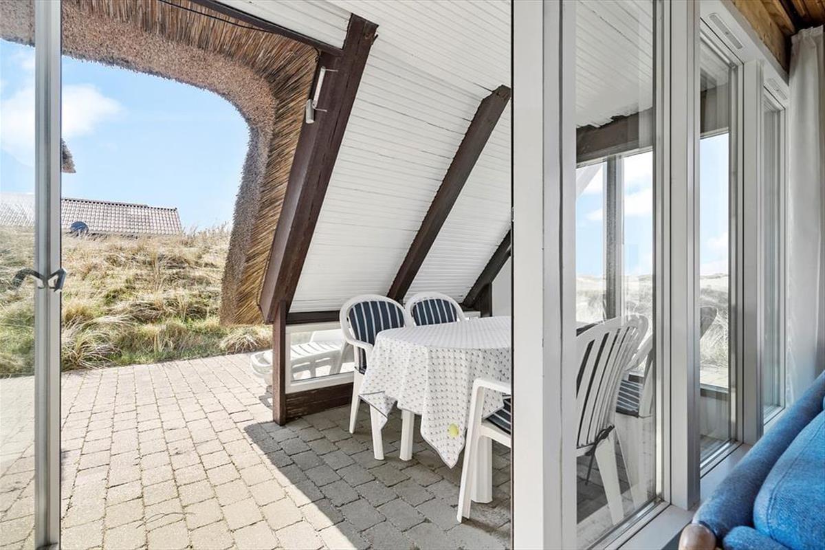Die Dünen und das Meer bilden einen wunderschönen Hintergrund für entspannte Stunden auf den Terrassen, die sich an die West- und die Südseite des Ferienhauses schmiegen. Selbst der überdachte Terrassenteil verwöhnt mit seiner verglasten Panoramafront, die Ihnen selbst bei stärkerem Westwind den Aufenthalt im Freien ermöglicht und zugleich einen Ausblick auf die Naturidylle eröffnet. Auf dem Terrassenareal an der Ostseite des Hauses genießen Sie die Morgensonne. Beachten Sie bitte, dass aufgrund der mit einem Reetdach verbundenen Brandgefahr kein Grill vorhanden ist.