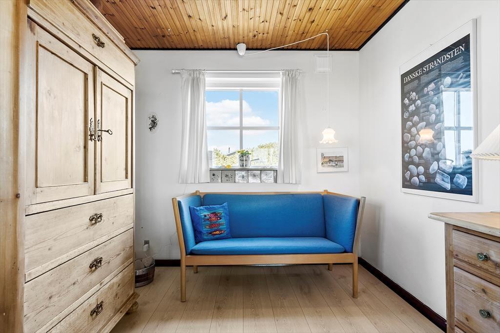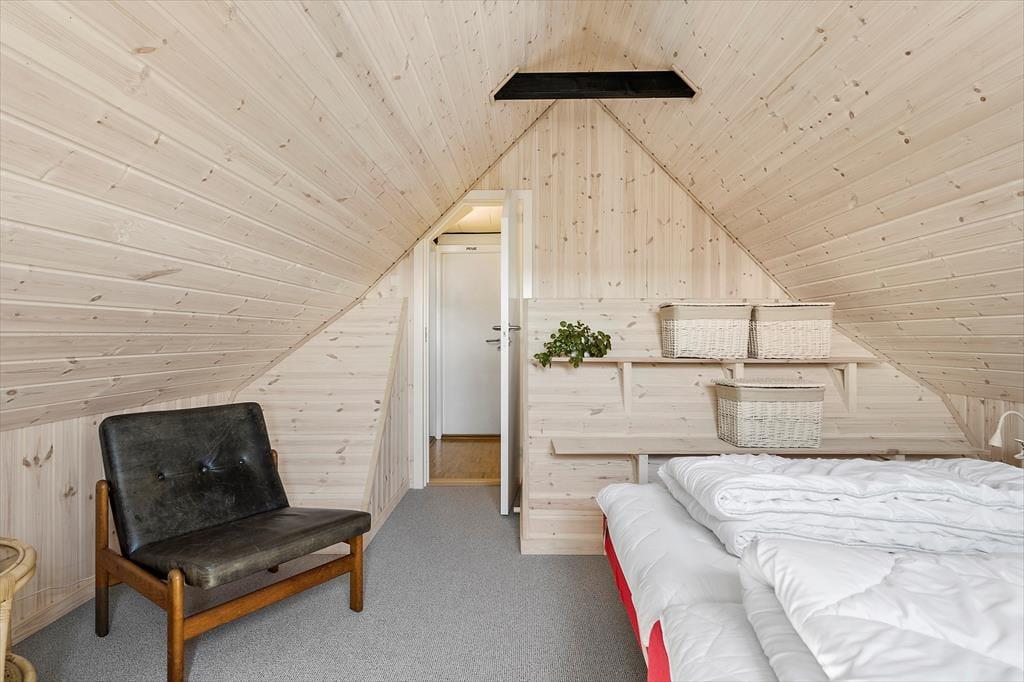 Zwei der drei Schlafzimmer dieses 101 m² großen, zweigeschossigen Ferienhauses sind im Obergeschoss platziert. Insgesamt beinhaltet das Mietobjekt sechs Schlafplätze. Der Wohnraum bietet ausreichend Platz, um es sich mit allen Mitreisenden rund um den Esstisch oder in der Polstersitzgruppe gemütlich zu machen. Ein Kaminofen sorgt für viel Ferienhausatmosphäre. Aufgrund der reizvollen Aussicht auf die schöne Küstenlandschaft werden Sie den Fernseher sicherlich nicht all zu häufig nutzen. Selbst während Sie in der Küche die Mahlzeiten zubereiten, blicken Sie auf die Dünen. Das Badezimmer mit Dusche und Fußbodenheizung präsentiert sich ansprechend und einfach eingerichtet.