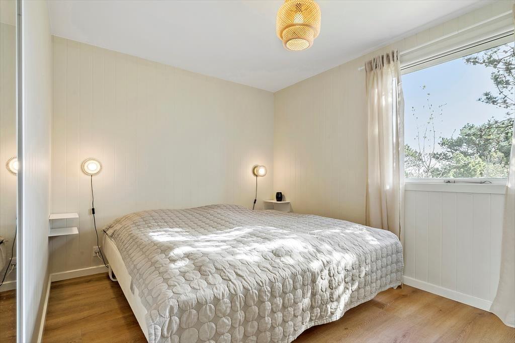 Dieses einladende Ferienhaus im südlichen Bereich Søndervigs befindet sich auf einem idyllischen Grundstück, das von Bäumen und üppigem Bewuchs umgeben ist. Auf der Terrasse und im Garten mit einer Sandkiste und einem Fußballtor halten Sie sich komplett ungestört auf. Mit fünf Schlafplätzen eignet sich das Mietobjekt sehr gut für Familien mit Kindern. Zu Fuß spazieren Sie durch schöne Natur an den rund 750 Meter entfernten Nordseestrand.