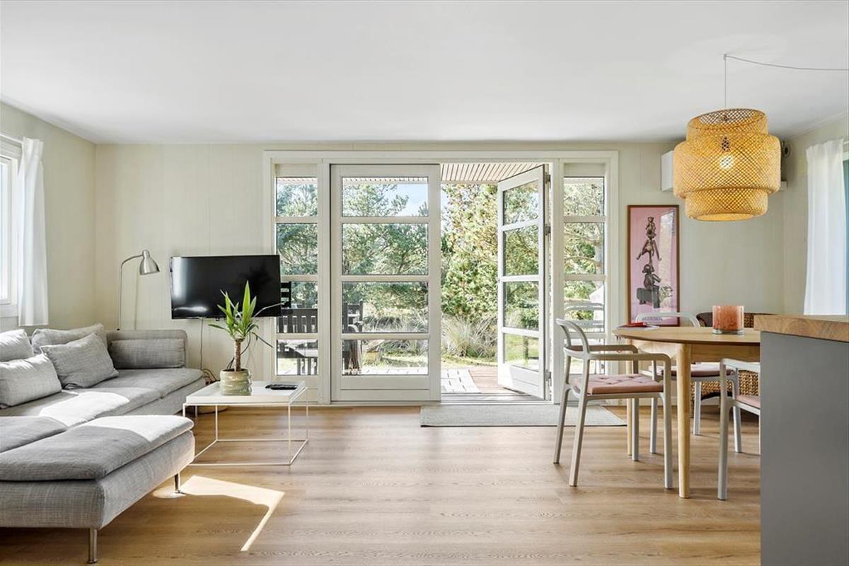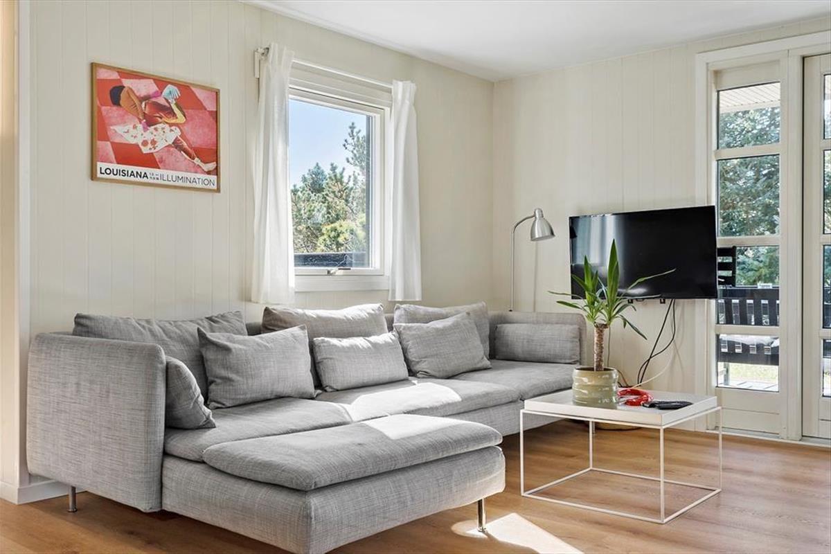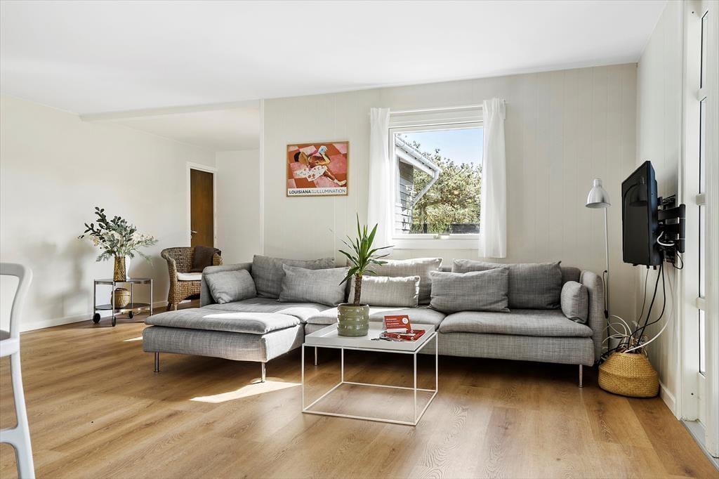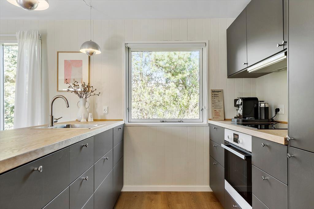 Mit seinem hellen, einladenden Inneren bietet dieses Mietobjekt viel klassischen Ferienhauscharme. Die drei Schlafzimmer verfügen über insgesamt fünf Schlafplätze. Das Badezimmer präsentiert sich richtig schön und modern eingerichtet mit einer Duschnische und einem an der Wand hängenden WC. Im Eingangsbereich können Sie Ihre Schuhe und Jacken aufbewahren. Der Rest der Wohnfläche ist dem Aufenthaltsbereich überlassen, der sich aus der offenen Küche und dem Wohnraum zusammensetzt. Die Küche ist, wie der gesamte Raum, in hellen Farbtönen gehalten. Große Fensterpartien gewähren einen schönen Tageslichteinfall und einen Ausblick aufs üppige Grün. Die Essenszubereitung wird in der gut eingerichteten Küche zum Vergnügen. Die Mahlzeiten servieren Sie anschließend am neben der Küche platzierten Esstisch. Während Sie sich auf dem Sofa entspannen, sorgen WiFi und ein Fernseher für Unterhaltung und Abwechslung. Für angenehme Temperaturen sorgen eine Wärmepumpe.