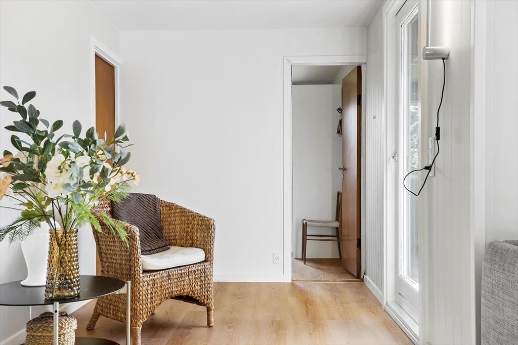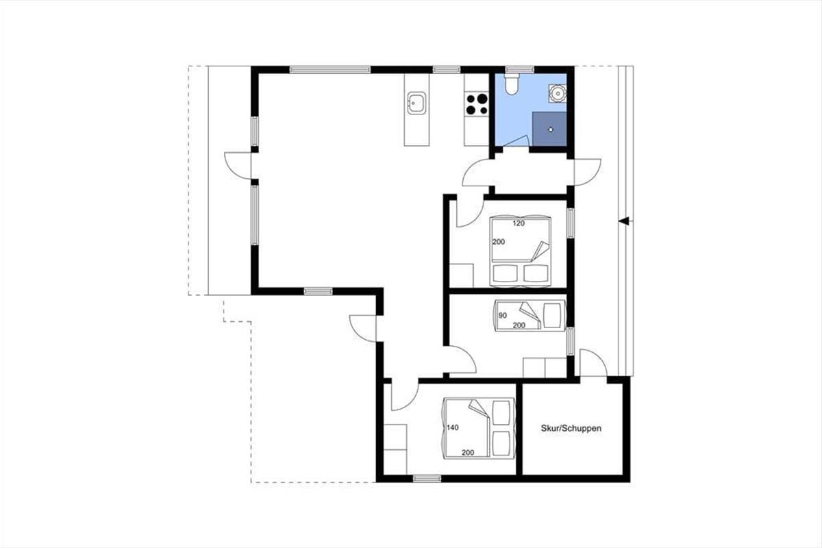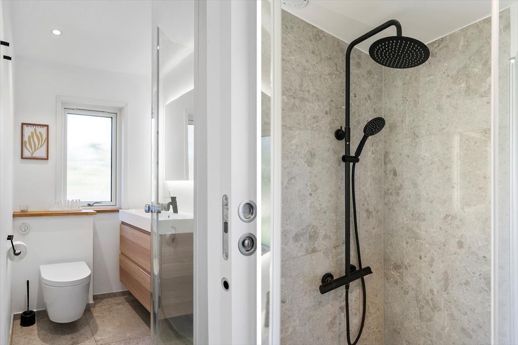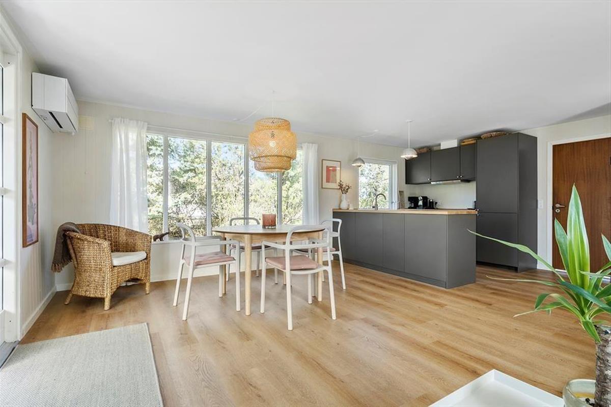 Mit seinem hellen, einladenden Inneren bietet dieses Mietobjekt viel klassischen Ferienhauscharme. Die drei Schlafzimmer verfügen über insgesamt fünf Schlafplätze. Das Badezimmer präsentiert sich richtig schön und modern eingerichtet mit einer Duschnische und einem an der Wand hängenden WC. Im Eingangsbereich können Sie Ihre Schuhe und Jacken aufbewahren. Der Rest der Wohnfläche ist dem Aufenthaltsbereich überlassen, der sich aus der offenen Küche und dem Wohnraum zusammensetzt. Die Küche ist, wie der gesamte Raum, in hellen Farbtönen gehalten. Große Fensterpartien gewähren einen schönen Tageslichteinfall und einen Ausblick aufs üppige Grün. Die Essenszubereitung wird in der gut eingerichteten Küche zum Vergnügen. Die Mahlzeiten servieren Sie anschließend am neben der Küche platzierten Esstisch. Während Sie sich auf dem Sofa entspannen, sorgen WiFi und ein Fernseher für Unterhaltung und Abwechslung. Für angenehme Temperaturen sorgen eine Wärmepumpe.