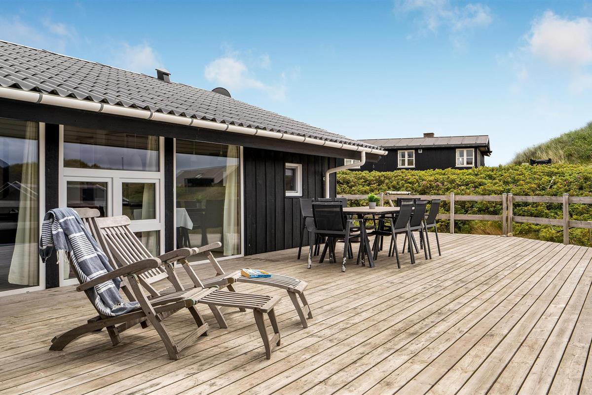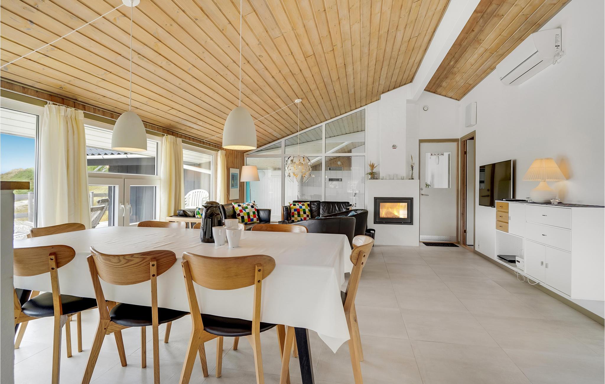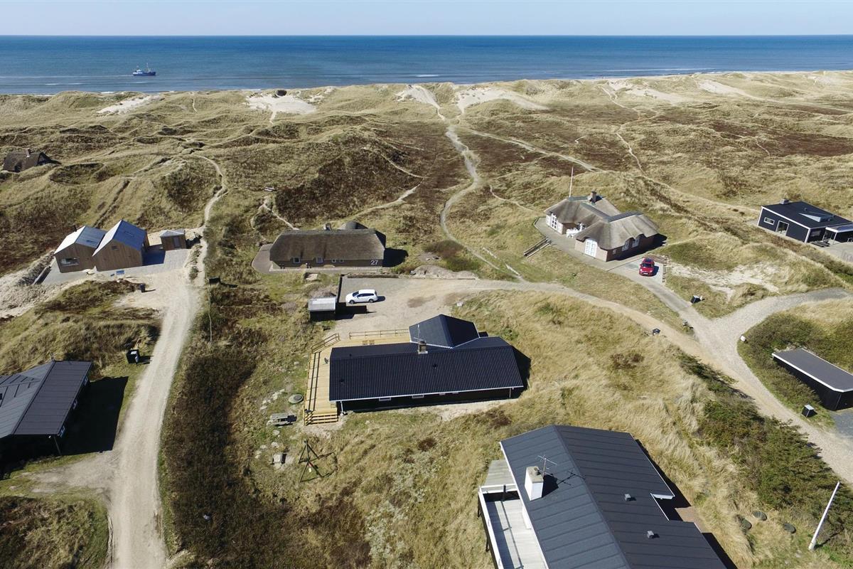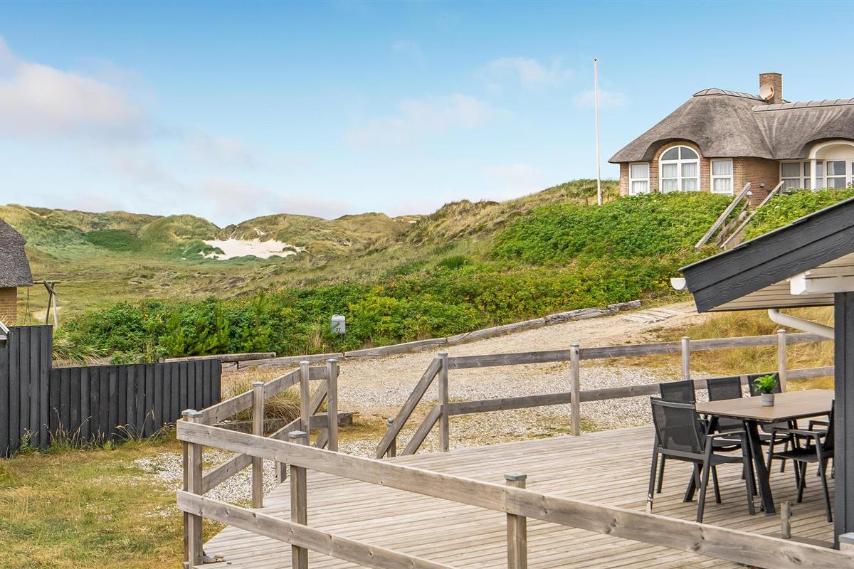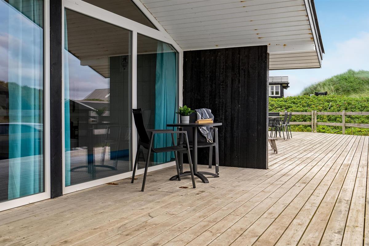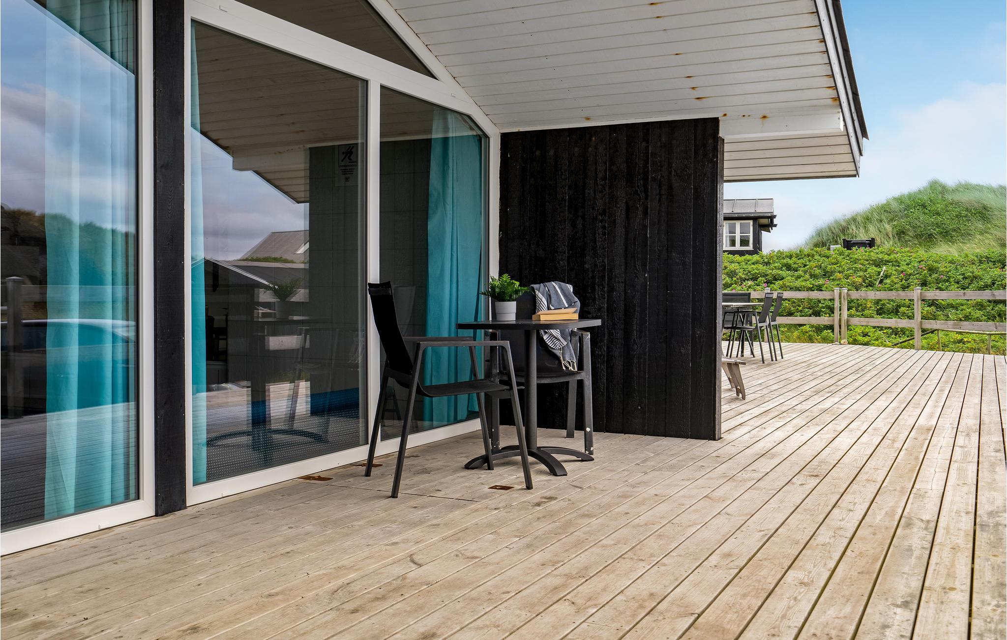 Dit vakantiehuis ligt aan de bebouwingslijn met uitzicht op het unieke duinlandschap. U loopt vanaf het huis over een eigen pad, ca. 200 m door de witte duinen, naar het strand richting zee. De blauwe lucht en de schuimende zee vormen een sprookjesachtige combinatie. Bij het huis hoort een groot terras, waar u kunt genieten van zonsondergangen en lange, heldere zomeravonden. U kunt hier ook spetteren in het grote zwembad of genieten van de onderwatermassage in de whirlpool. In het huis vindt u ook een gezellige houtkachel. Het huis is gerenoveerd en bevat warmtepompen voor het zwembadwater en de verwarming. In de woonkamer staat een grote flatscreen-tv, een Bluetooth-muzieksysteem met radio en cd. Hoewel openbare voorzieningen in de buurt zijn, kunt u hier genieten van een rustige en ontspannen vakantie. Er is uitzicht op zee vanaf een duin achter het huis. Het ligt niet ver van Søndervig als u iets wilt doen, zoals koffie drinken, bowlen, minigolf en tennis. Een golfbaan met 27 holes is vlakbij. Voor vissers zijn er hier veel mogelijkheden voor een goede vangst, in Put & Take meren of op het strand. Søndervig herbergt winkels met een goed assortiment en vermaak voor toeristen in de zomer. In Ringkøbing, het alom bekende 'gelukkige' stadje van Europa, staan in het centrum ongeveer 150 huizen uit 1820. Bezoek ook 'Strandgaarden', het museum over het leven van vissers en boeren in de jaren 1800, en het 'Vissershuis' in Hvide Sande. Daar vindt u de grootste sluis van Denemarken.