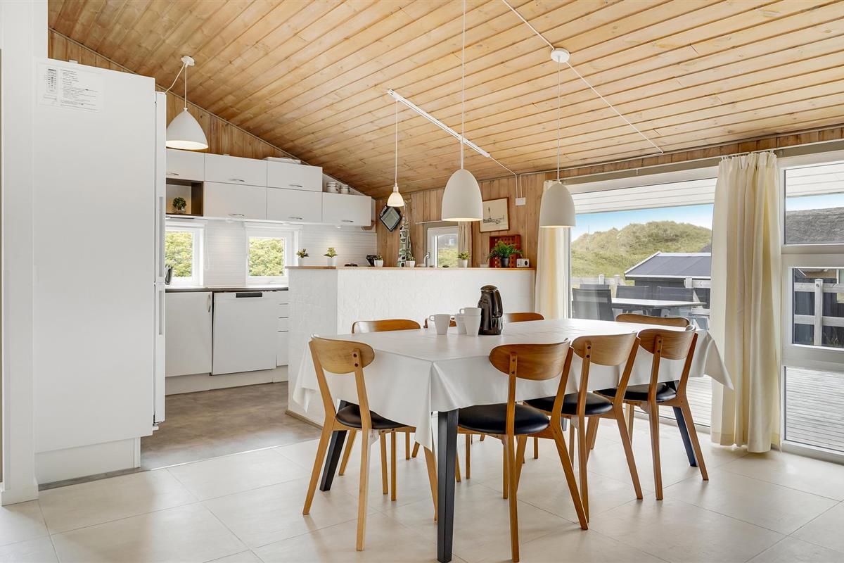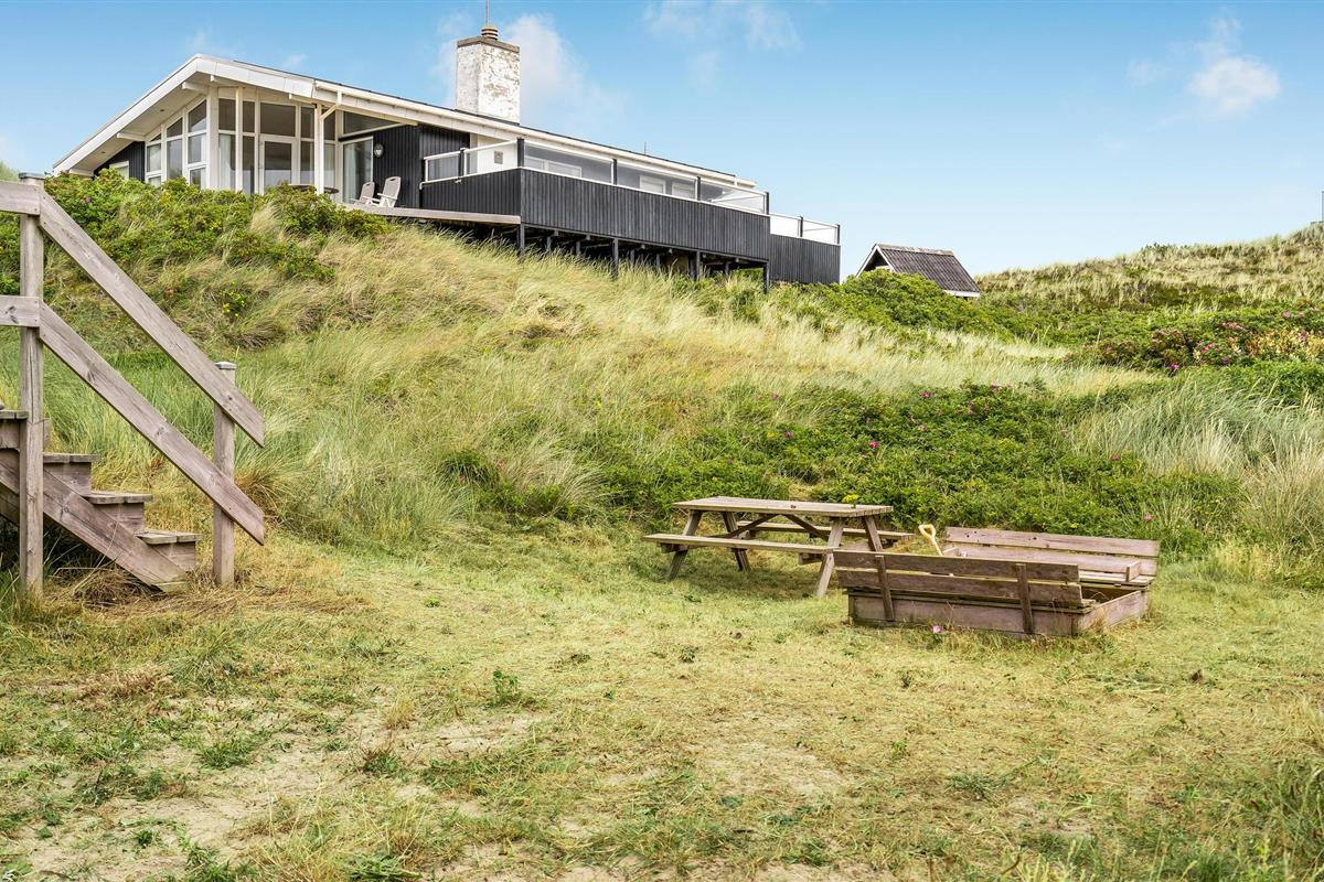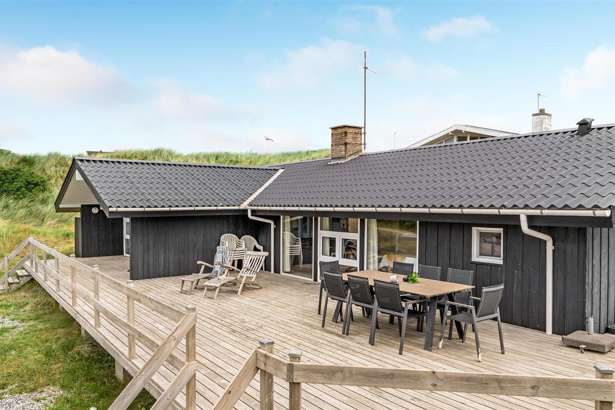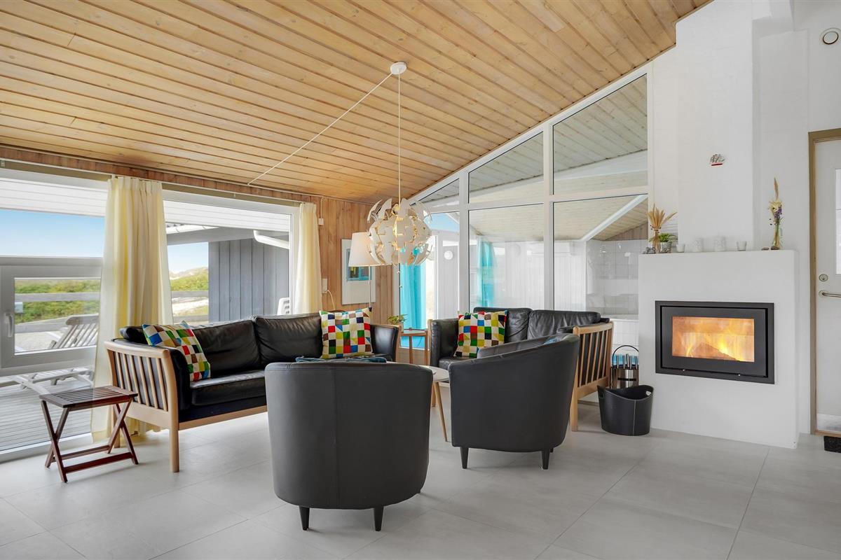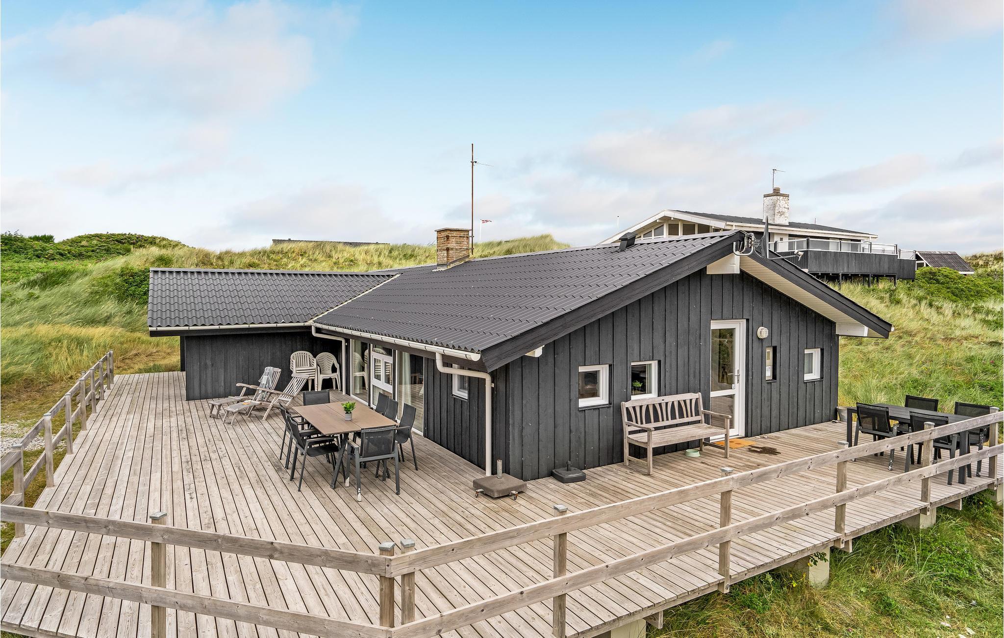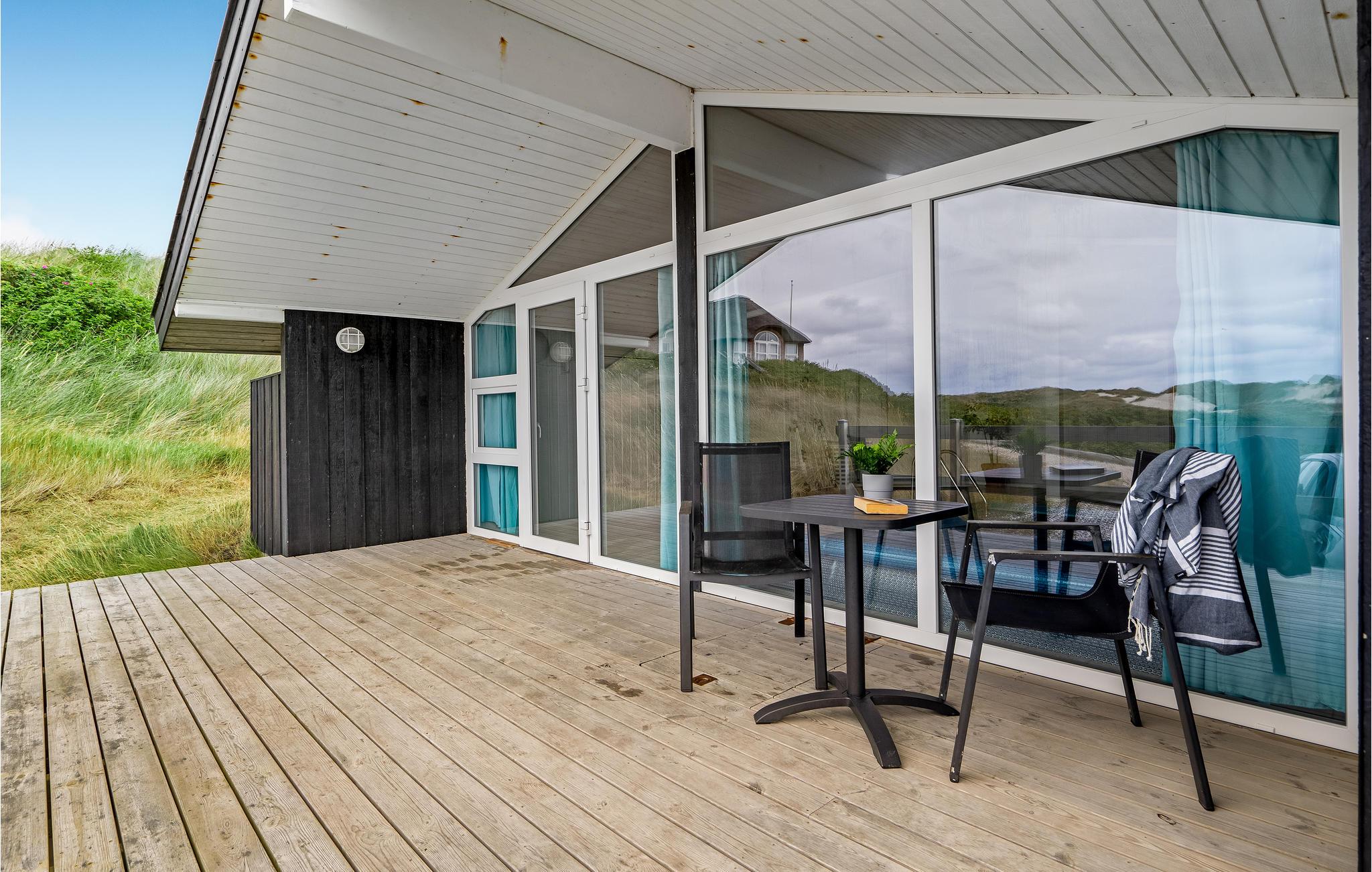 Dit vakantiehuis ligt aan de bebouwingslijn met uitzicht op het unieke duinlandschap. U loopt vanaf het huis over een eigen pad, ca. 200 m door de witte duinen, naar het strand richting zee. De blauwe lucht en de schuimende zee vormen een sprookjesachtige combinatie. Bij het huis hoort een groot terras, waar u kunt genieten van zonsondergangen en lange, heldere zomeravonden. U kunt hier ook spetteren in het grote zwembad of genieten van de onderwatermassage in de whirlpool. In het huis vindt u ook een gezellige houtkachel. Het huis is gerenoveerd en bevat warmtepompen voor het zwembadwater en de verwarming. In de woonkamer staat een grote flatscreen-tv, een Bluetooth-muzieksysteem met radio en cd. Hoewel openbare voorzieningen in de buurt zijn, kunt u hier genieten van een rustige en ontspannen vakantie. Er is uitzicht op zee vanaf een duin achter het huis. Het ligt niet ver van Søndervig als u iets wilt doen, zoals koffie drinken, bowlen, minigolf en tennis. Een golfbaan met 27 holes is vlakbij. Voor vissers zijn er hier veel mogelijkheden voor een goede vangst, in Put & Take meren of op het strand. Søndervig herbergt winkels met een goed assortiment en vermaak voor toeristen in de zomer. In Ringkøbing, het alom bekende 'gelukkige' stadje van Europa, staan in het centrum ongeveer 150 huizen uit 1820. Bezoek ook 'Strandgaarden', het museum over het leven van vissers en boeren in de jaren 1800, en het 'Vissershuis' in Hvide Sande. Daar vindt u de grootste sluis van Denemarken.