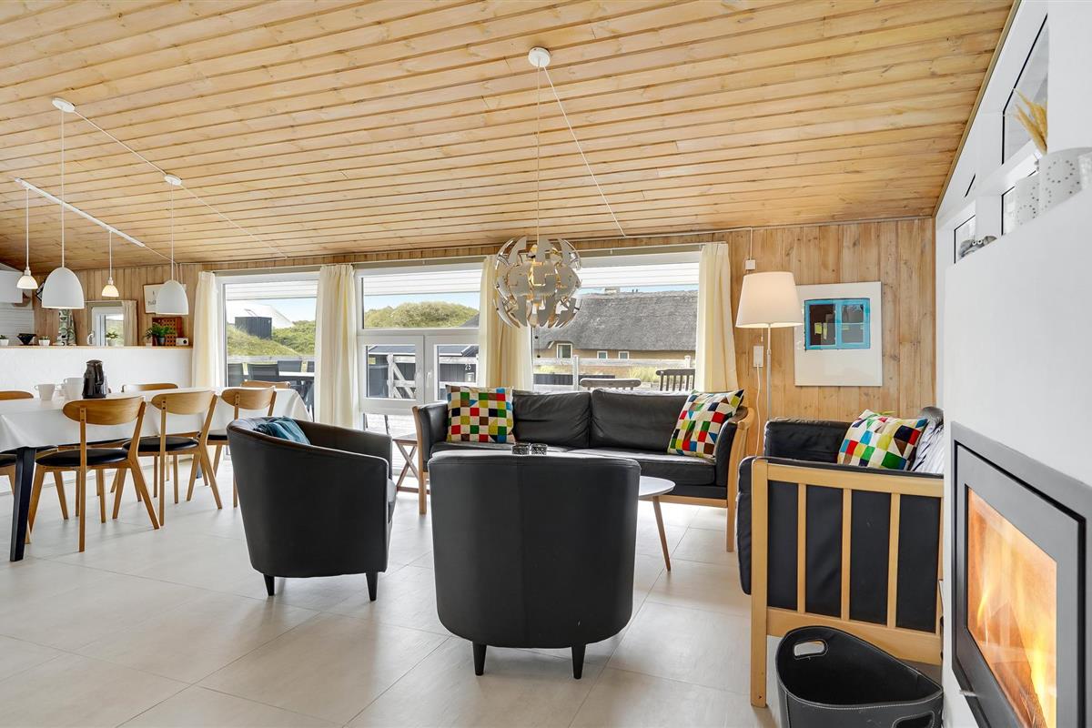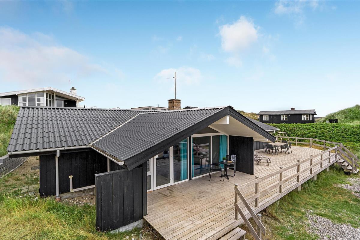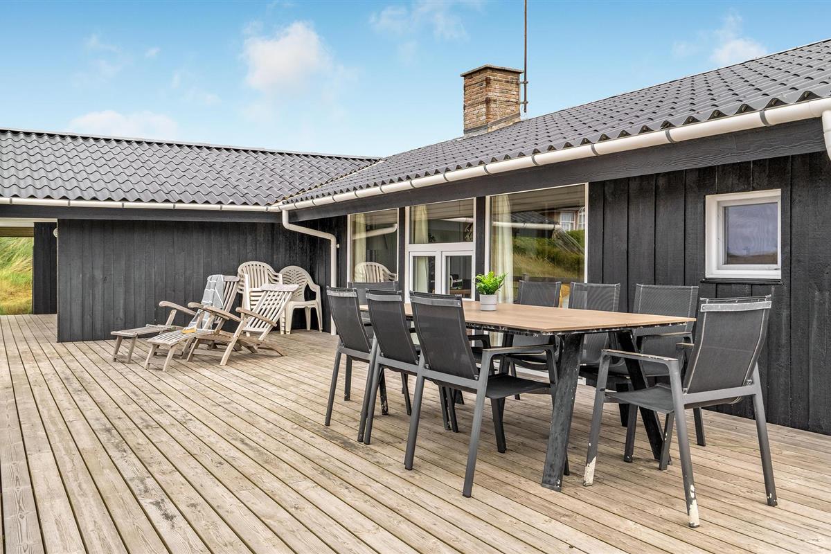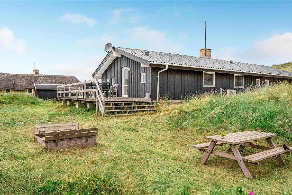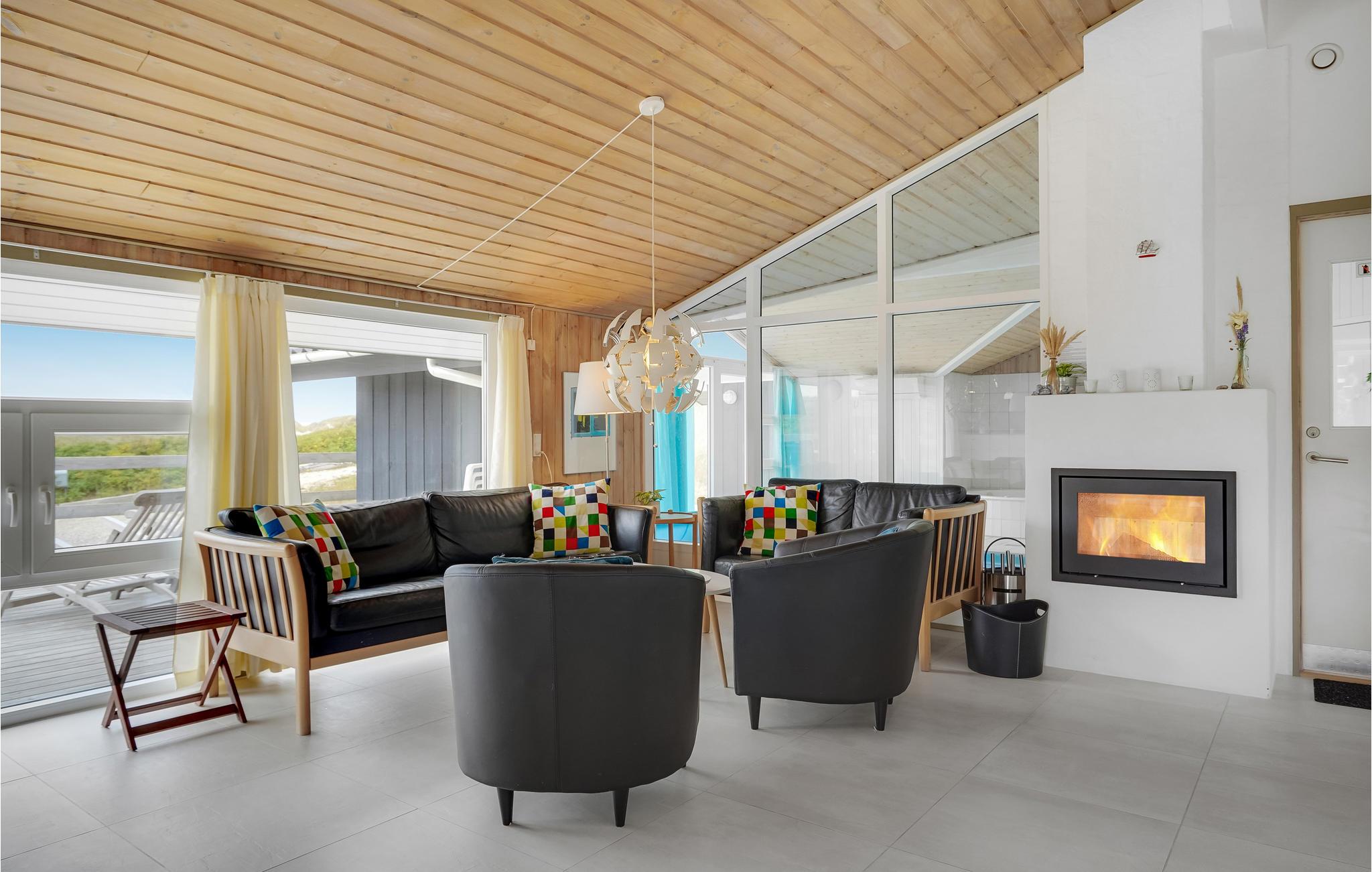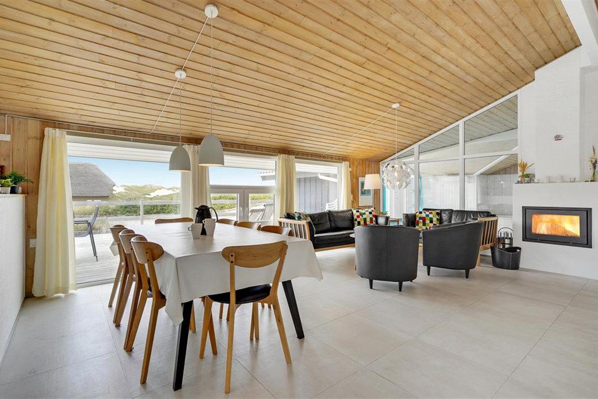 Dit vakantiehuis ligt aan de bebouwingslijn met uitzicht op het unieke duinlandschap. U loopt vanaf het huis over een eigen pad, ca. 200 m door de witte duinen, naar het strand richting zee. De blauwe lucht en de schuimende zee vormen een sprookjesachtige combinatie. Bij het huis hoort een groot terras, waar u kunt genieten van zonsondergangen en lange, heldere zomeravonden. U kunt hier ook spetteren in het grote zwembad of genieten van de onderwatermassage in de whirlpool. In het huis vindt u ook een gezellige houtkachel. Het huis is gerenoveerd en bevat warmtepompen voor het zwembadwater en de verwarming. In de woonkamer staat een grote flatscreen-tv, een Bluetooth-muzieksysteem met radio en cd. Hoewel openbare voorzieningen in de buurt zijn, kunt u hier genieten van een rustige en ontspannen vakantie. Er is uitzicht op zee vanaf een duin achter het huis. Het ligt niet ver van Søndervig als u iets wilt doen, zoals koffie drinken, bowlen, minigolf en tennis. Een golfbaan met 27 holes is vlakbij. Voor vissers zijn er hier veel mogelijkheden voor een goede vangst, in Put & Take meren of op het strand. Søndervig herbergt winkels met een goed assortiment en vermaak voor toeristen in de zomer. In Ringkøbing, het alom bekende 'gelukkige' stadje van Europa, staan in het centrum ongeveer 150 huizen uit 1820. Bezoek ook 'Strandgaarden', het museum over het leven van vissers en boeren in de jaren 1800, en het 'Vissershuis' in Hvide Sande. Daar vindt u de grootste sluis van Denemarken.