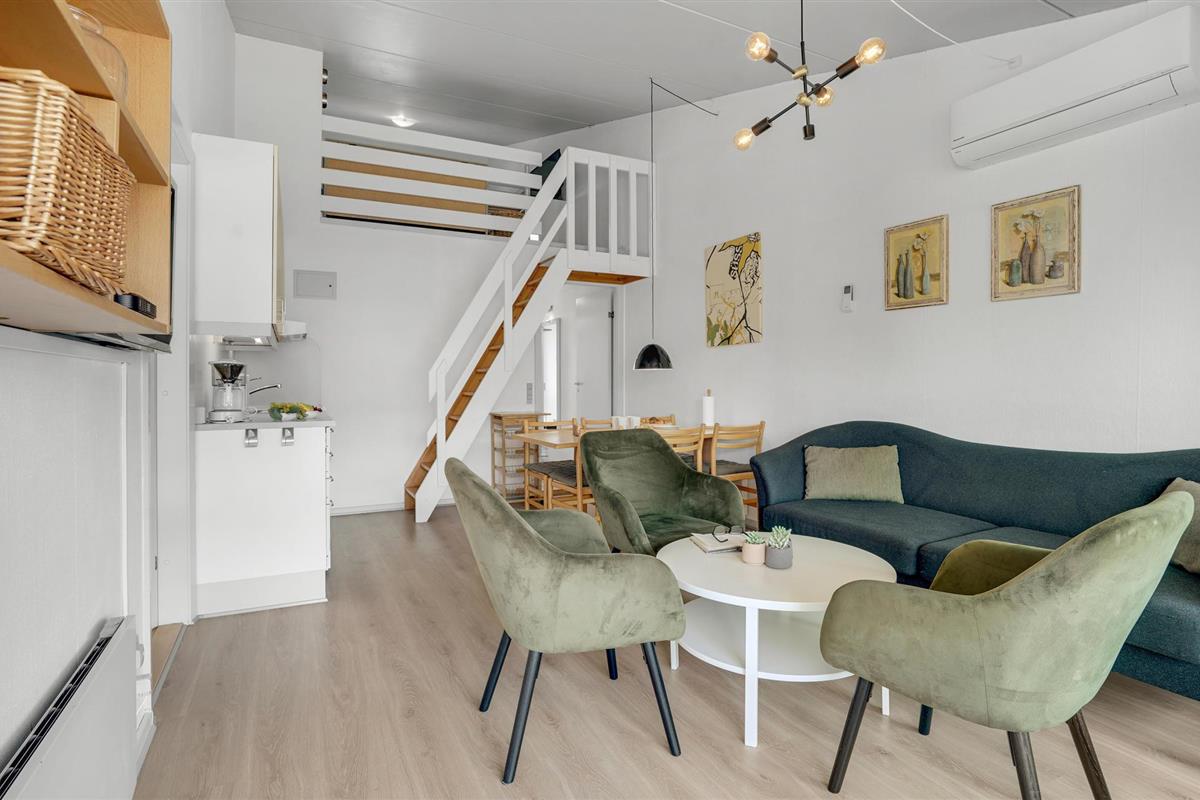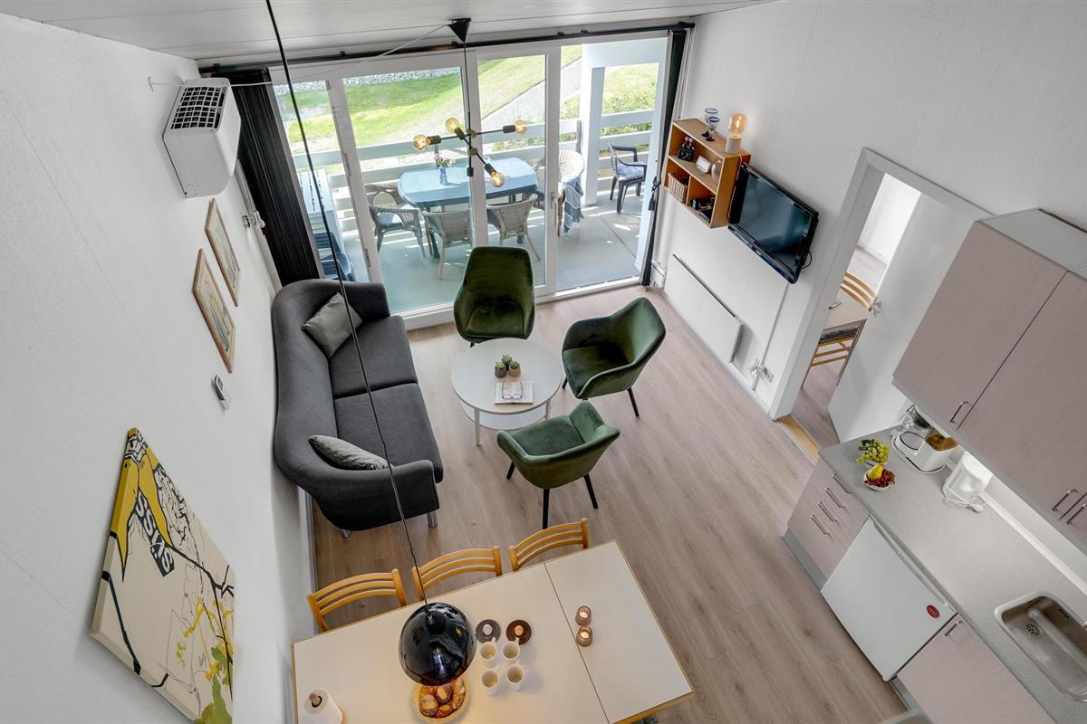 De flat is modern en elegant ingericht en heeft een gecombineerde woonkamer en keuken. Vanaf hier heeft u toegang tot het overdekte balkon. Op twee niveaus kunt u ontspannen en de gastvrije sfeer van de accommodatie ervaren en genieten van tijd samen spelen en ontspannen.