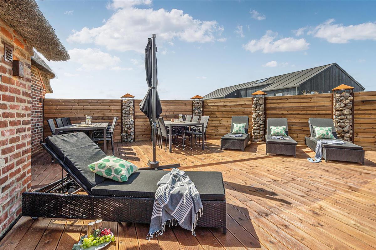 Bij mooi weer heb je vanuit de grote keuken direct toegang tot het prachtige houten terras van het vakantiehuis. Hier kun je je maaltijd bereiden op de barbecue en er vervolgens van genieten met uitzicht op het duinlandschap.
