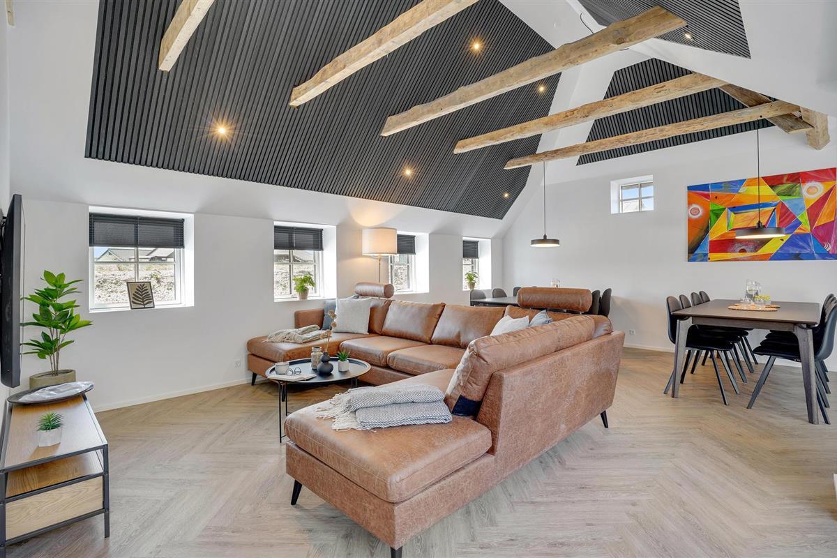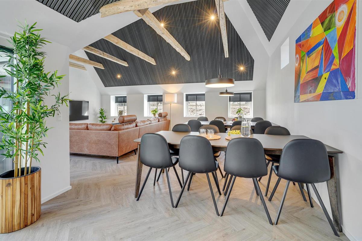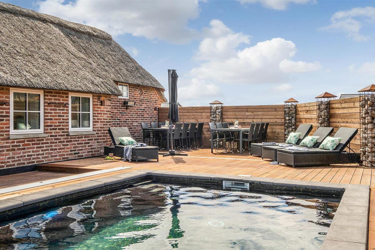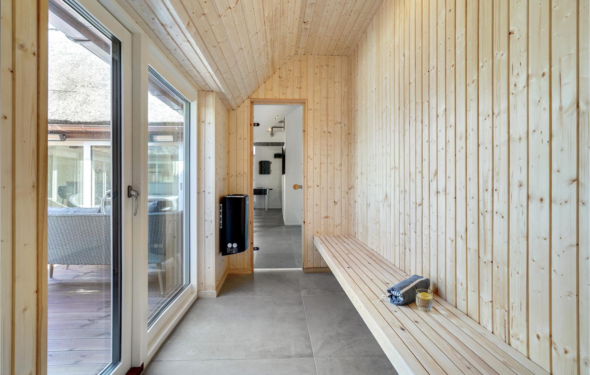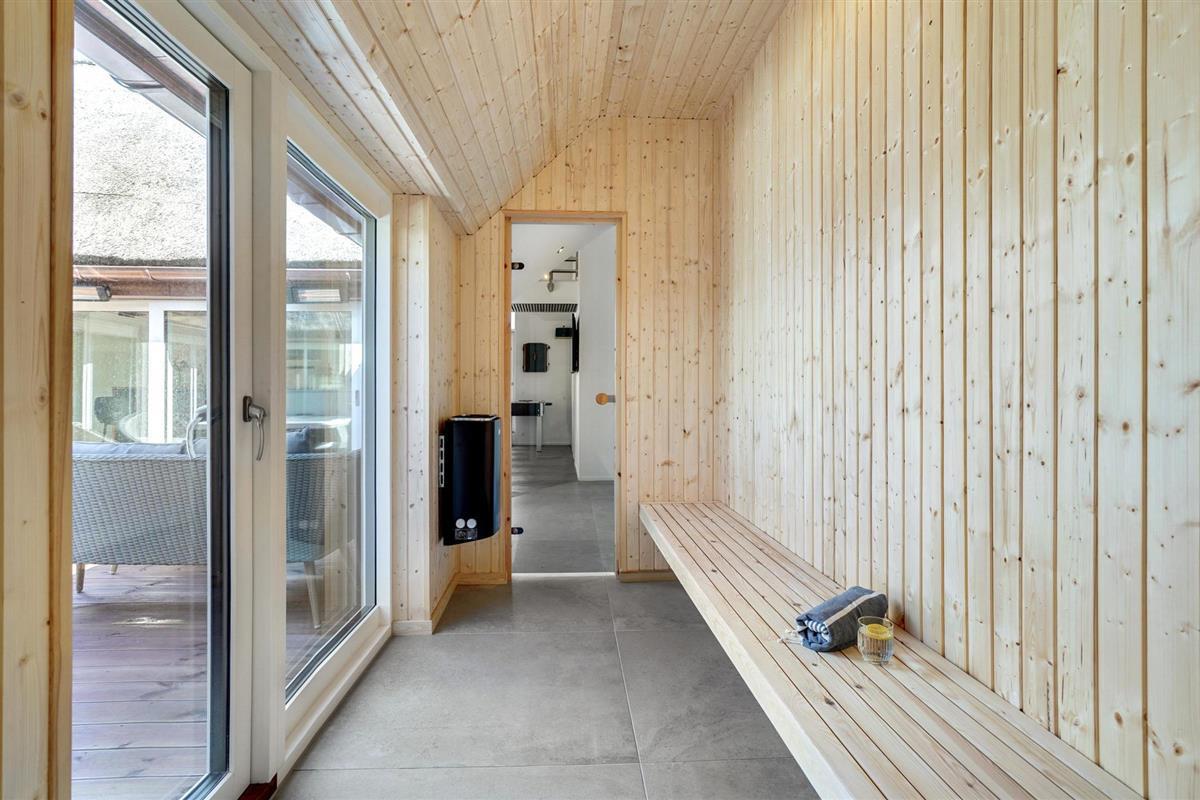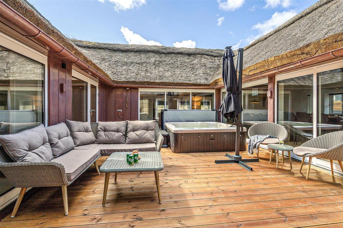 De wellnesservaring gaat verder in het midden van het huis, waar je een atriumbinnenplaats vindt met een houten terras. Hier bevindt zich de buitenspa van het vakantiehuis naast het loungemeubilair, waar je gezellige uurtjes kunt doorbrengen. Vanaf hier is er directe toegang tot de tweede sauna van het vakantiehuis. Een wellnessavond in huis ligt hier dus voor de hand!