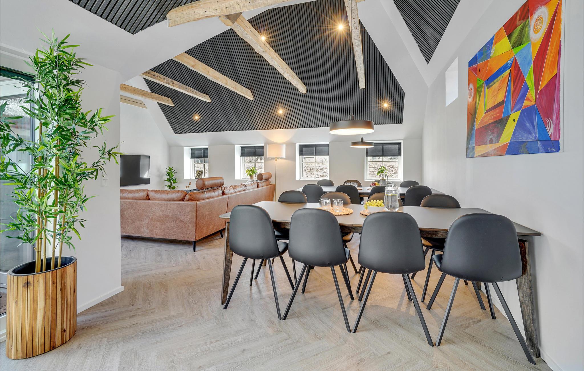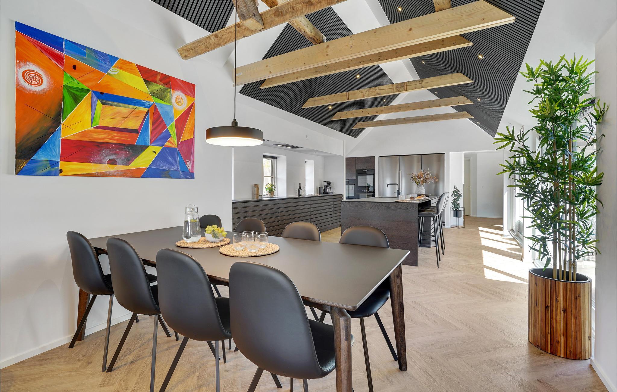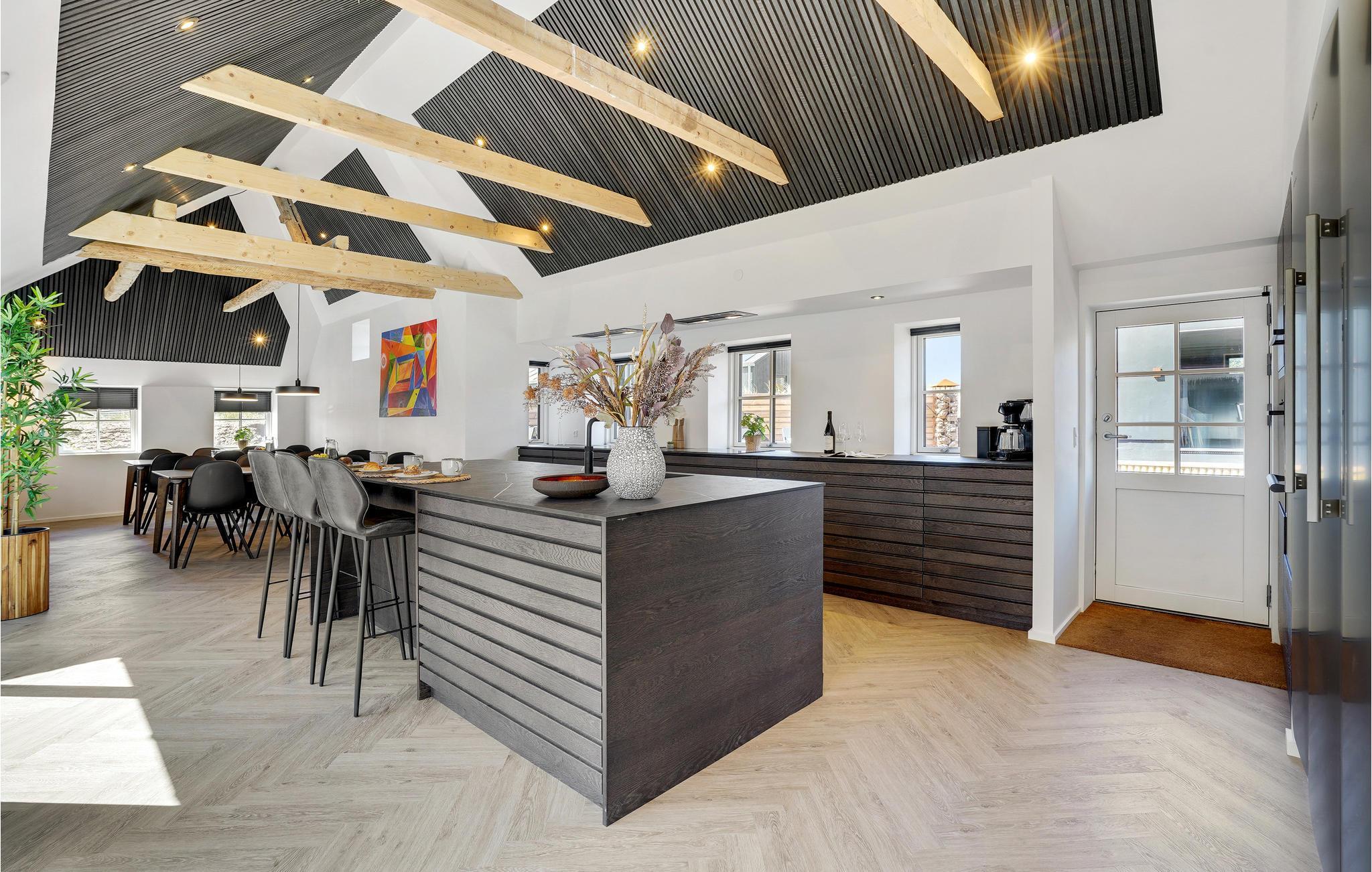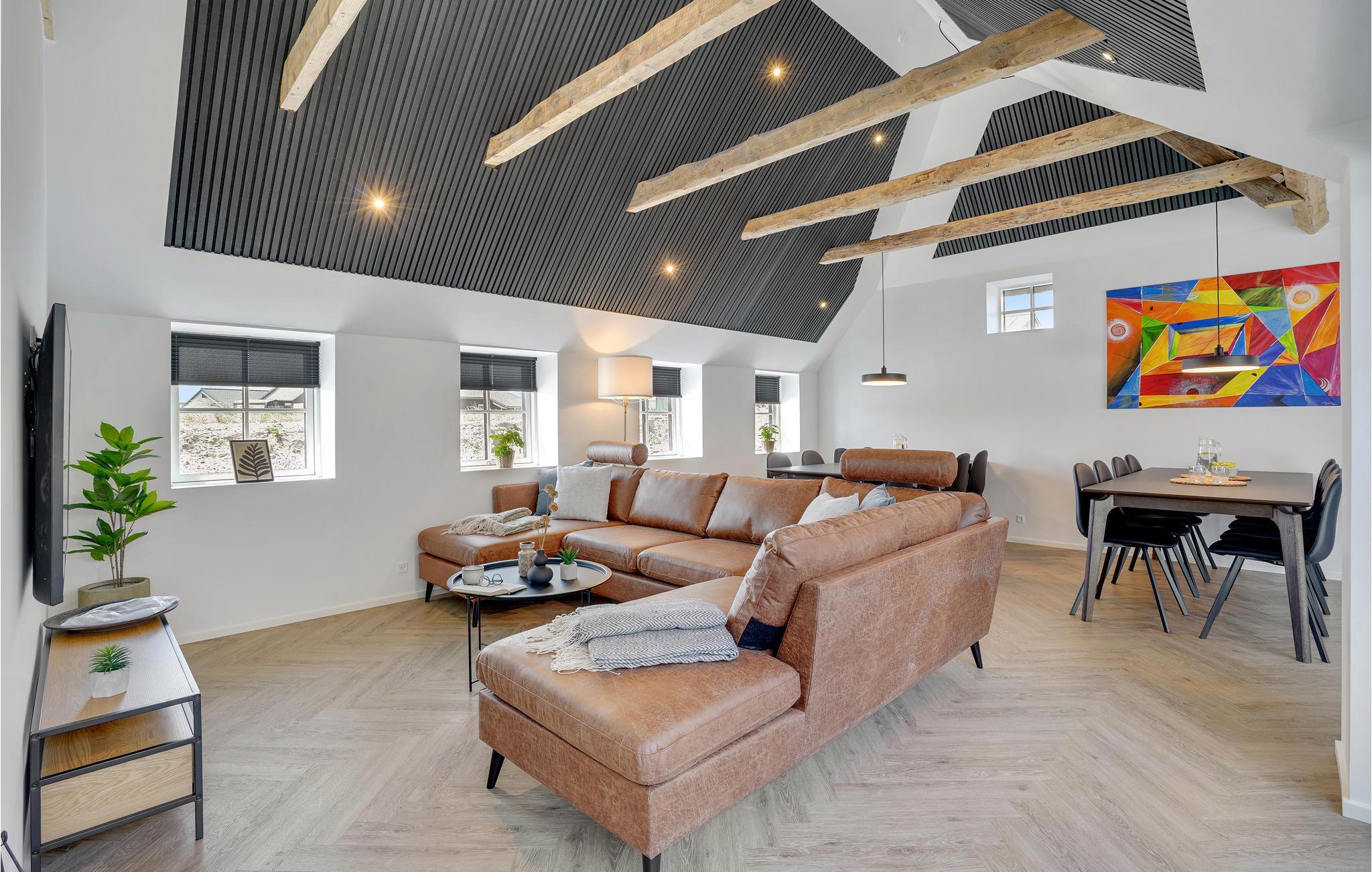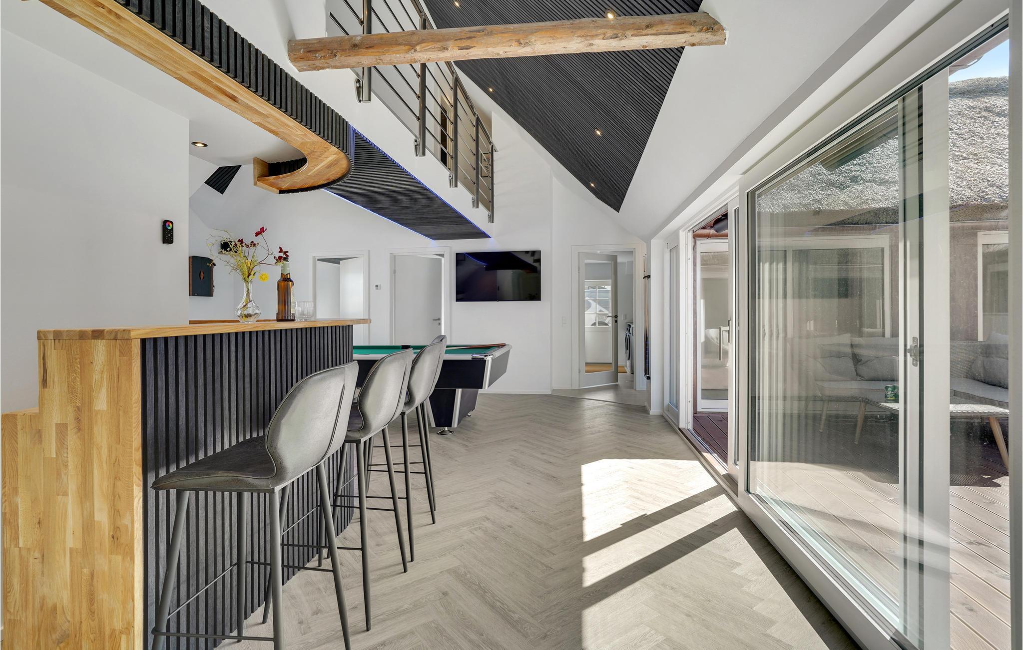 Het middelpunt van het luxe huis is de grote keukenruimte, waar de keuken en het woongedeelte zijn gecombineerd tot één grote, lichte ruimte. In de goed uitgeruste keuken is er genoeg ruimte om te koken en de mogelijkheid om met de hele bende te dineren aan de lange eettafel. Er is ook een comfortabele bank in de kamer waar je kunt ontspannen en genieten van een film, een spelletje of iets anders.