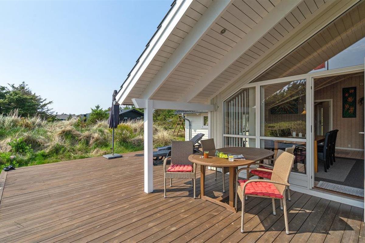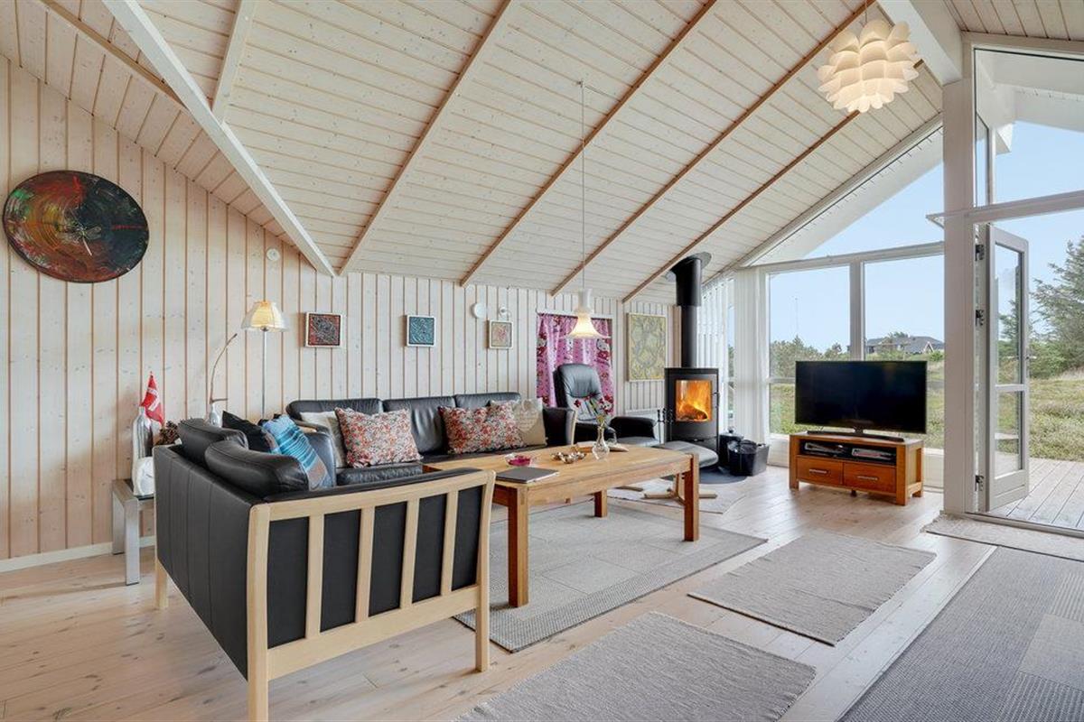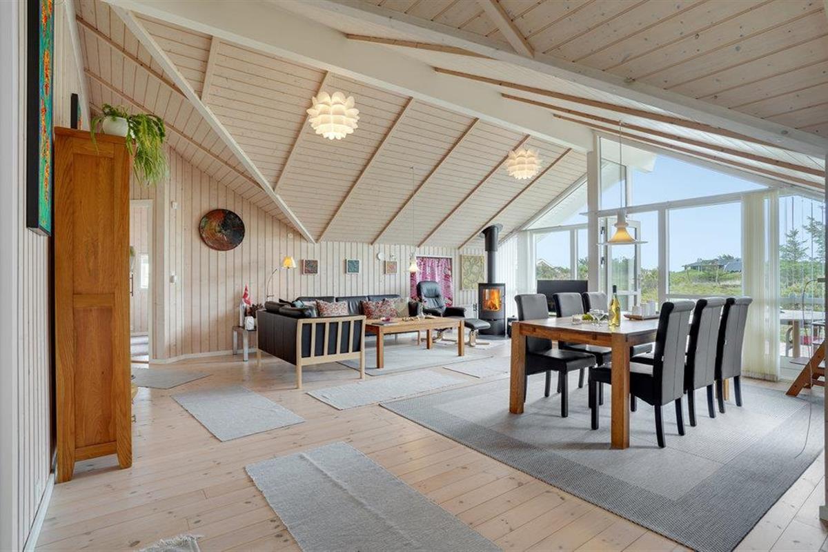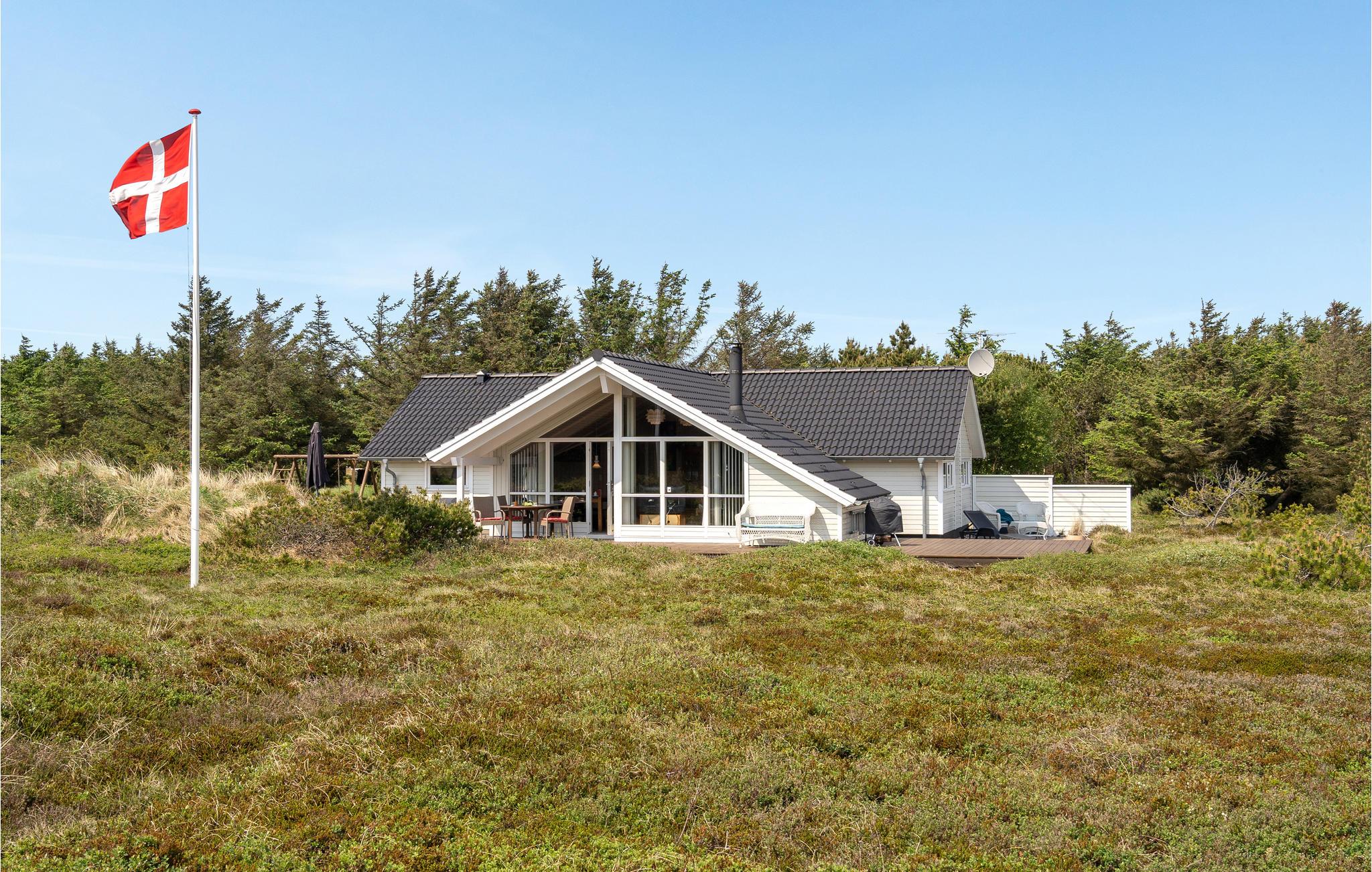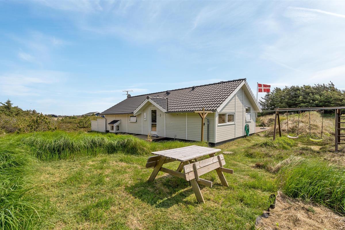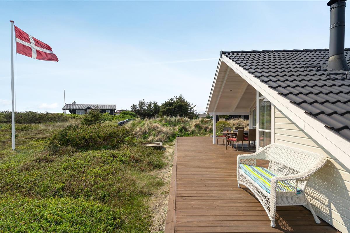 Golvende woning in aantrekkelijk vakantiehuisgebied bij de badplaats Søndervig. Het vakantiehuis bevat alles wat u zich kunt wensen voor een geslaagd verblijf. Het is niet alleen ruim, het heeft ook een mooie keuken-woonkamer en een terras ervoor, van waaruit u altijd uitzicht heeft op de heide en de duinen. Eén badkamer is uitgerust met een sauna en whirlpool en alle slaapkamers hebben goede tweepersoonsbedden. Er is ook een acoven. U kunt ook fietsen naar Ringkøbing en Hvide Sande. Om te vissen kunt u kiezen uit verschillende vismeren of de pier in Hvide Sande proberen.