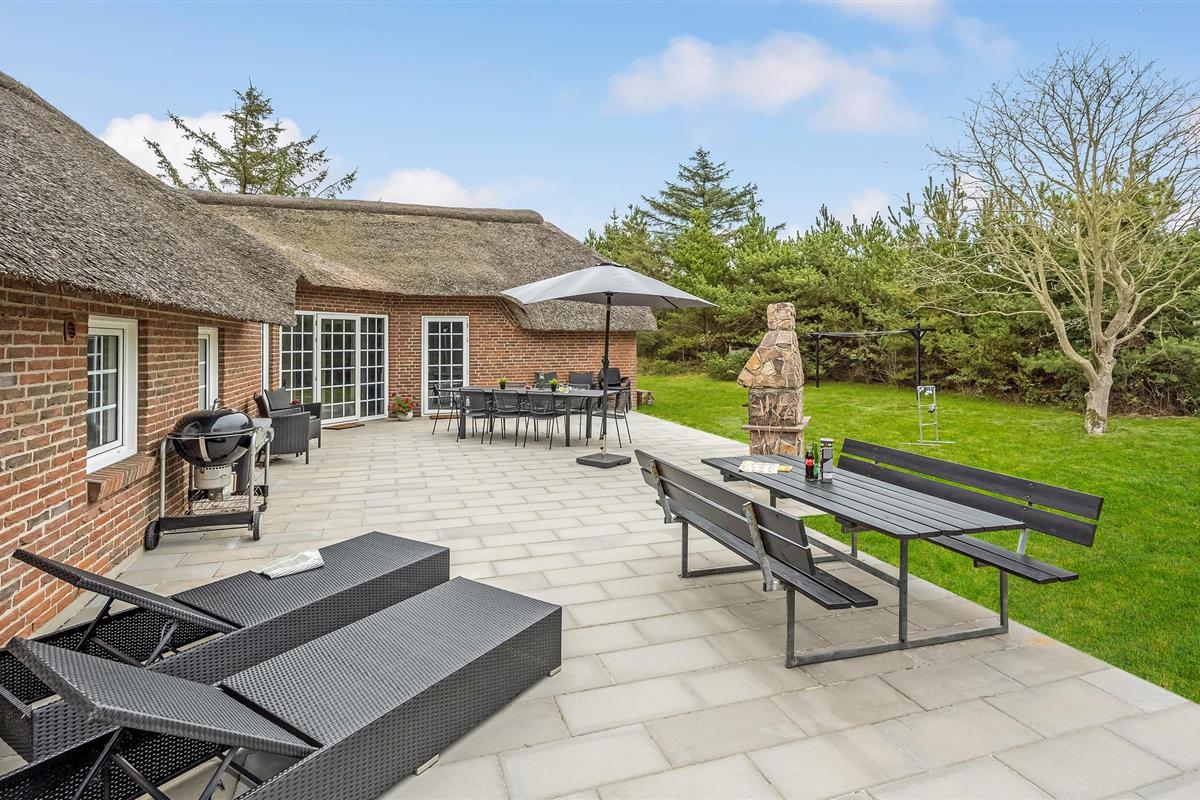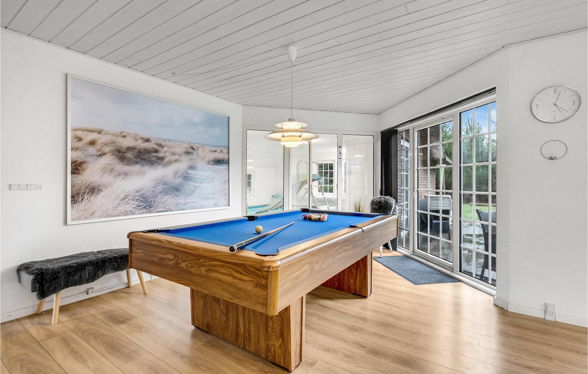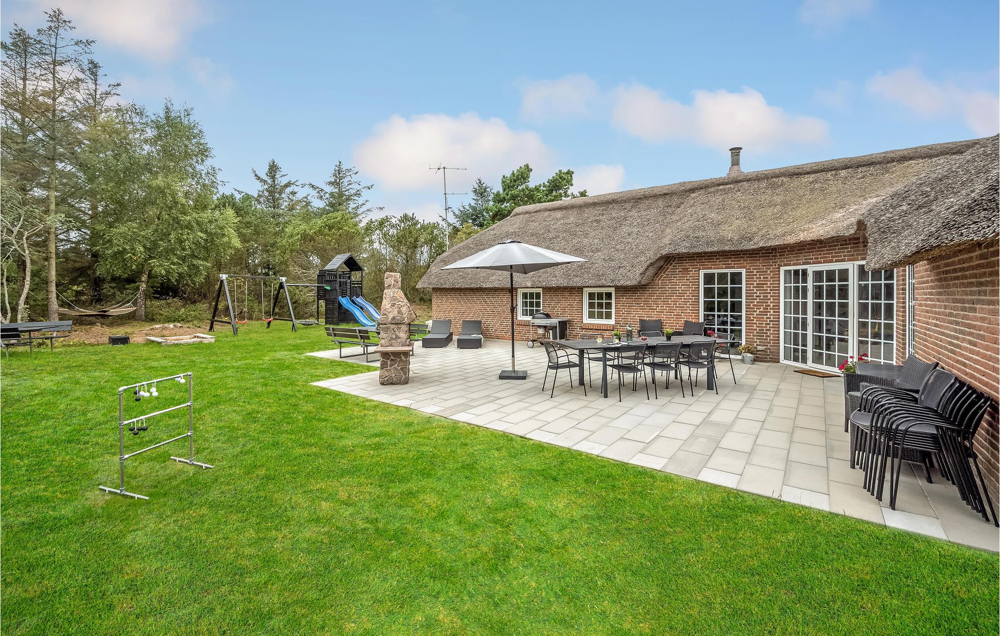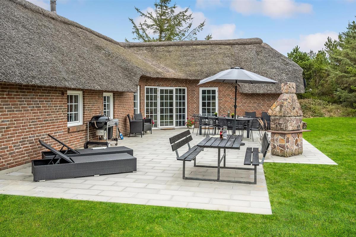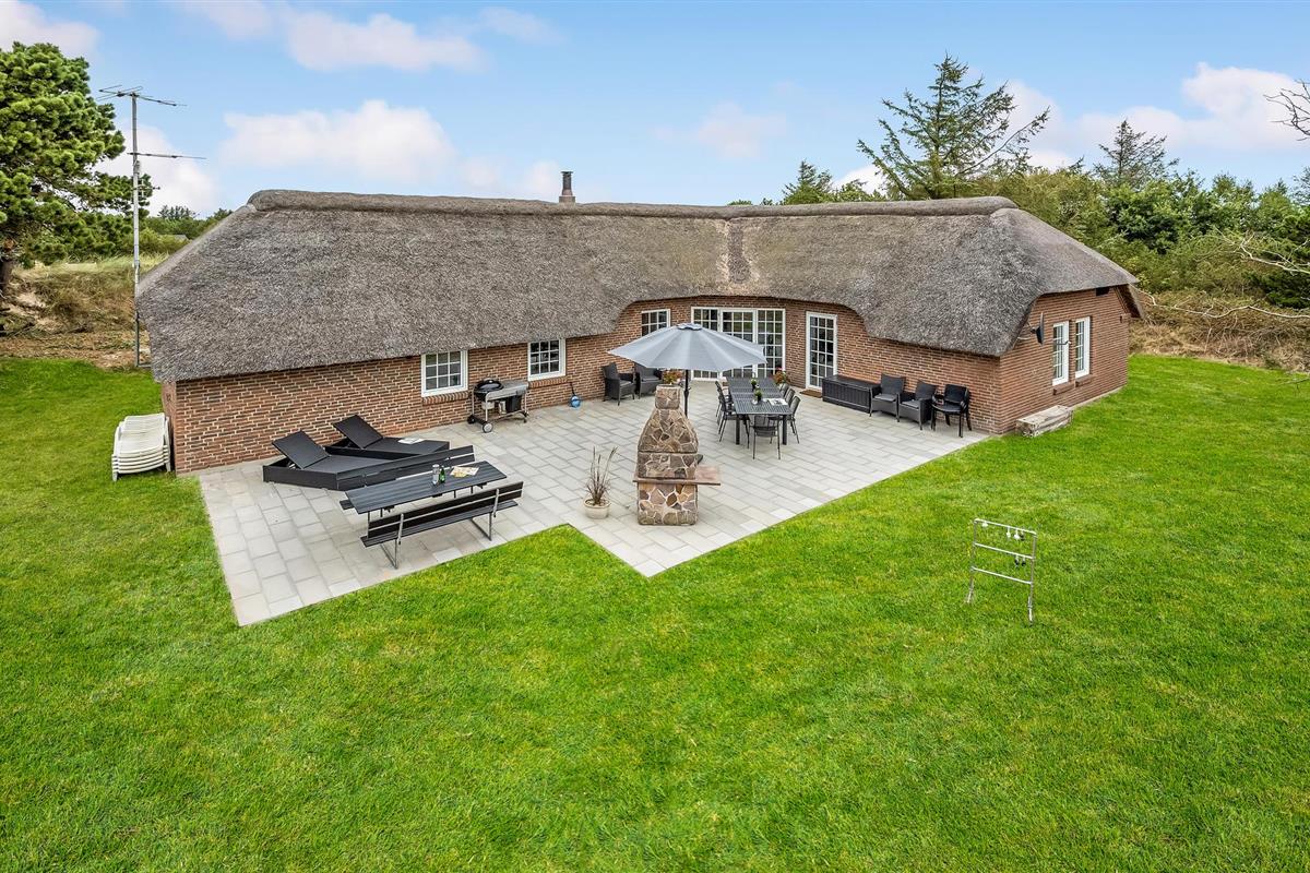 Op slechts twee en een halve kilometer van de populaire badplaats Søndervig ligt dit vakantiehuis met zijn mooie rieten dak. Het is ingericht voor 14 personen en biedt dus voldoende ruimte voor een groot gezin. Of zelfs twee gezinnen, want de zes slaapkamers zijn verdeeld over twee ruimtes. In het midden bevindt zich de ruime keuken-woonkamer. In het huis zijn ook twee badkamers en een prachtig zwembadgedeelte met whirlpool en sauna. Er is ook een biljarttafel. Een zonnig terras wacht op u voor het huis en de kinderen vinden mogelijkheden om te ravotten op het terrein. Søndervig staat bekend om zijn ligging aan de Noordzee en de indrukwekkende zandsculpturen. U kunt er ook goed winkelen, minigolfen en met de kinderen verschillende goede speeltuinen bezoeken. U kunt vissen vanaf de pier.