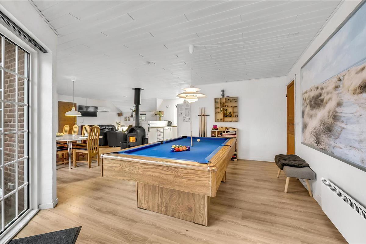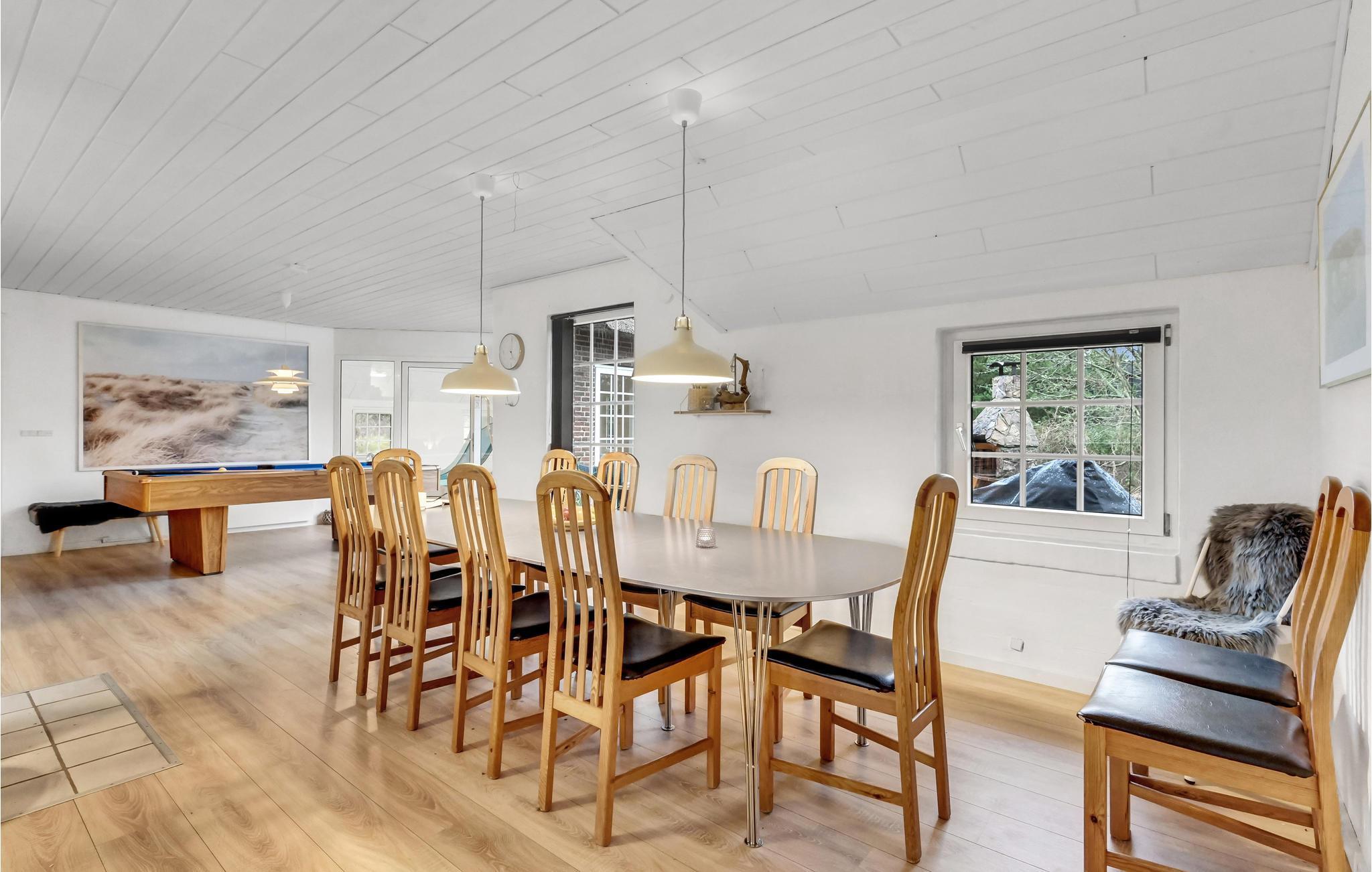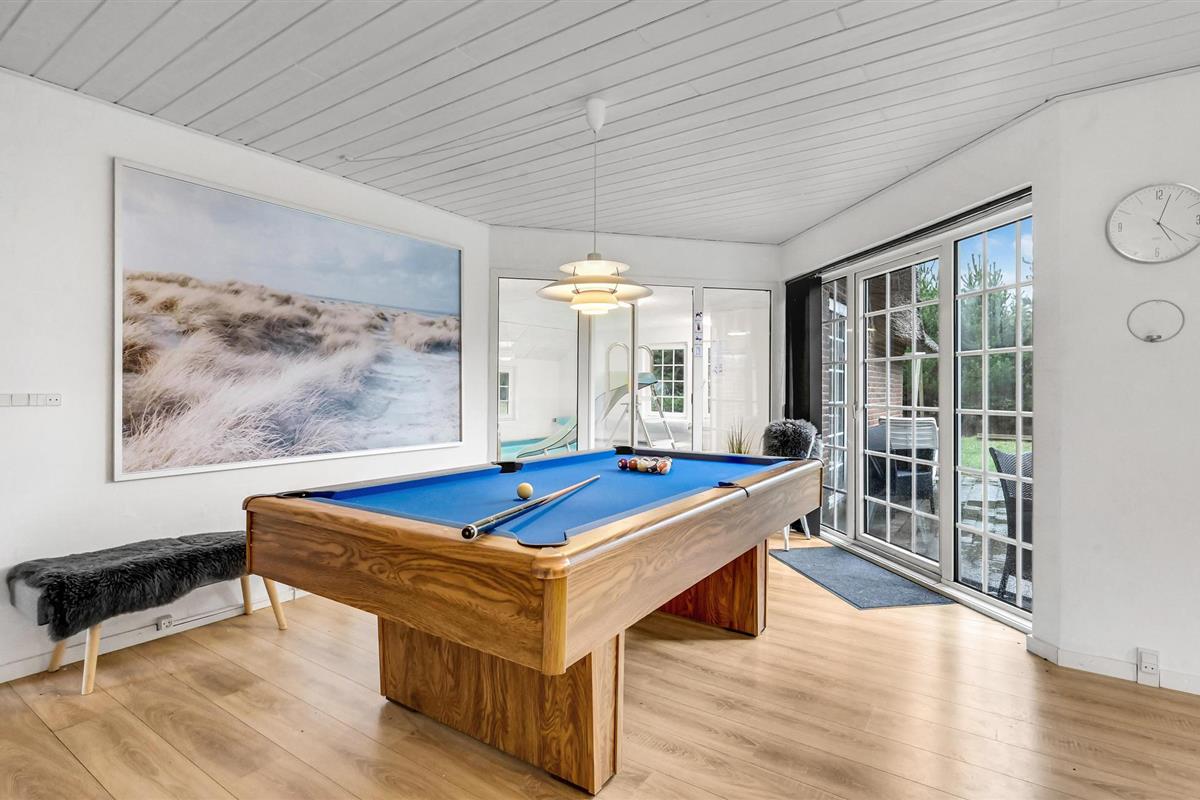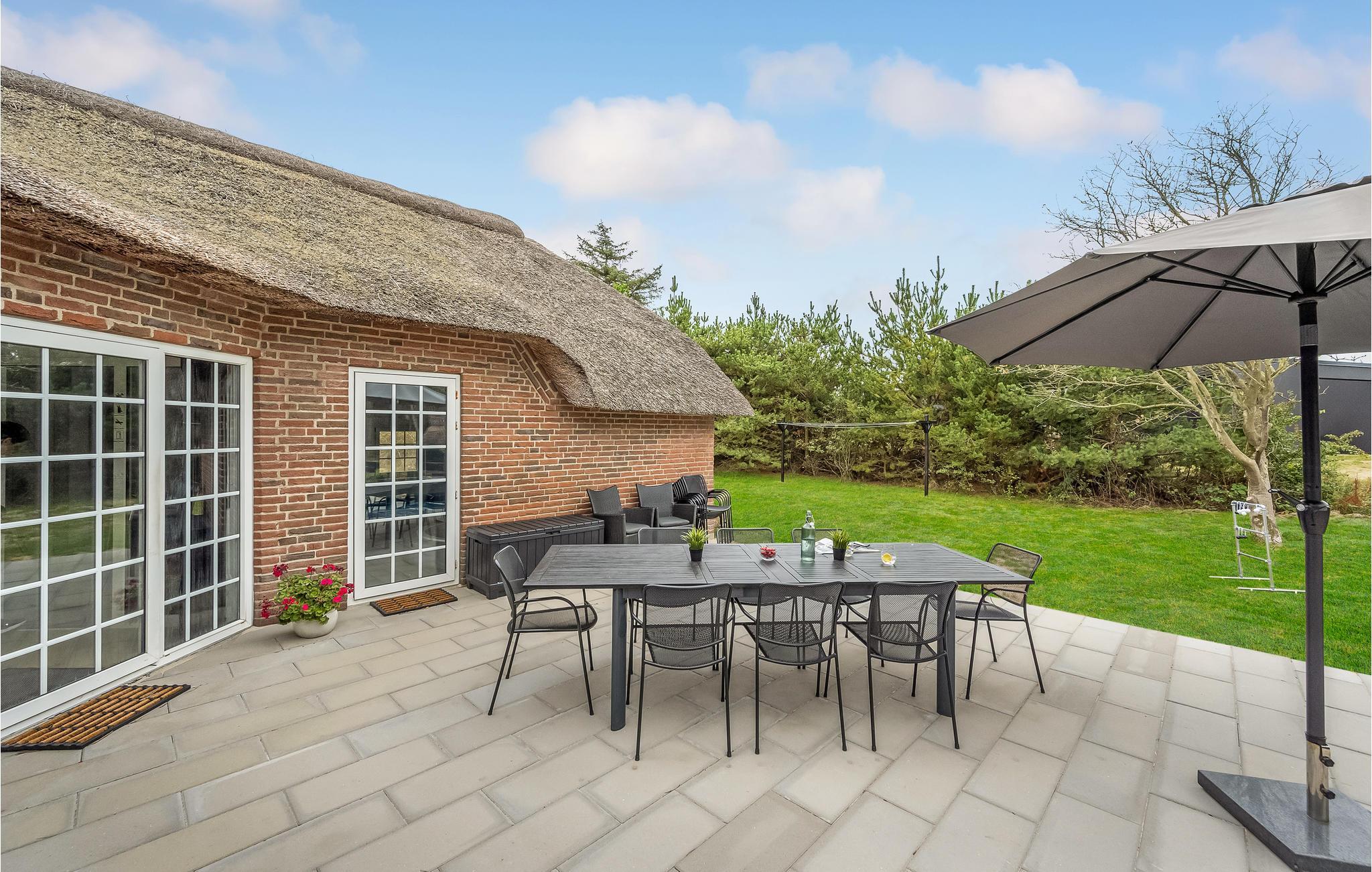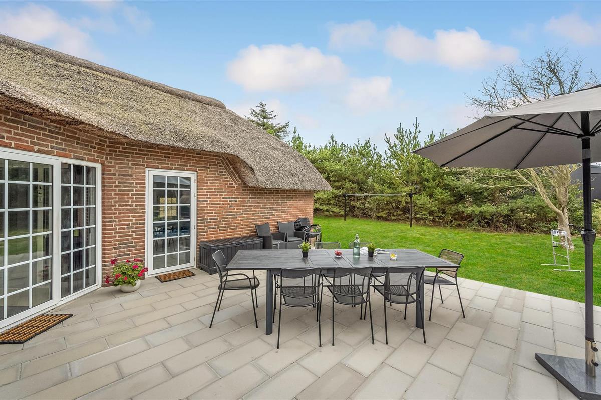 Op slechts twee en een halve kilometer van de populaire badplaats Søndervig ligt dit vakantiehuis met zijn mooie rieten dak. Het is ingericht voor 14 personen en biedt dus voldoende ruimte voor een groot gezin. Of zelfs twee gezinnen, want de zes slaapkamers zijn verdeeld over twee ruimtes. In het midden bevindt zich de ruime keuken-woonkamer. In het huis zijn ook twee badkamers en een prachtig zwembadgedeelte met whirlpool en sauna. Er is ook een biljarttafel. Een zonnig terras wacht op u voor het huis en de kinderen vinden mogelijkheden om te ravotten op het terrein. Søndervig staat bekend om zijn ligging aan de Noordzee en de indrukwekkende zandsculpturen. U kunt er ook goed winkelen, minigolfen en met de kinderen verschillende goede speeltuinen bezoeken. U kunt vissen vanaf de pier.