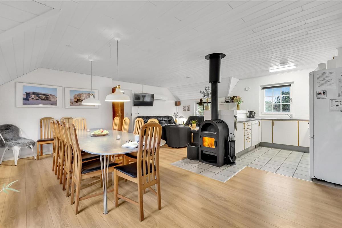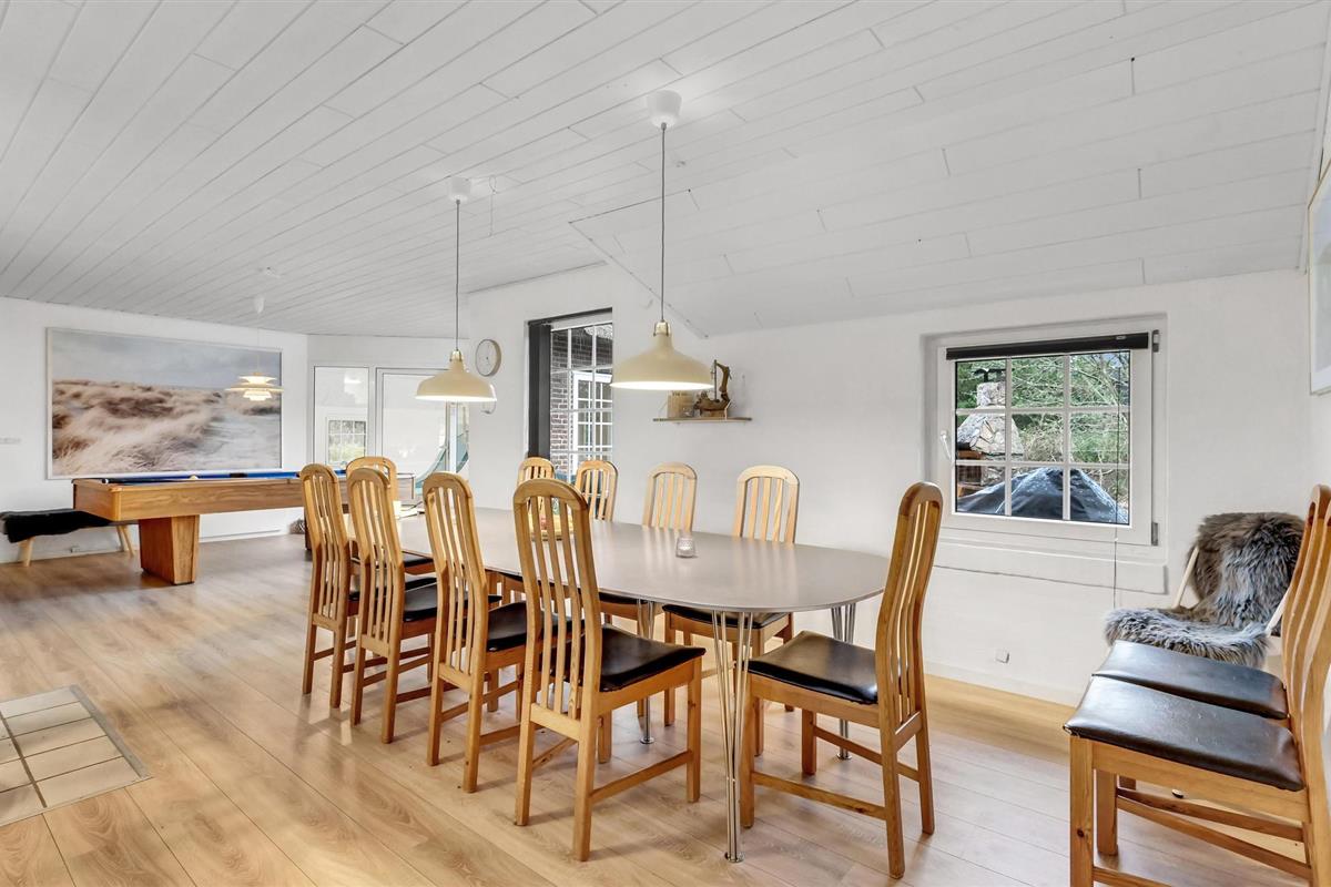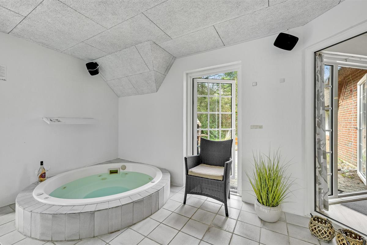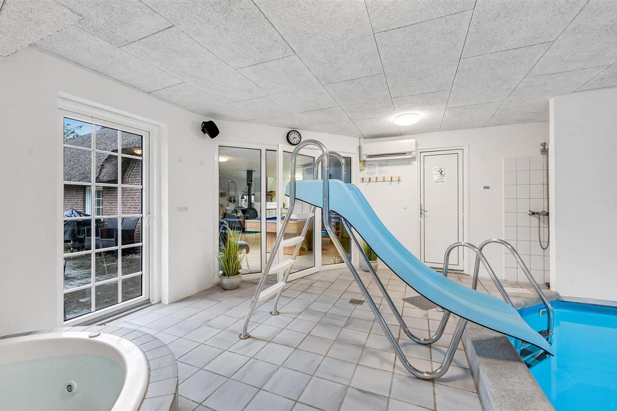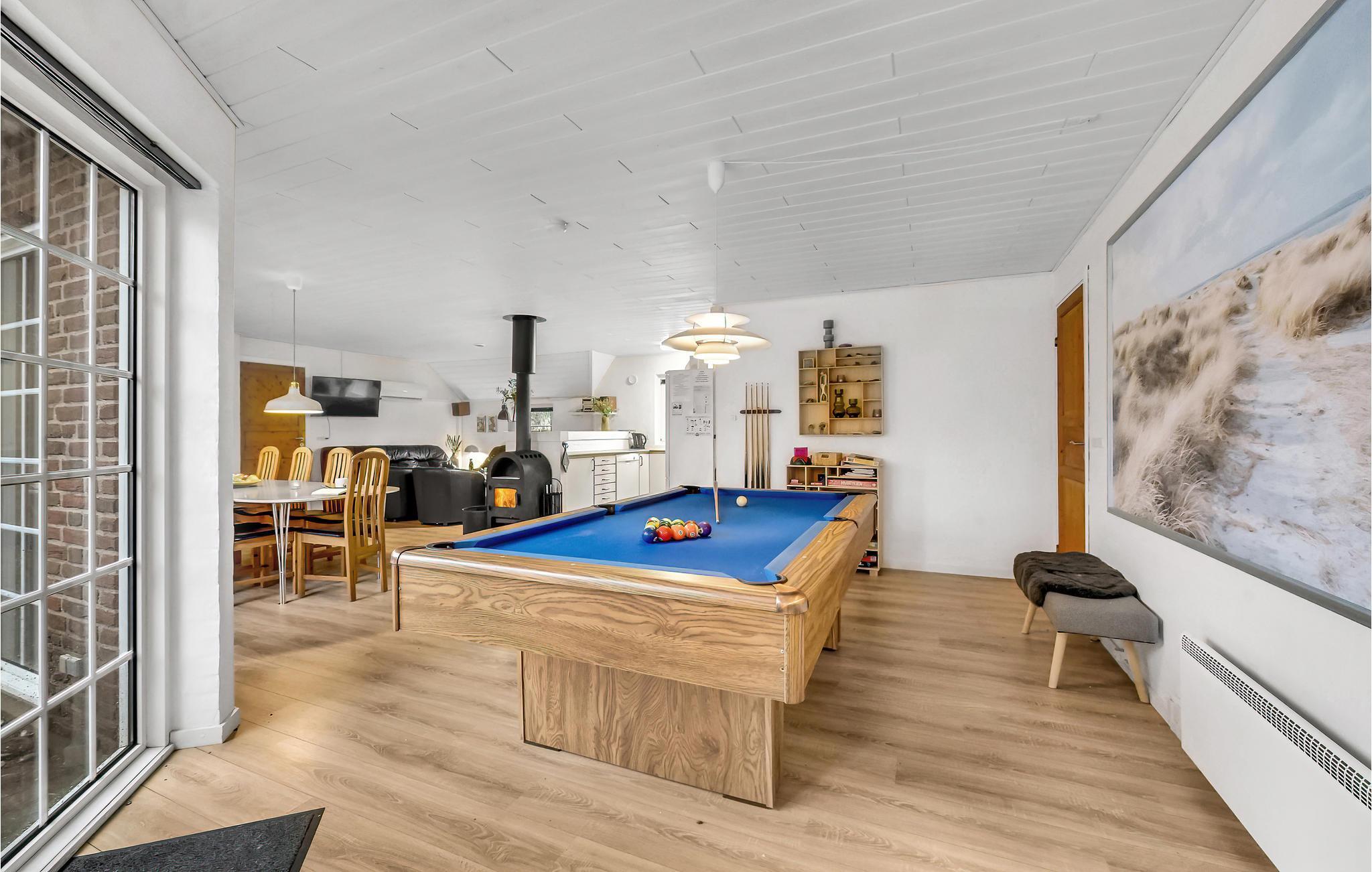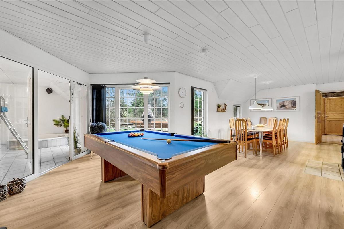 Op slechts twee en een halve kilometer van de populaire badplaats Søndervig ligt dit vakantiehuis met zijn mooie rieten dak. Het is ingericht voor 14 personen en biedt dus voldoende ruimte voor een groot gezin. Of zelfs twee gezinnen, want de zes slaapkamers zijn verdeeld over twee ruimtes. In het midden bevindt zich de ruime keuken-woonkamer. In het huis zijn ook twee badkamers en een prachtig zwembadgedeelte met whirlpool en sauna. Er is ook een biljarttafel. Een zonnig terras wacht op u voor het huis en de kinderen vinden mogelijkheden om te ravotten op het terrein. Søndervig staat bekend om zijn ligging aan de Noordzee en de indrukwekkende zandsculpturen. U kunt er ook goed winkelen, minigolfen en met de kinderen verschillende goede speeltuinen bezoeken. U kunt vissen vanaf de pier.