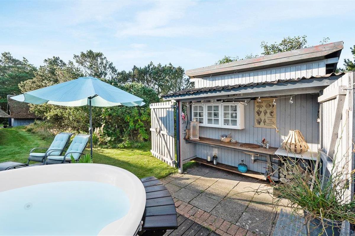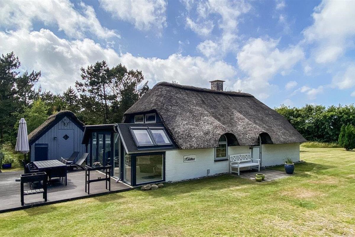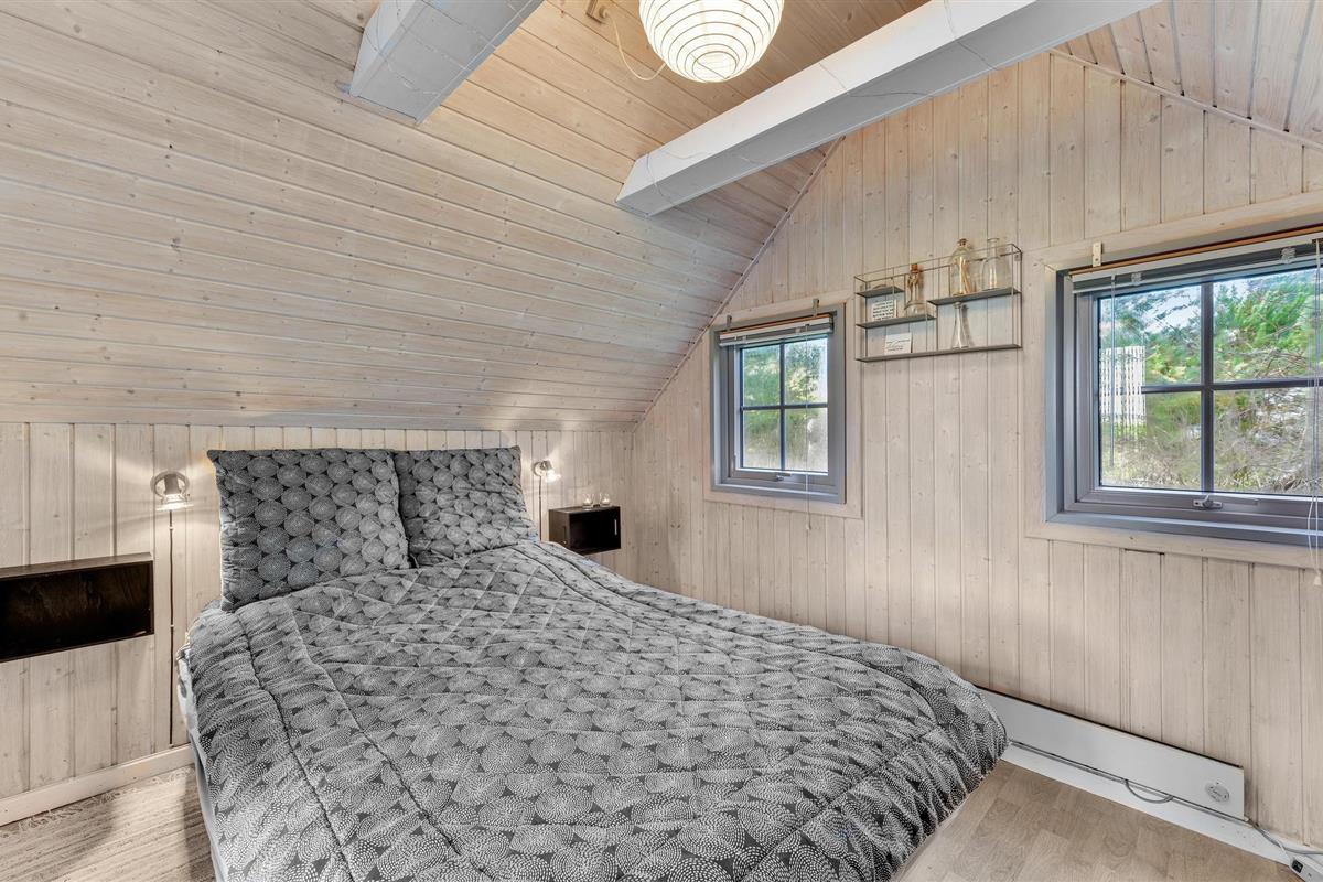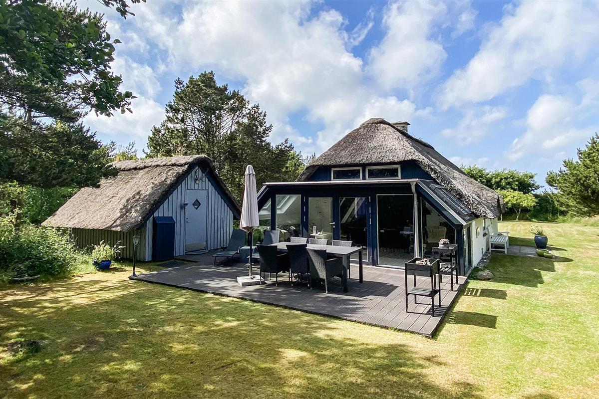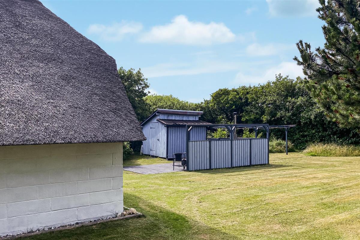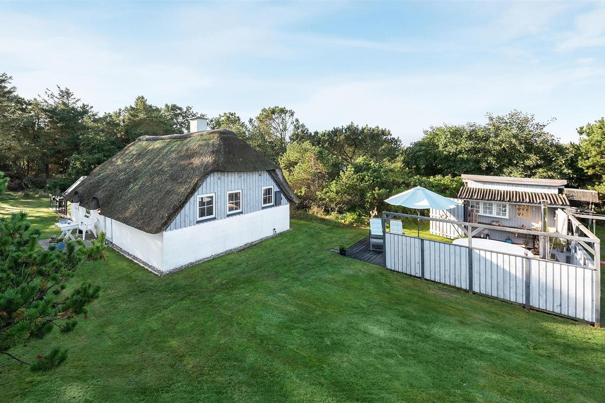 Kijk uit naar het uitzicht op de open vlaktes en velden. Het huis heeft een ideale locatie, op loopafstand van het populaire toeristische stadje Søndervig en de prachtige Noordzee. Het huis biedt een open en lichte keuken, eethoek en woonkamer, die u uitnodigt om veel gezellige tijd door te brengen met het hele gezin. Er is ook een badkamer met douche en vloerverwarming, 2 slaapkamers en een gezellige zolder. Het huis wordt verwarmd door een warmtepomp en heeft een houtkachel voor extra warmte en gezelligheid in de lange avonden. Vanuit de woonkamer heeft u toegang tot een van de terrassen van het huis. Vanaf hier heeft u toegang tot een bijgebouw met nog een slaapkamer en een gastentoilet.