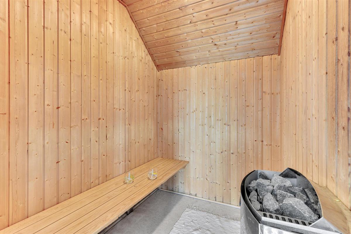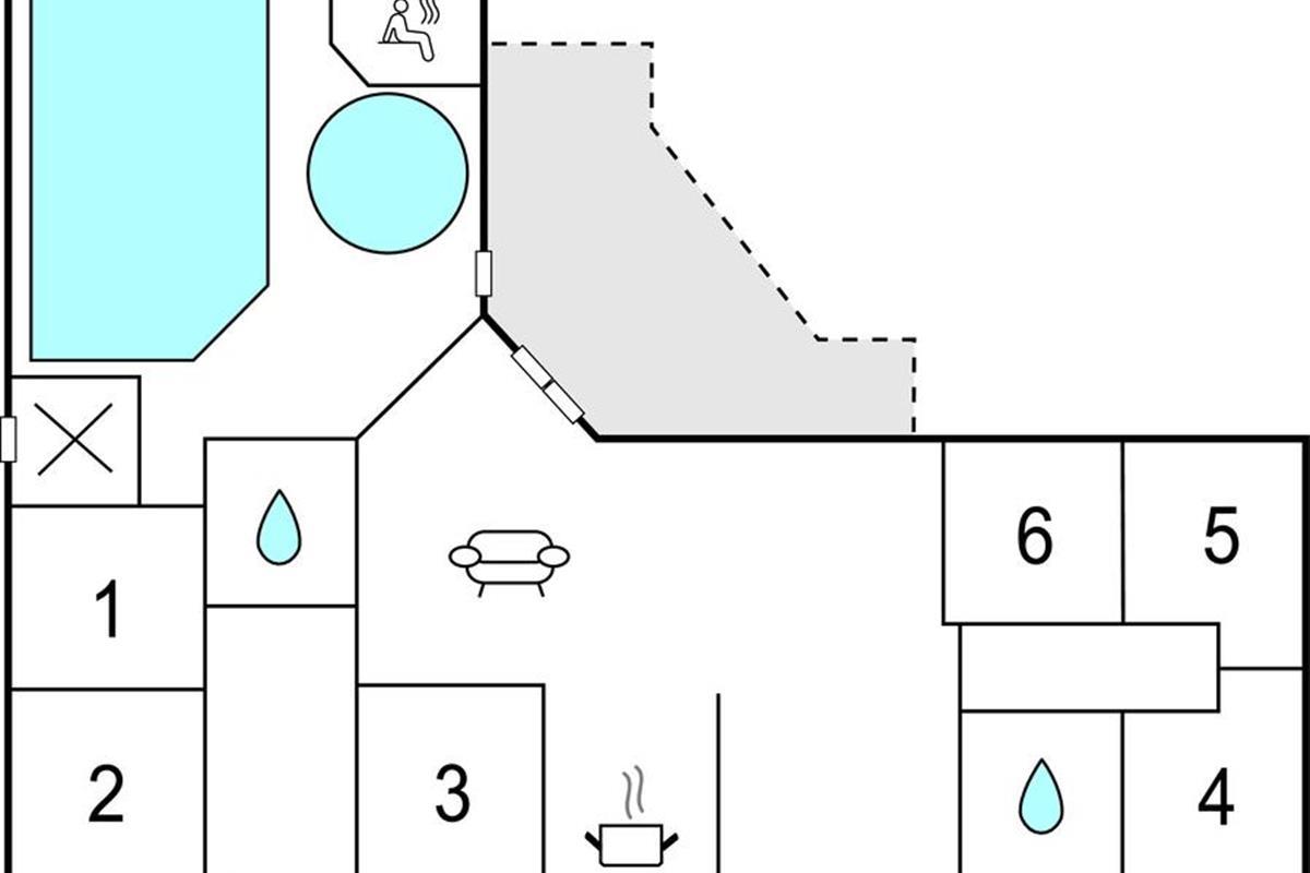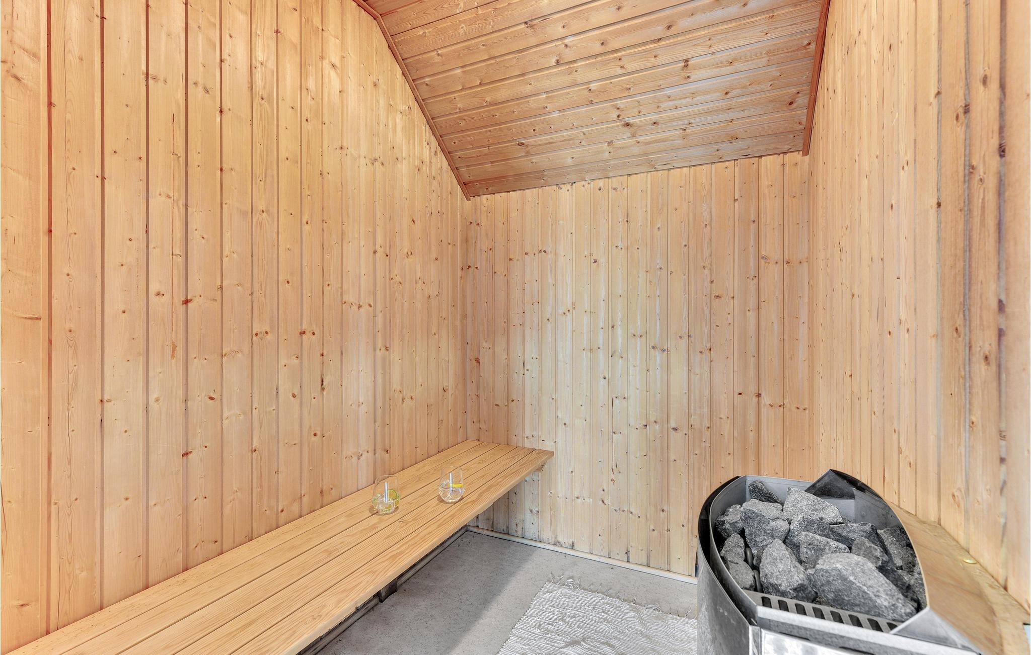 et huis heeft een eigen zwembad van 17 m², een sauna en een whirlpool. De kern van het huis is de keuken-woonkamer met eethoek, die open verbonden is met de woonkamer. Aan de ene kant hiervan liggen de twee slaapgedeeltes, elk met drie slaapkamers en een badkamer met douche. Er is een kachel in de woonkamer om het op koele dagen gezellig te houden. Er is ook een warmtepomp om het huis te verwarmen. Er is een wasmachine en een droger.