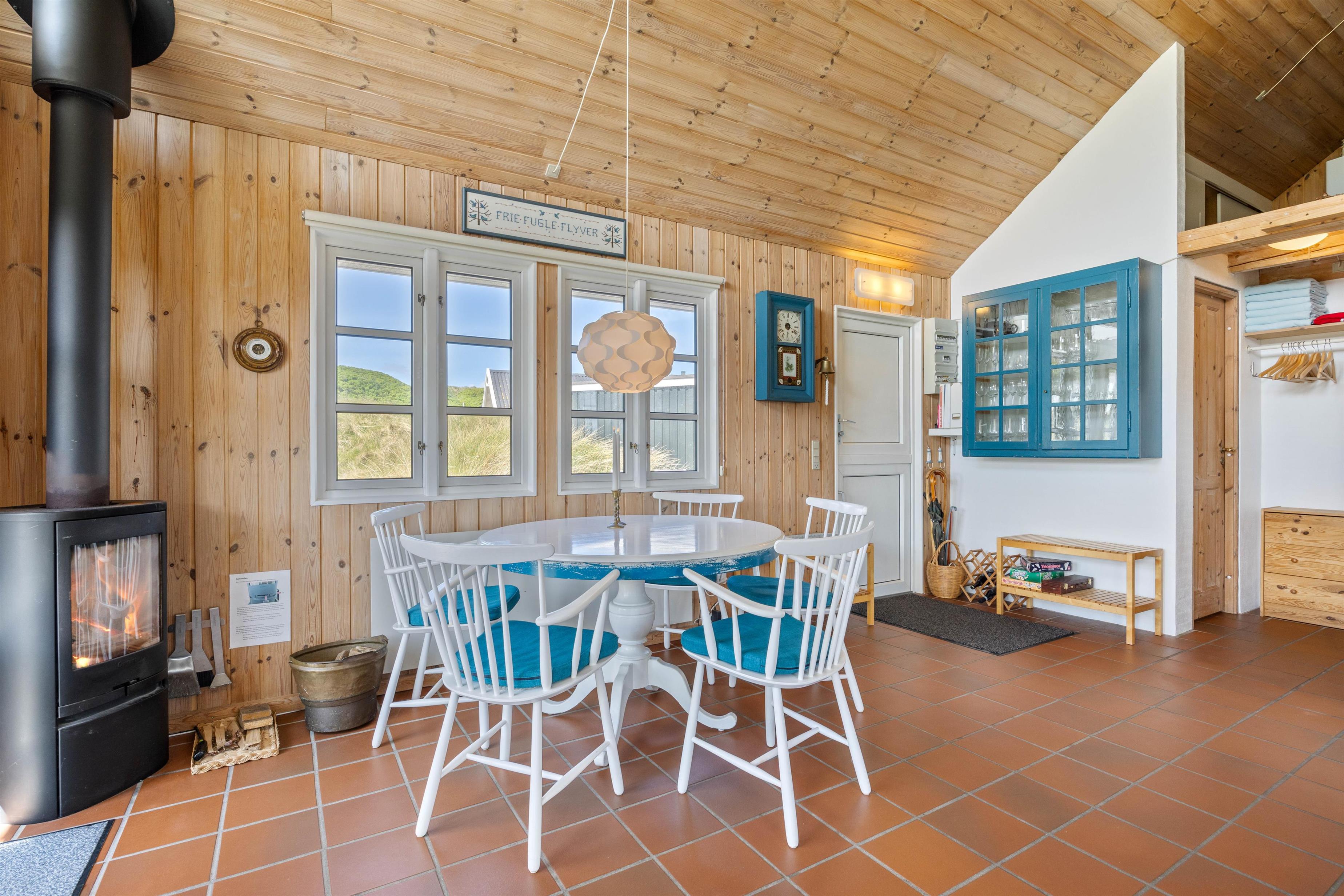 Upon arrival, you'll be greeted by a wonderful holiday atmosphere. Wood-panelled walls and high ceilings, combined with the wood-burning stove, create a cosy ambiance - perfect for quality family time. The holiday home features a sauna where you can truly unwind and forget everyday stresses. On cooler days, an energy-efficient air-to-air heat pump maintains a comfortable, consistent temperature throughout the holiday home.