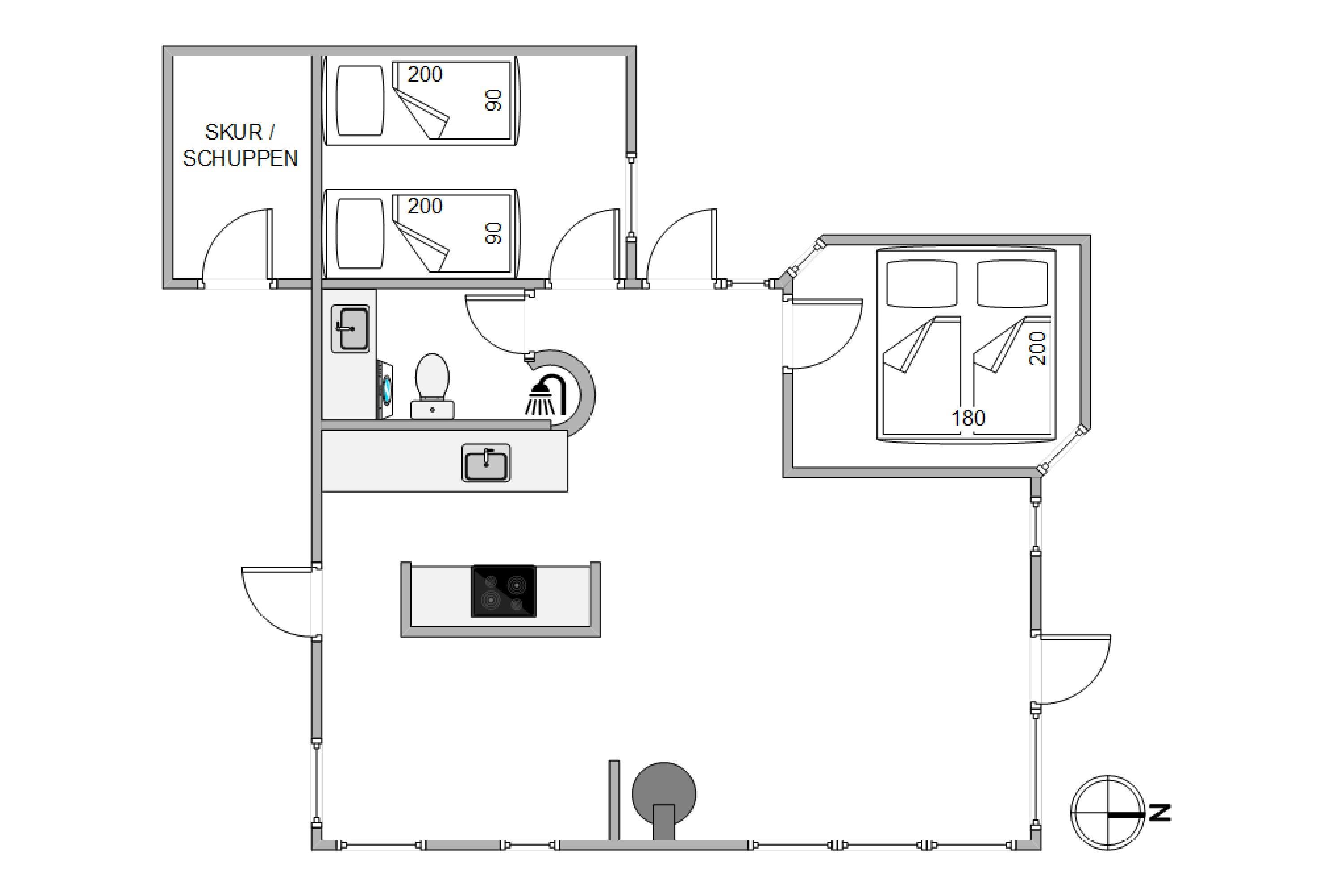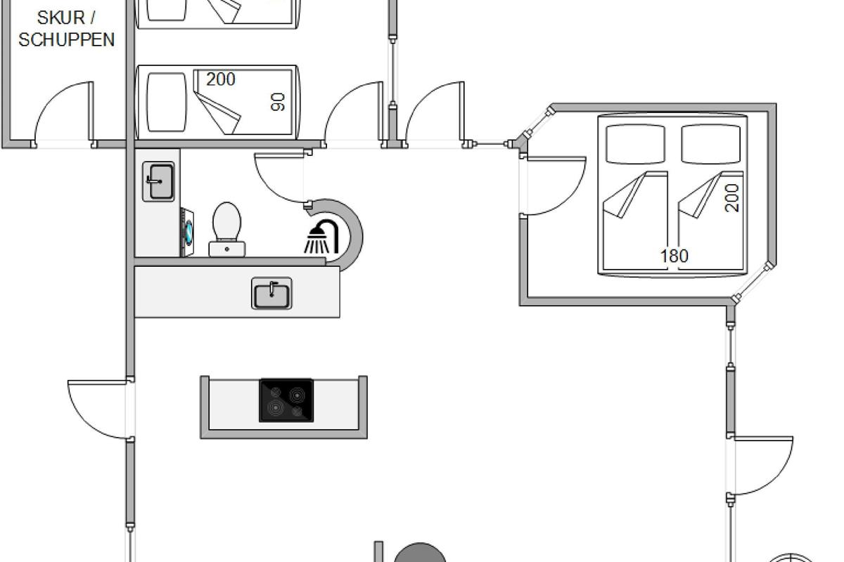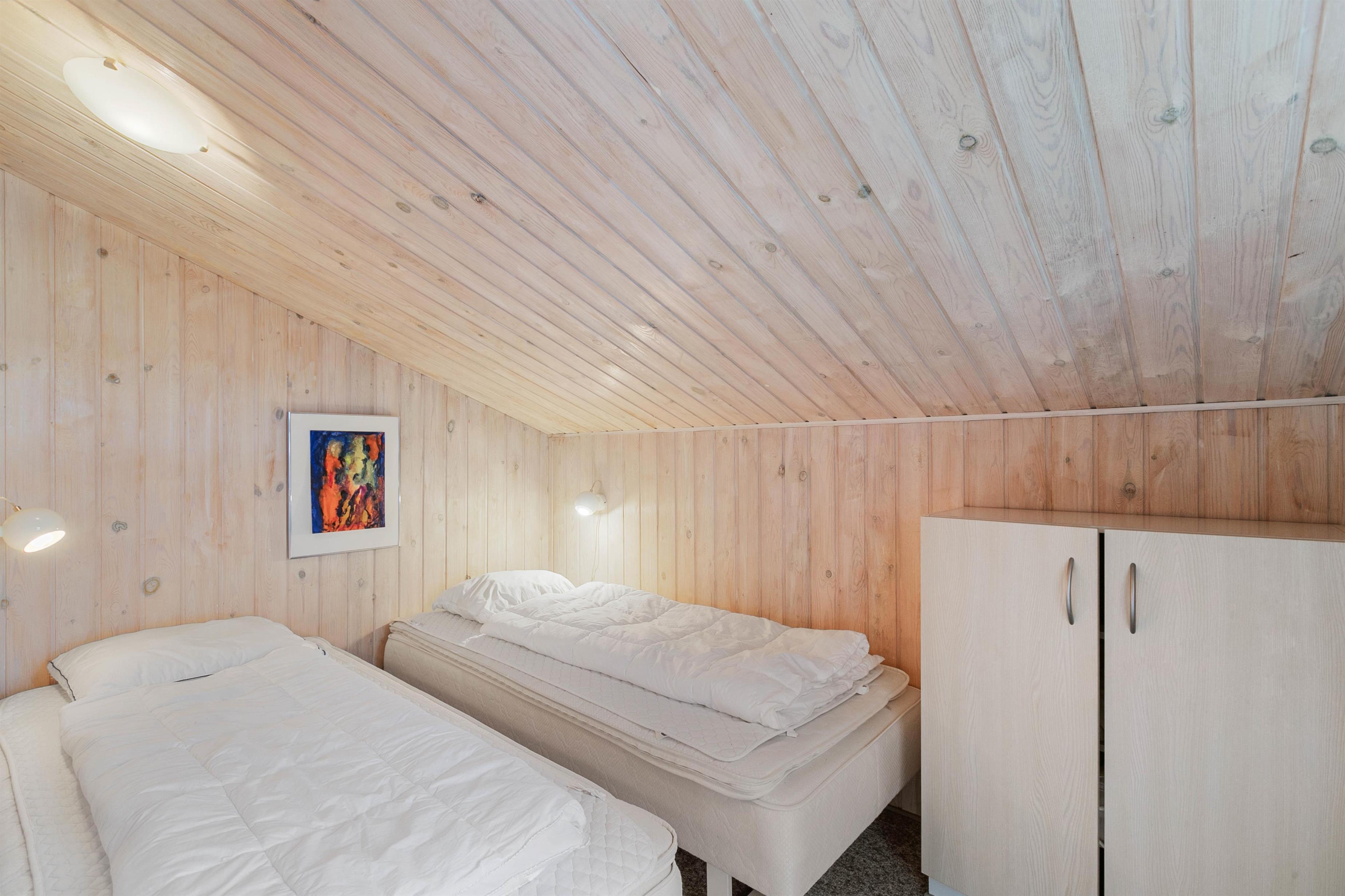 Sleeping arrangements comprise two bedrooms, one with a double bed and another with two single beds. The holiday home also features a well-maintained bathroom with washing machine and underfloor heating, ensuring comfortable temperatures throughout the day.