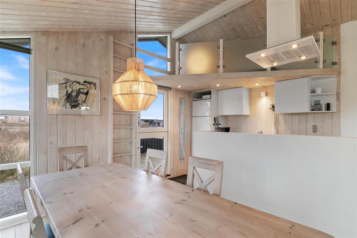 The heart of the holiday home is the bright living area, featuring an open-plan, practical kitchen and welcoming living room with large windows offering direct views over the Danish dune landscape. Here you can relax on comfortable seating, listen to the crackling flames of the wood-burning stove, read an engaging book or plan your next day's activities together.