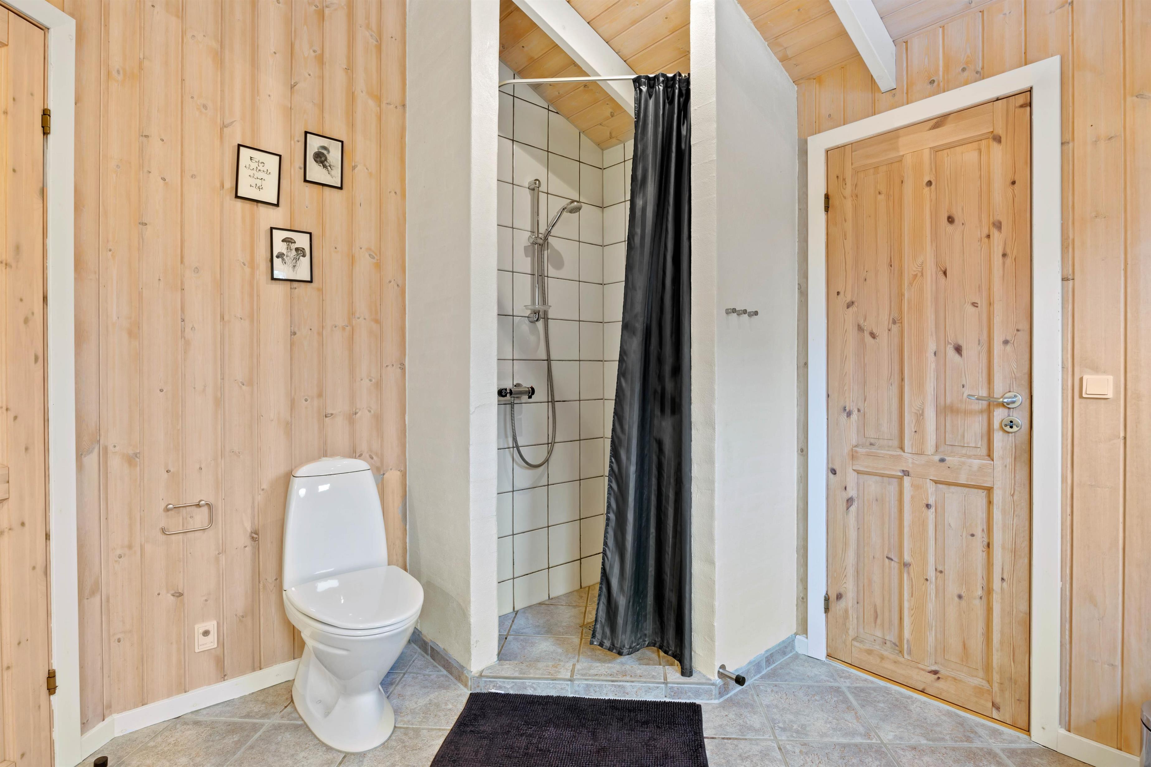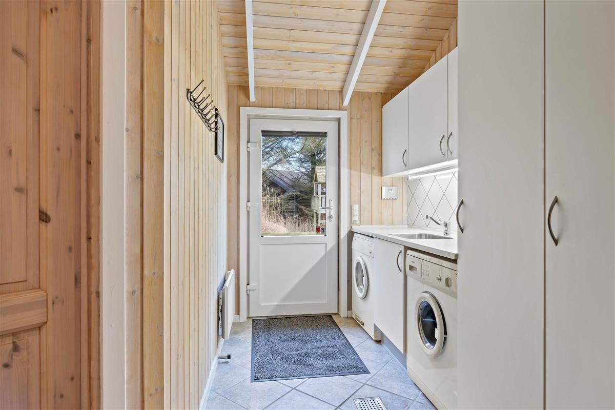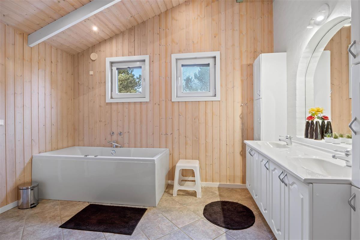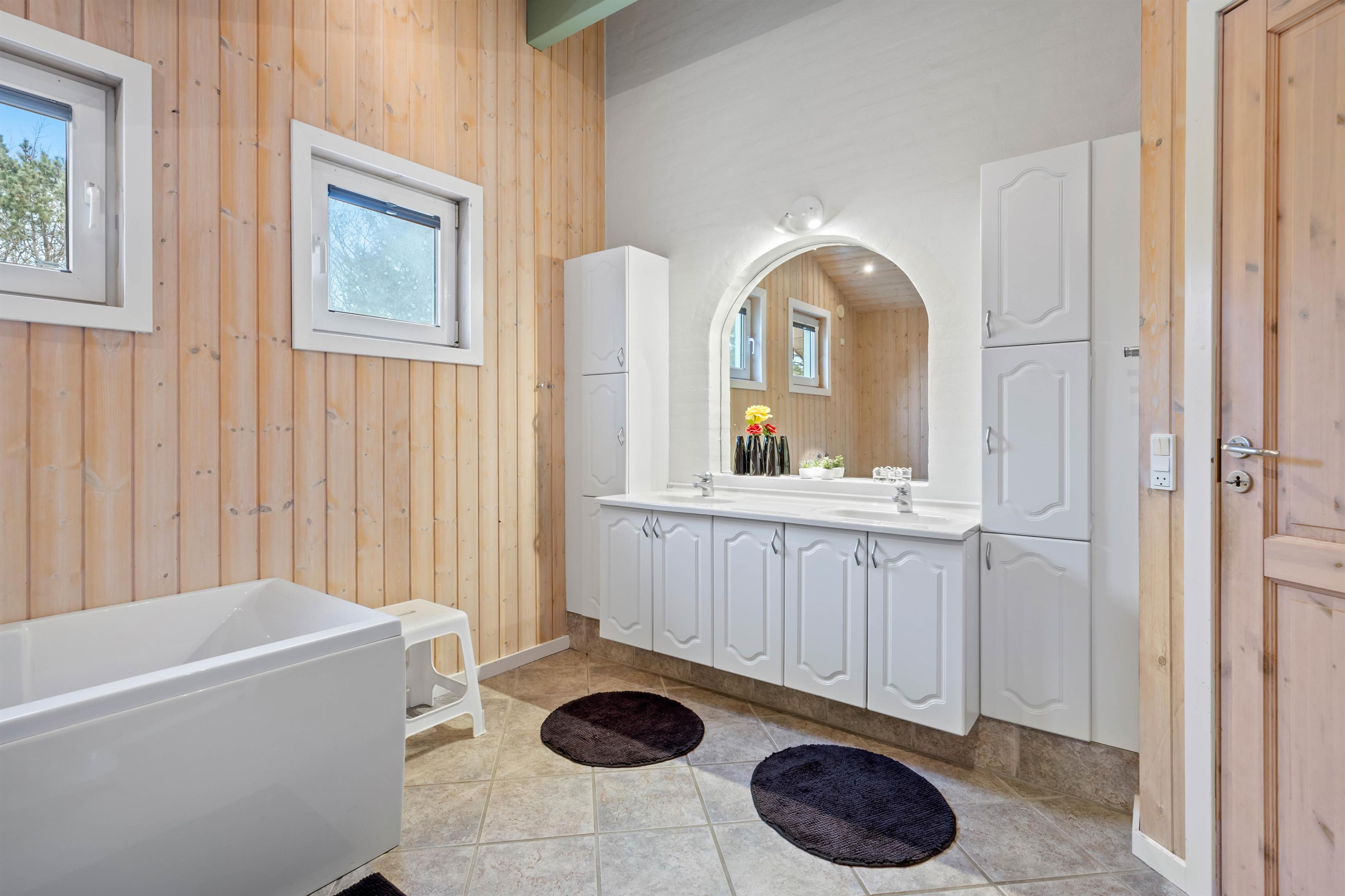 The holiday home features two bathrooms, both with underfloor heating. The larger bathroom includes a whirlpool, perfect for relaxing after a long day in the fresh air. Light some candles and unwind - a lovely way to end a wonderful day. Practical amenities like the washing machine and tumble dryer are available, helping you pack lighter for your stay.