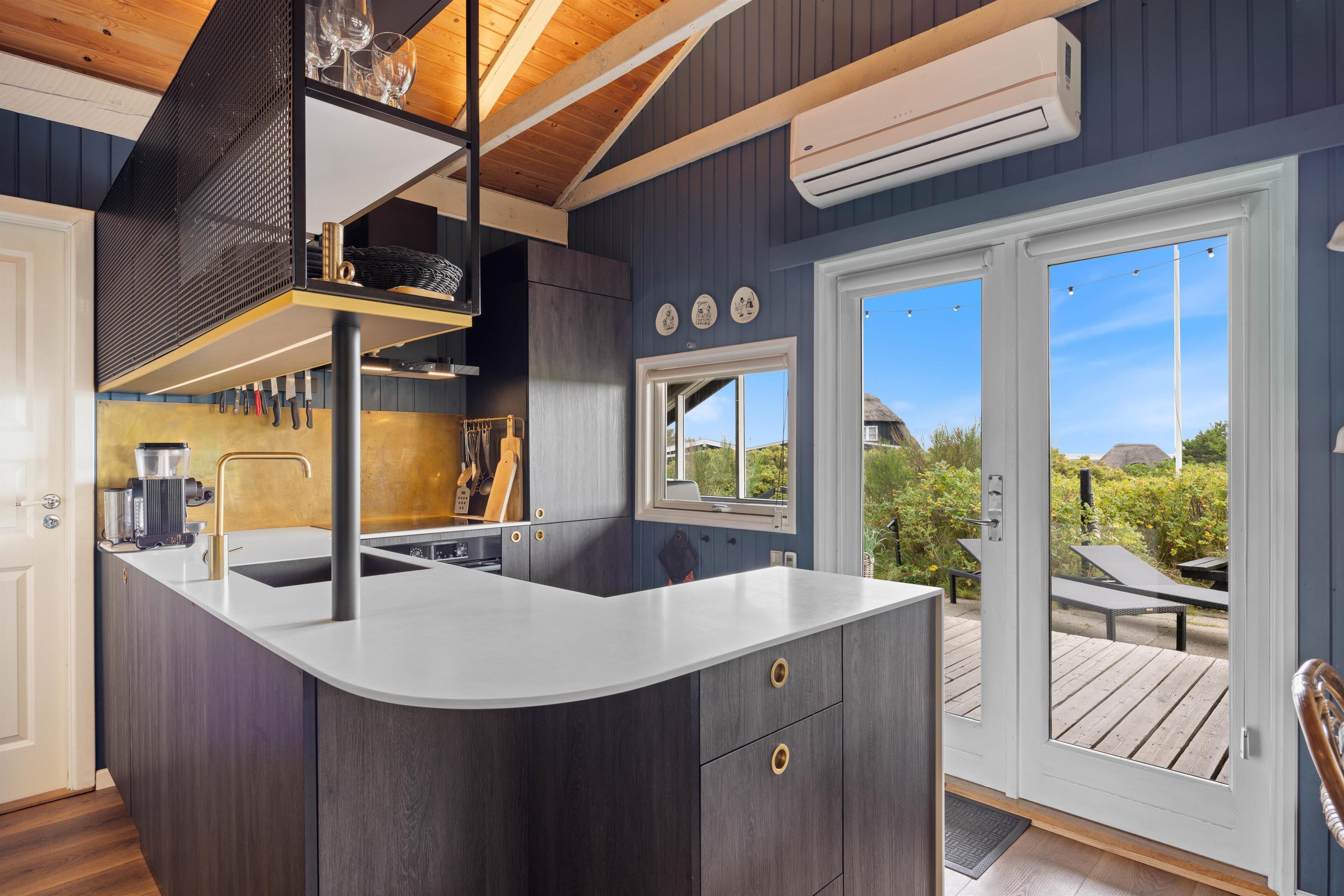 Situated in the West Jutland dune landscape, just 300 metres from the sea and less than 10 minutes' walk from Søndervig centre, you'll find this charming holiday home, renovated in 2020. The holiday home is decorated in beautiful Scandinavian style, featuring a wood-burning stove and Chromecast. It includes an annex with its own bathroom and private terrace. A particular highlight is the barrel sauna, along with several excellent terraces offering views stretching to the Ringkøbing Fjord. Dogs are also welcome here at Nordsøvej 198!