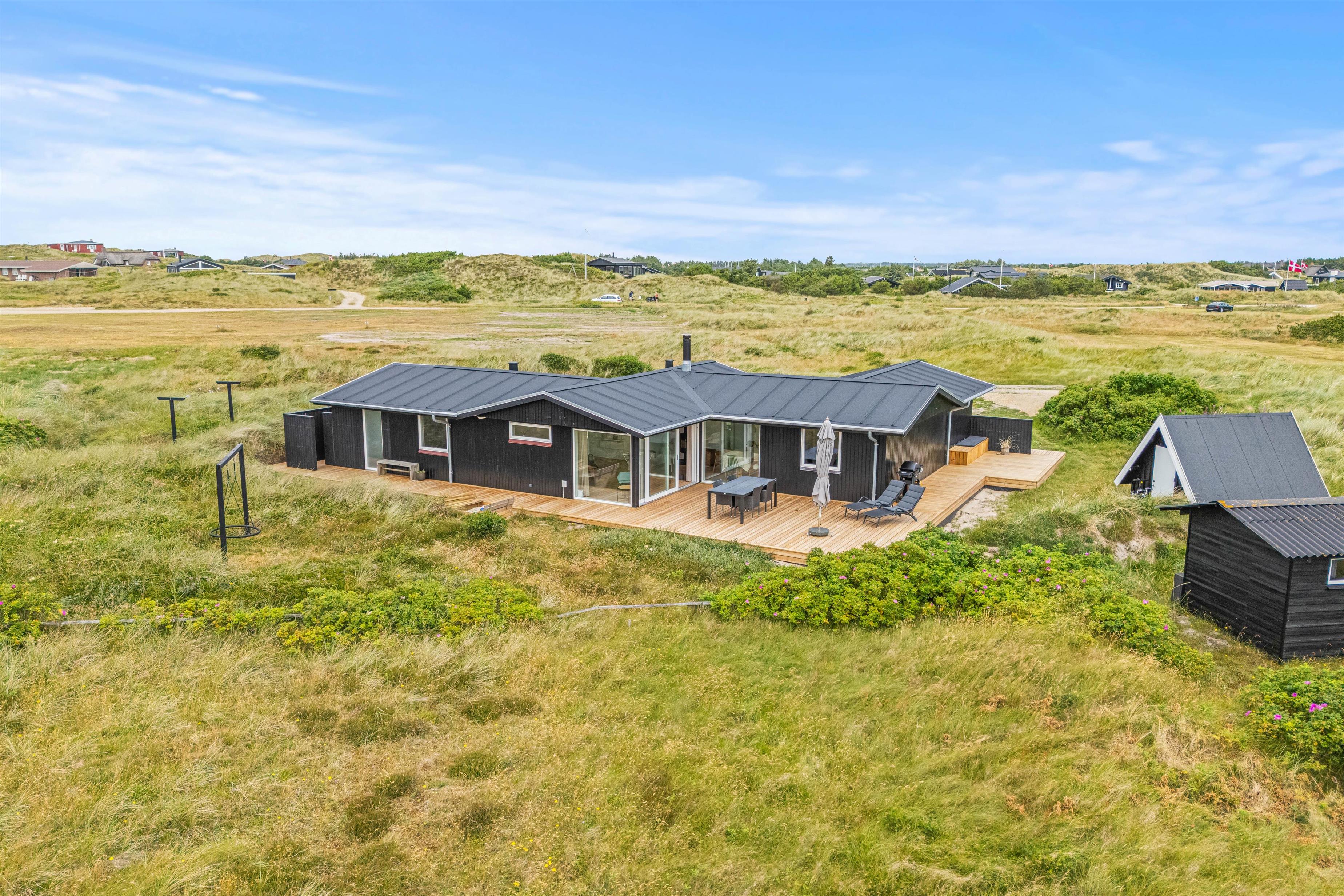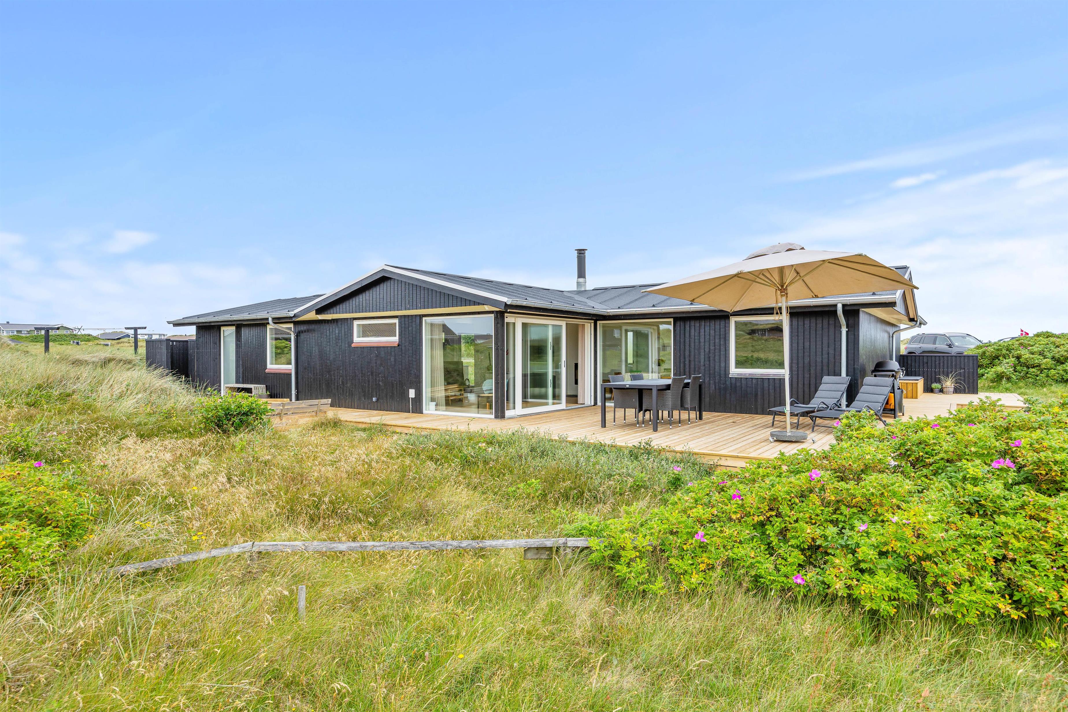 The many floor-to-ceiling windows in the living area not only allow abundant natural light but also offer stunning views of the dune landscape. Relax and enjoy the magnificent panorama. As an alternative to the fireplace, a modern heat pump efficiently maintains comfortable temperatures.