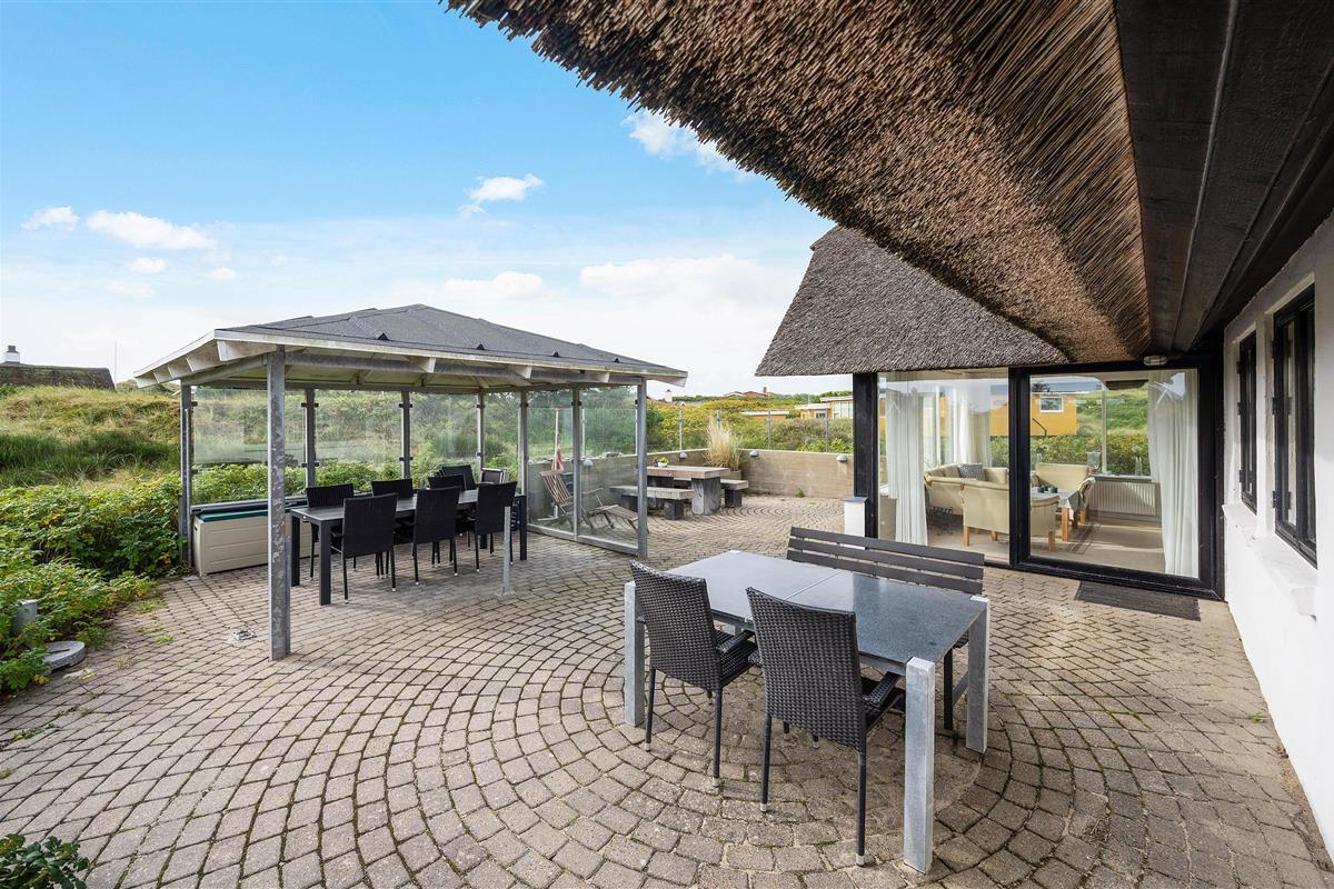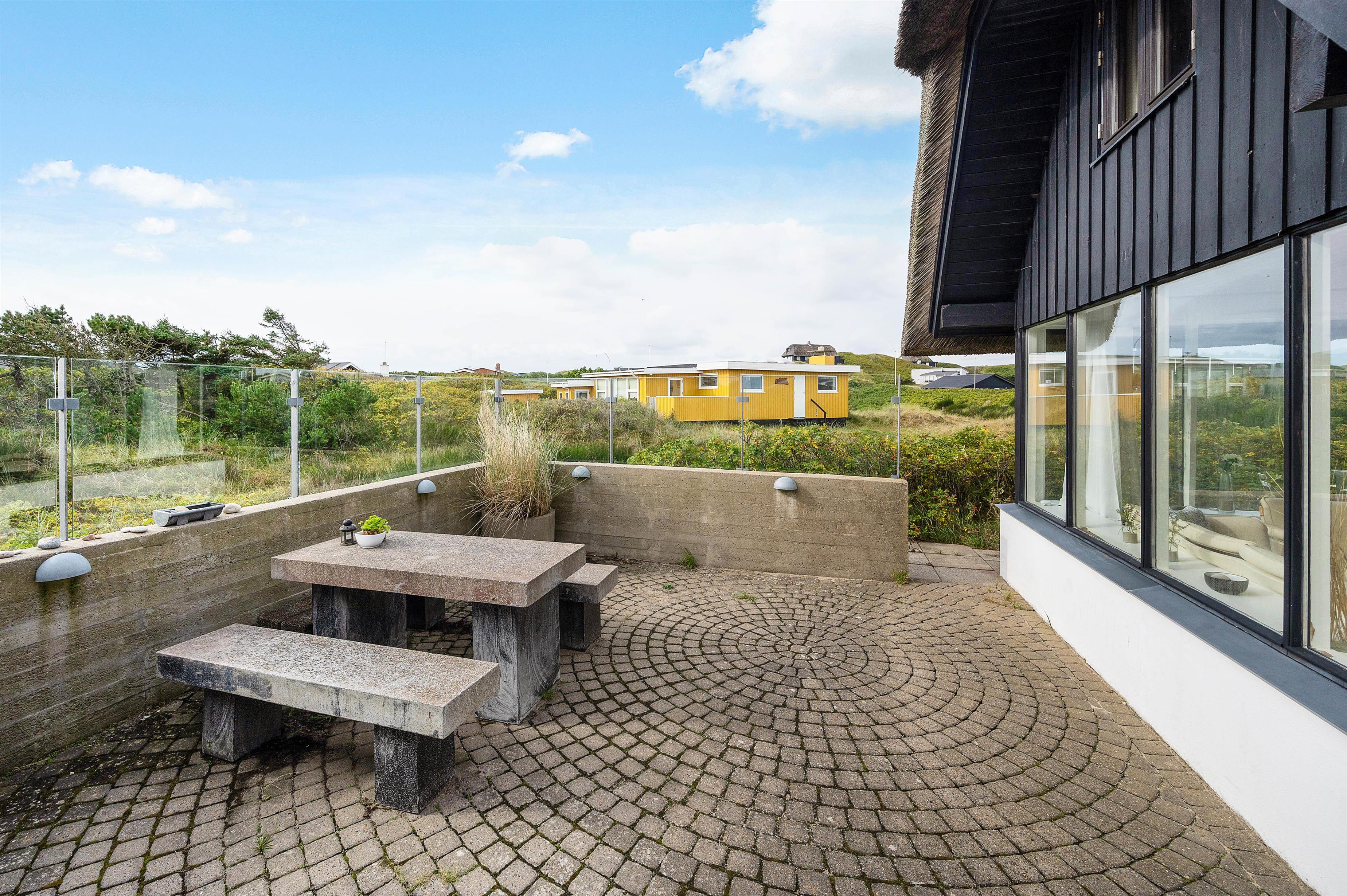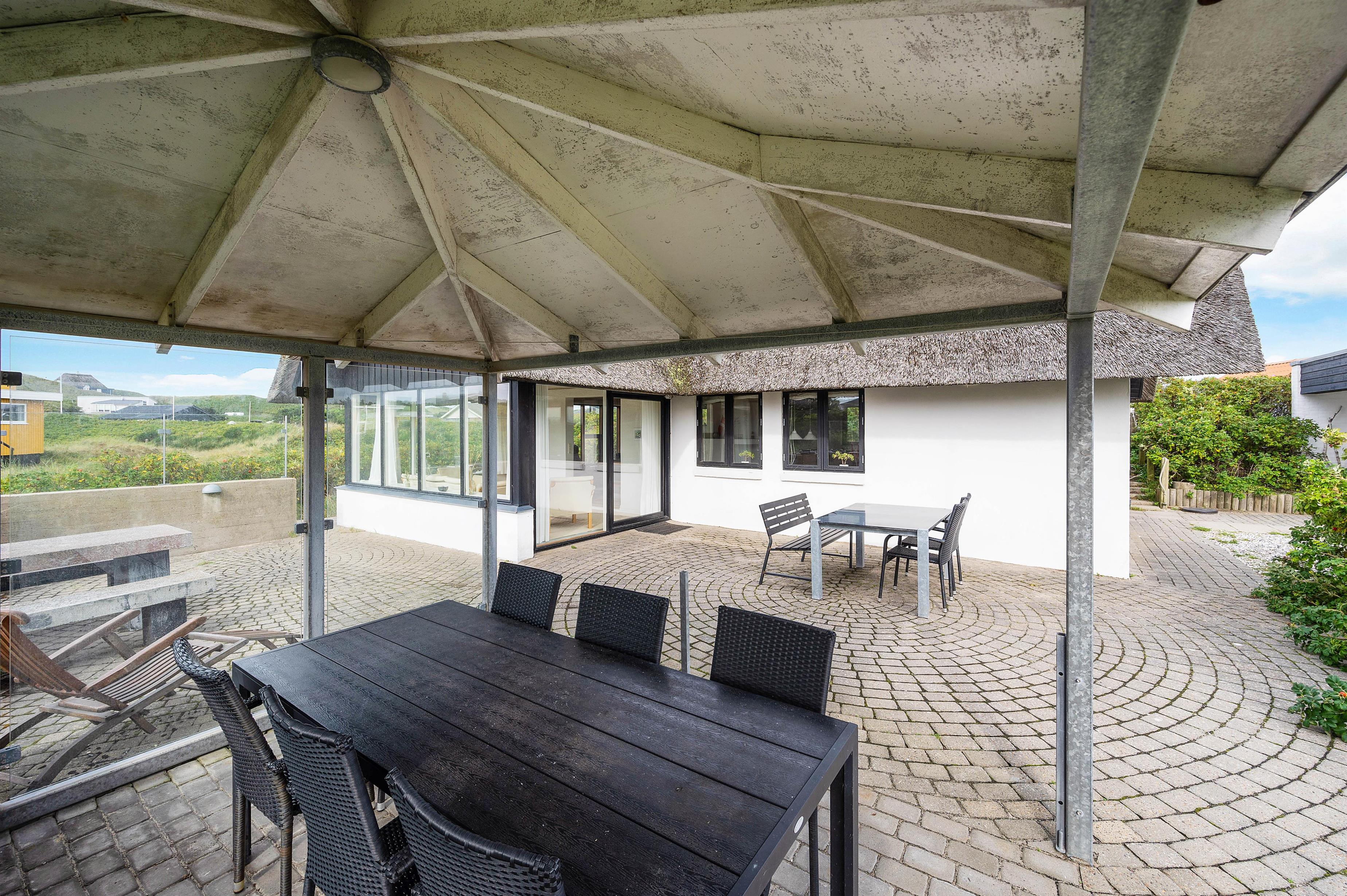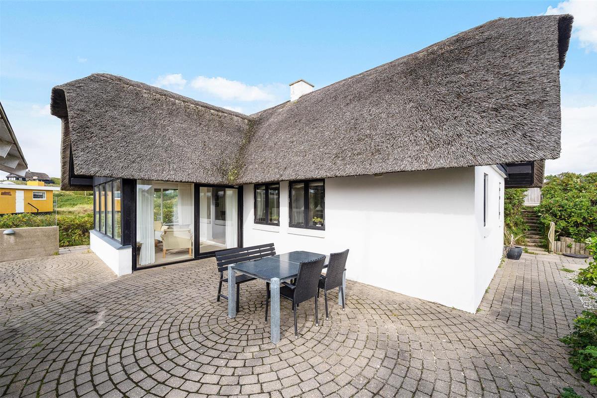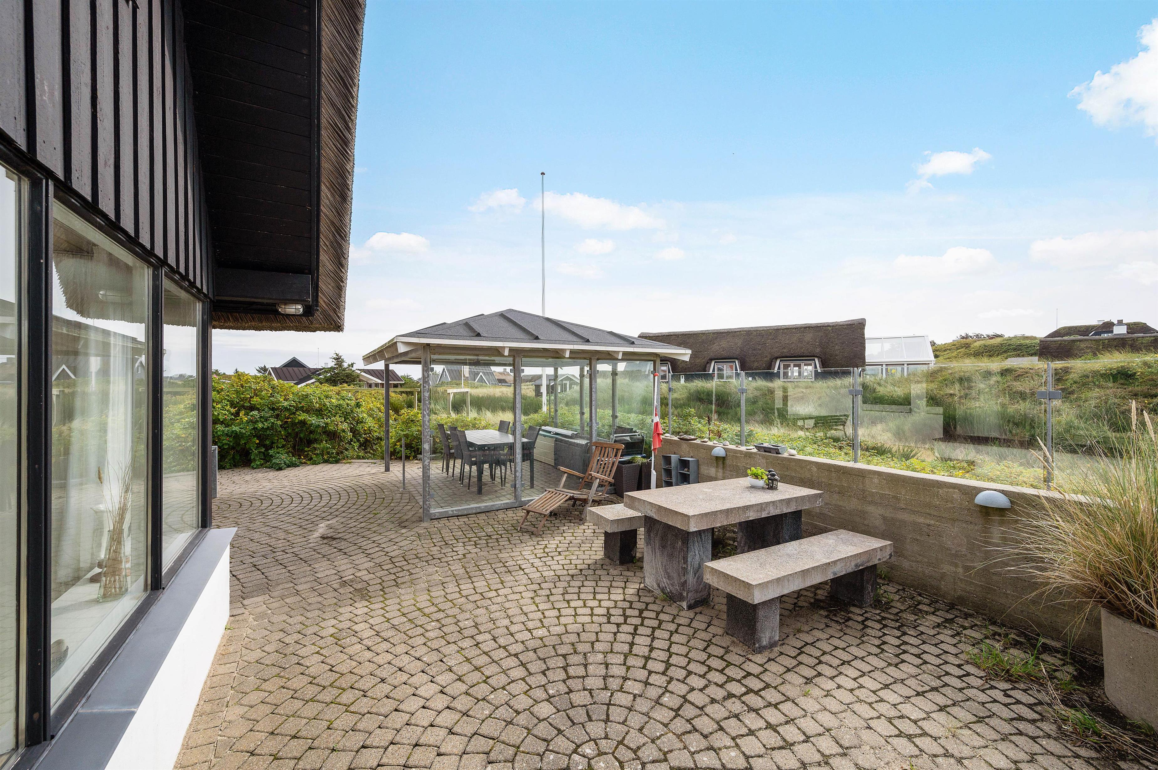 The holiday home at Plantagevej 21 is surrounded by a large, attractive outdoor terrace, partially screened with glass and featuring a covered section. In the lovely glass-enclosed corner with benches, tables and sun loungers, you can relax outdoors whatever the weather and enjoy the Danish West Coast nature. The terrace includes both a barbecue and garden furniture for your use, perfect for relaxing in the sun or enjoying an alfresco barbecue dinner.