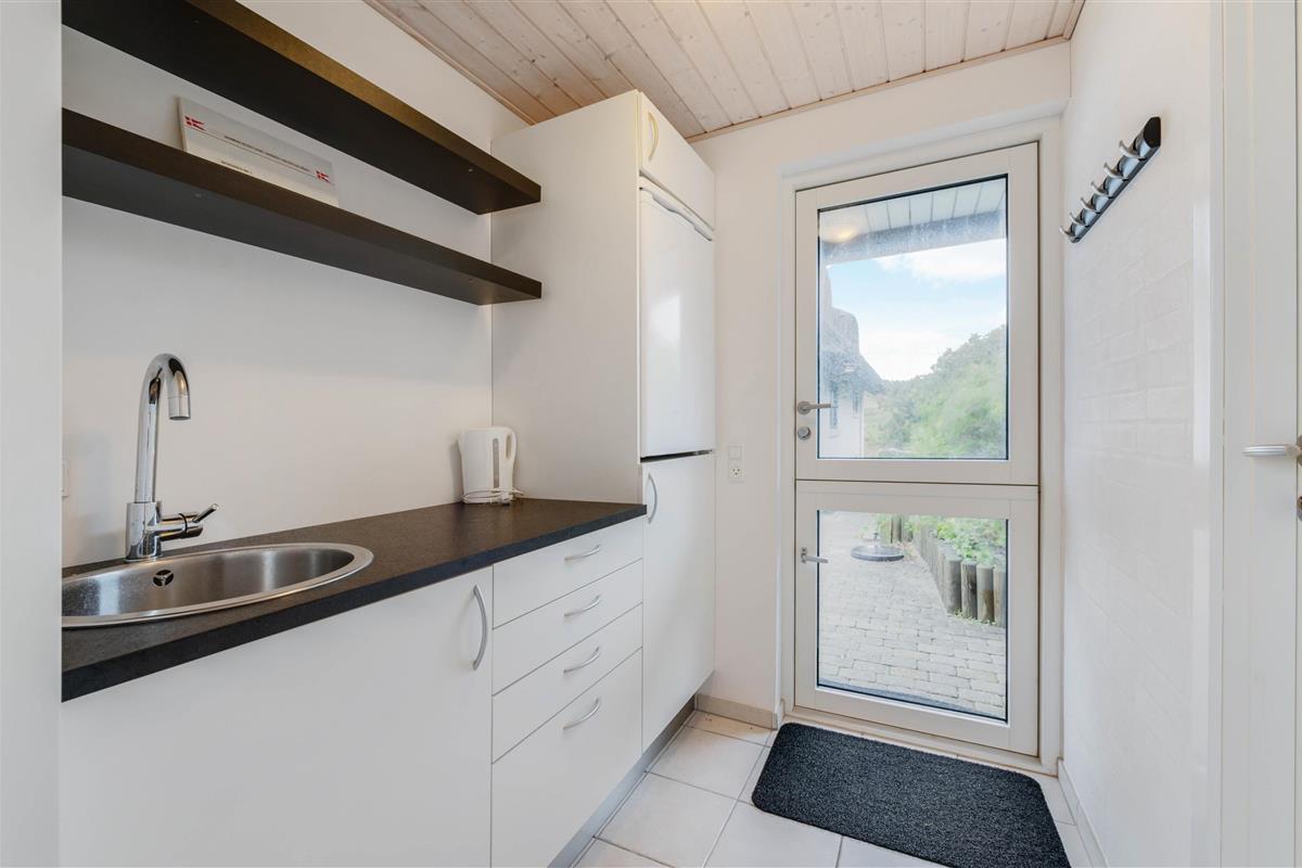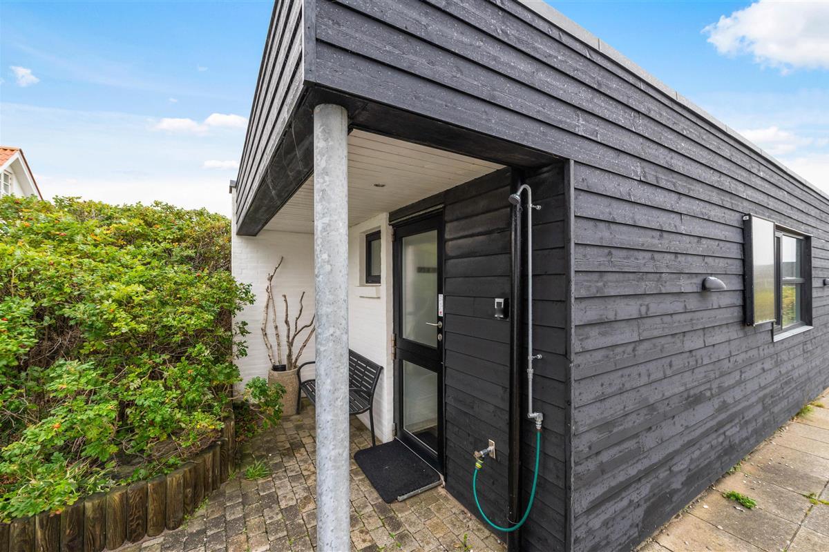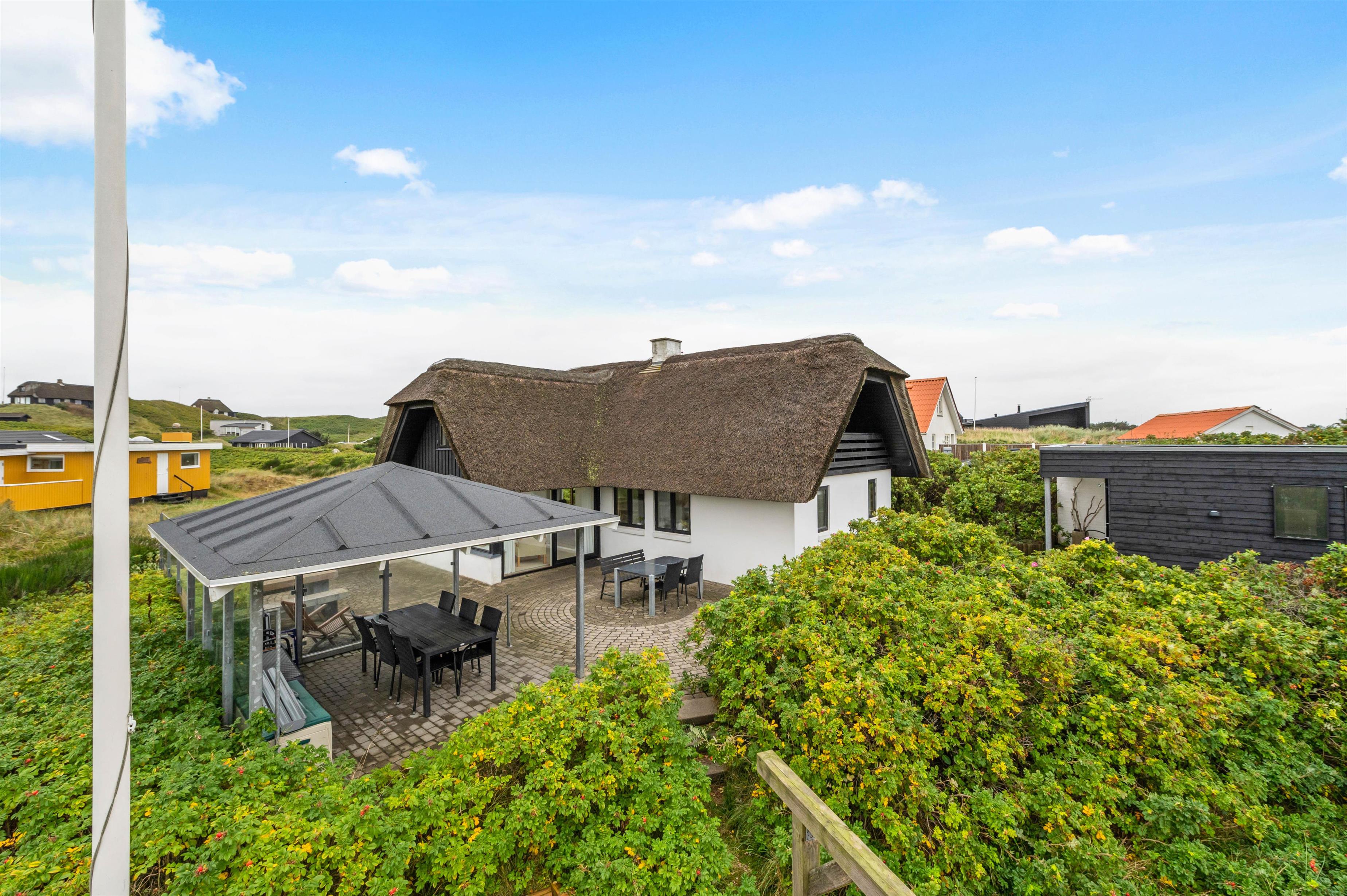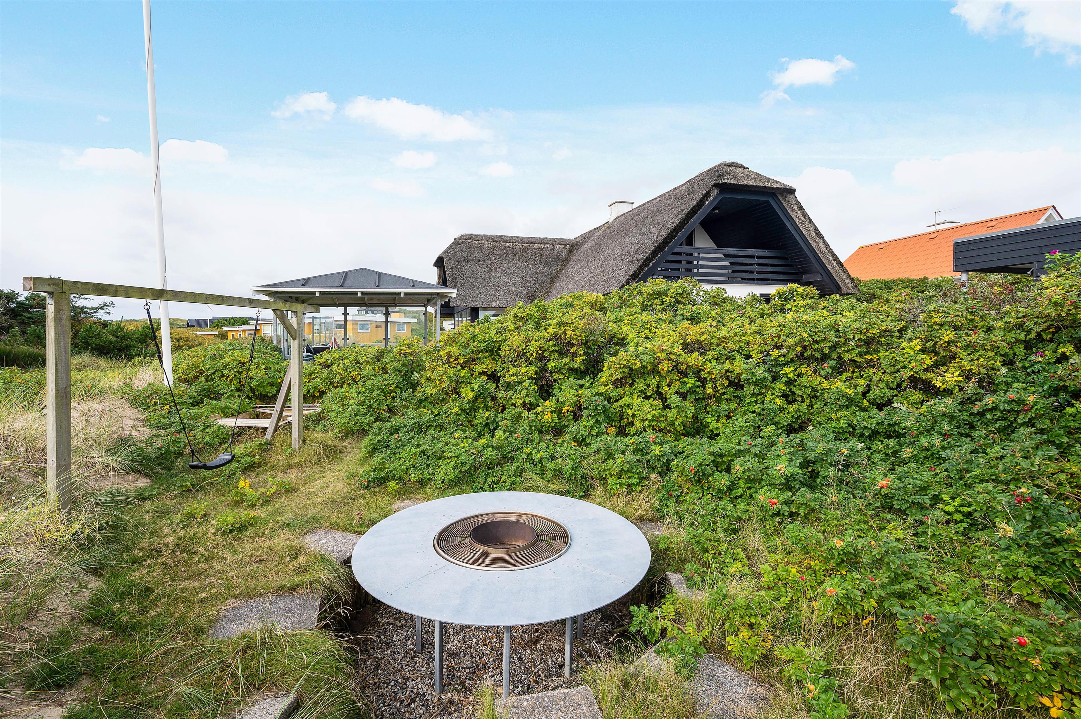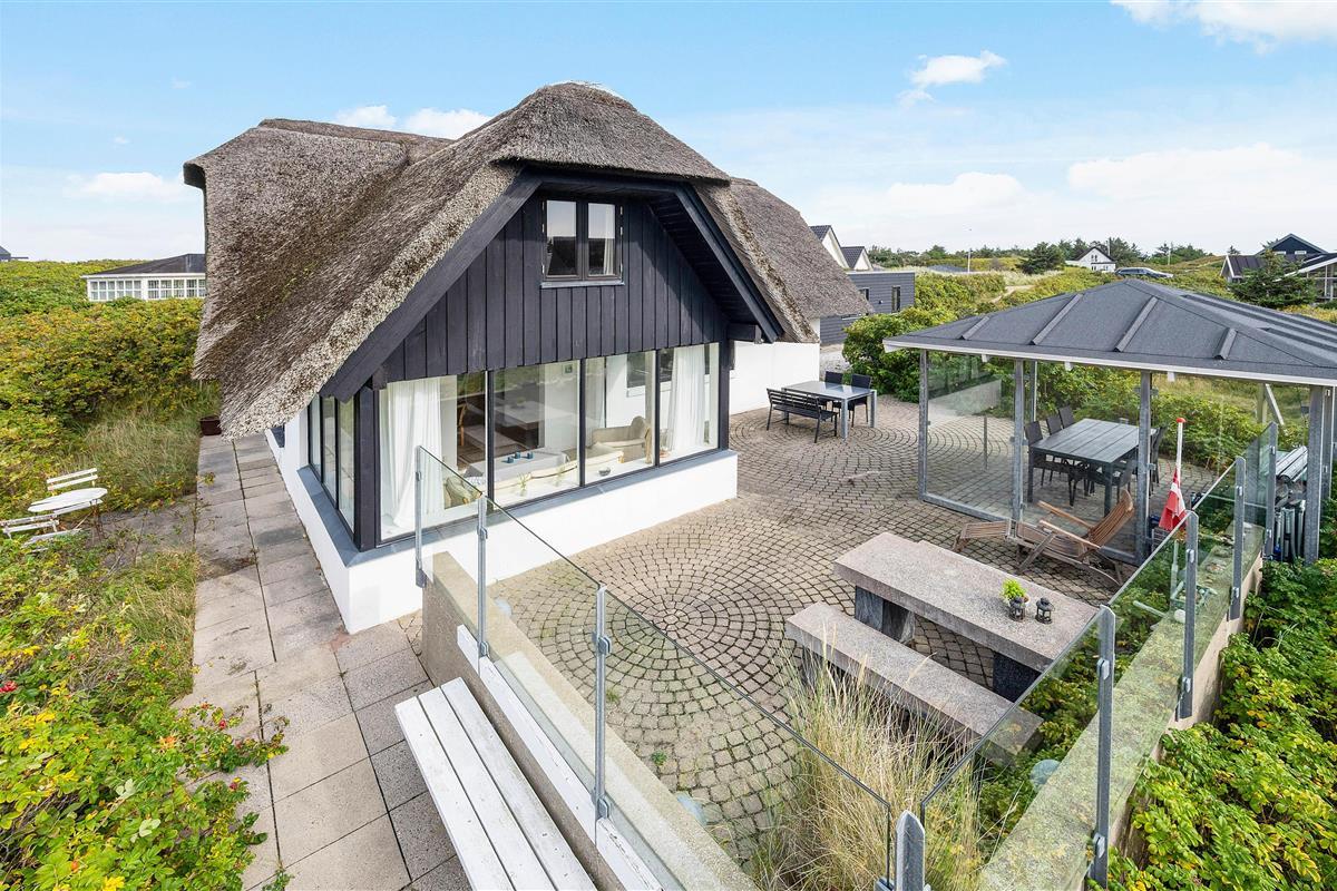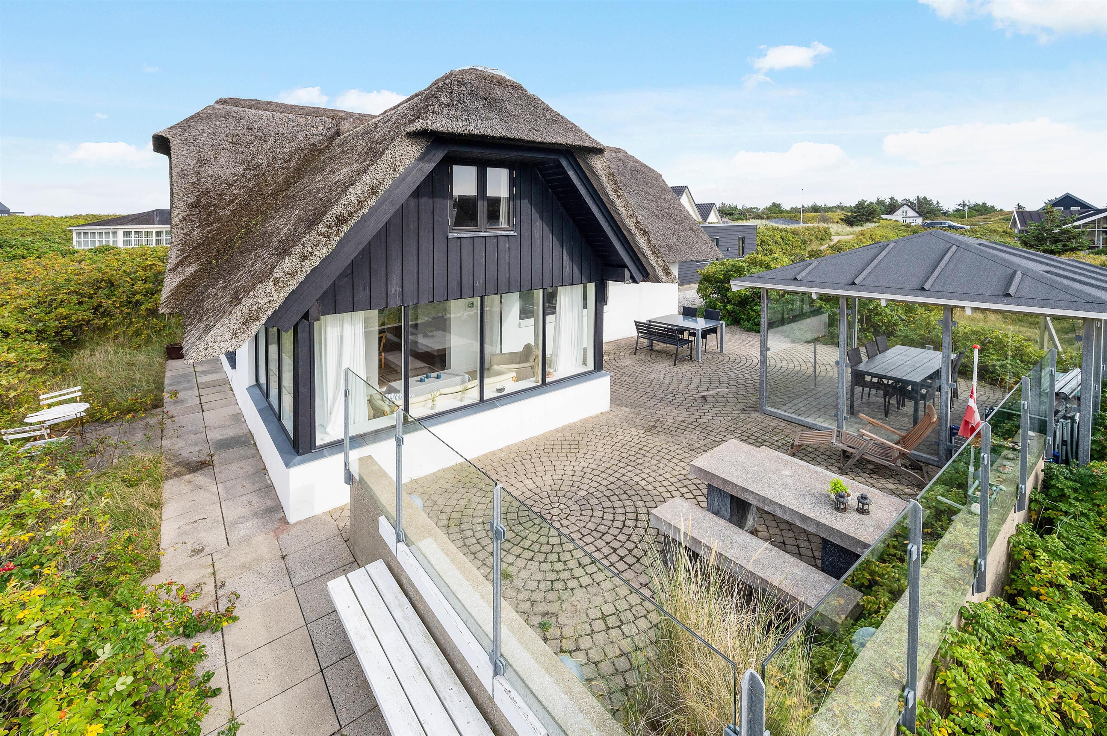 The holiday home at Plantagevej 21 is surrounded by a large, attractive outdoor terrace, partially screened with glass and featuring a covered section. In the lovely glass-enclosed corner with benches, tables and sun loungers, you can relax outdoors whatever the weather and enjoy the Danish West Coast nature. The terrace includes both a barbecue and garden furniture for your use, perfect for relaxing in the sun or enjoying an alfresco barbecue dinner.