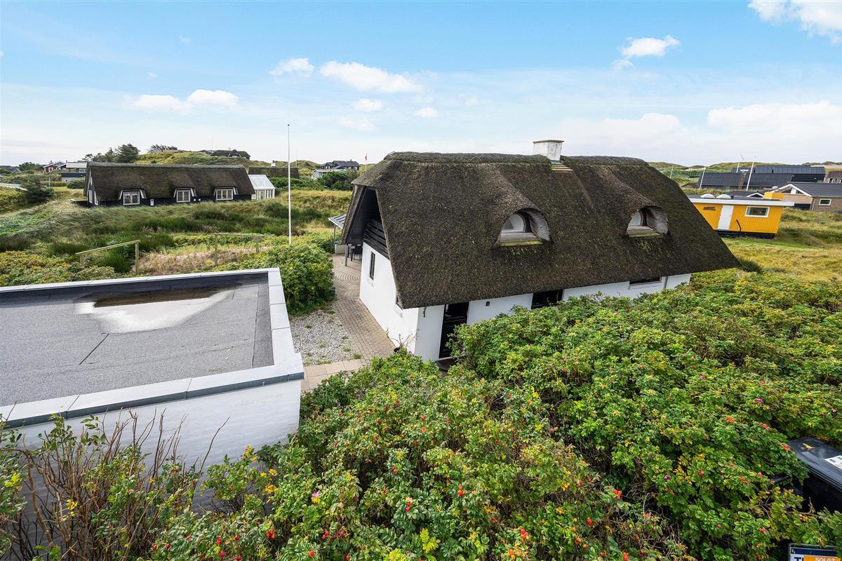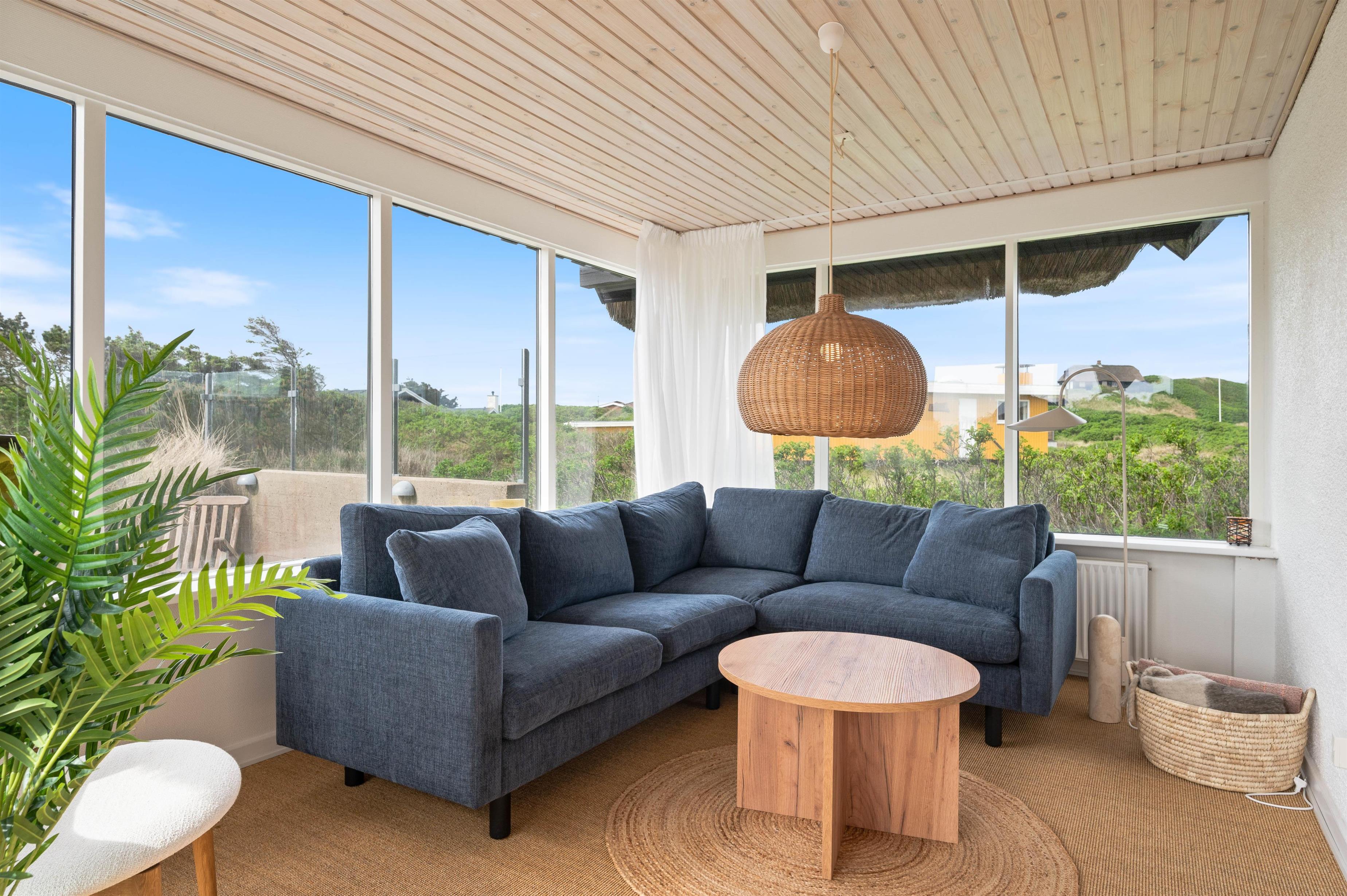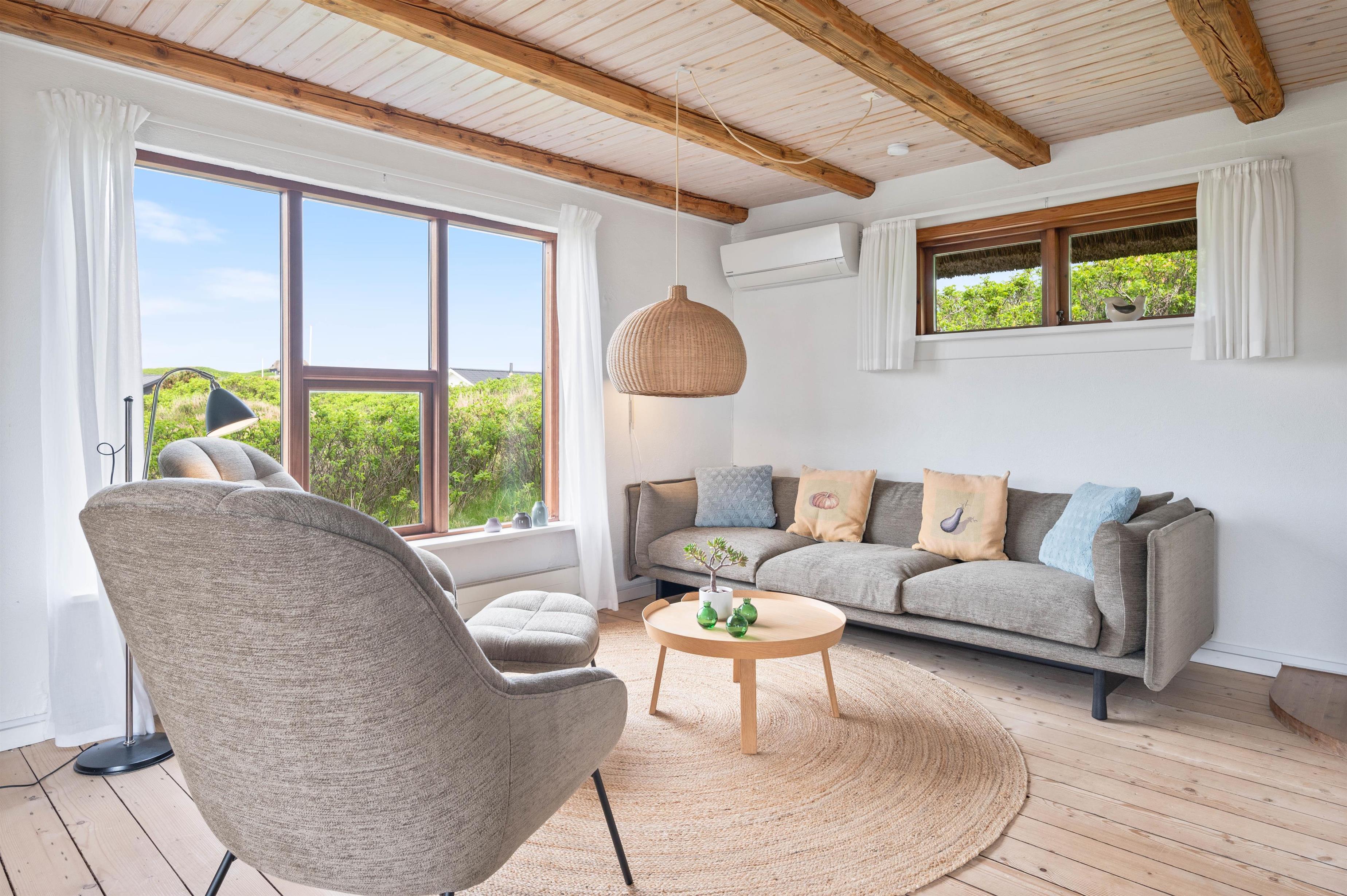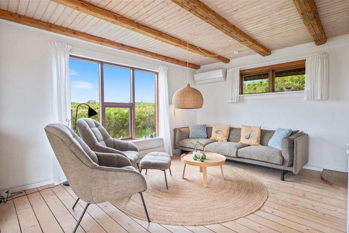 Renovated in 2020, this 140-square-metre holiday home at Plantagevej 21 in Søndervig exudes classic holiday charm. Features include wooden ceiling beams, large windows with window seats offering views over the holiday home landscape, and traditional country-style furnishings. The conservatory offers particularly good views across the surrounding holiday region.