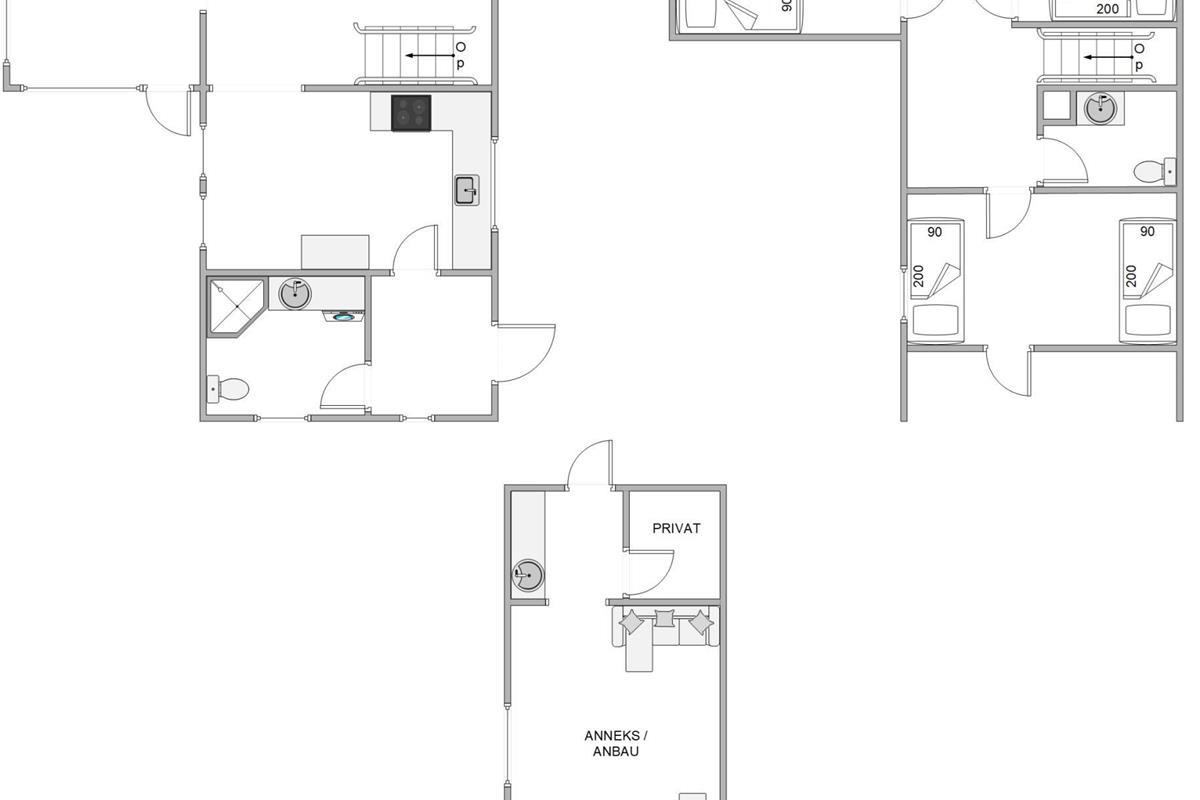 There are three bedrooms with single beds (90 cm x 200 cm), one of which has direct access to a small balcony. The kitchen and living room form an open-plan space, allowing everyone to be involved whether cooking or planning holiday activities. If you need some quiet time, you can retreat to the annexe, which features a small seating area with two sofas and a small television.