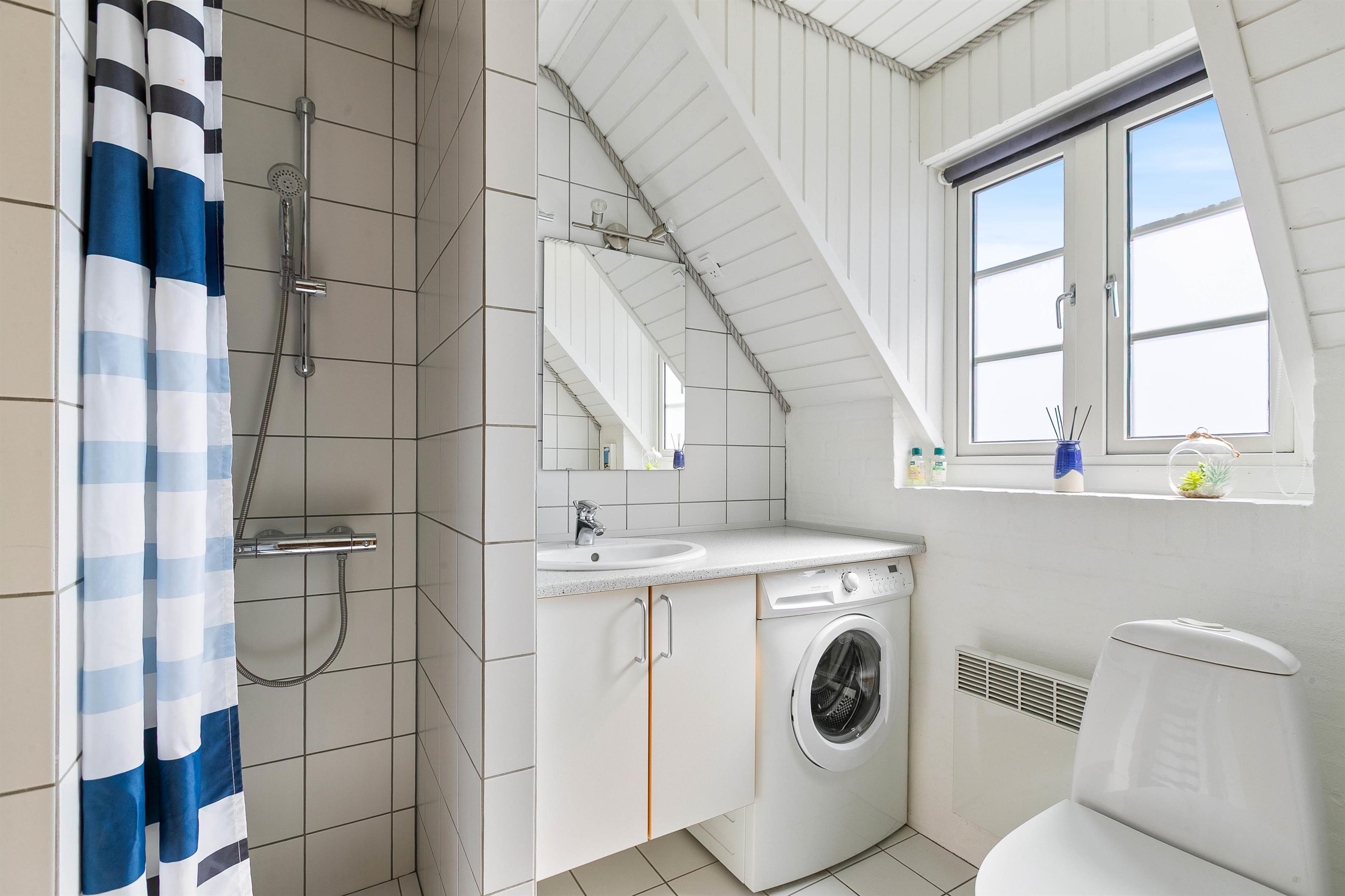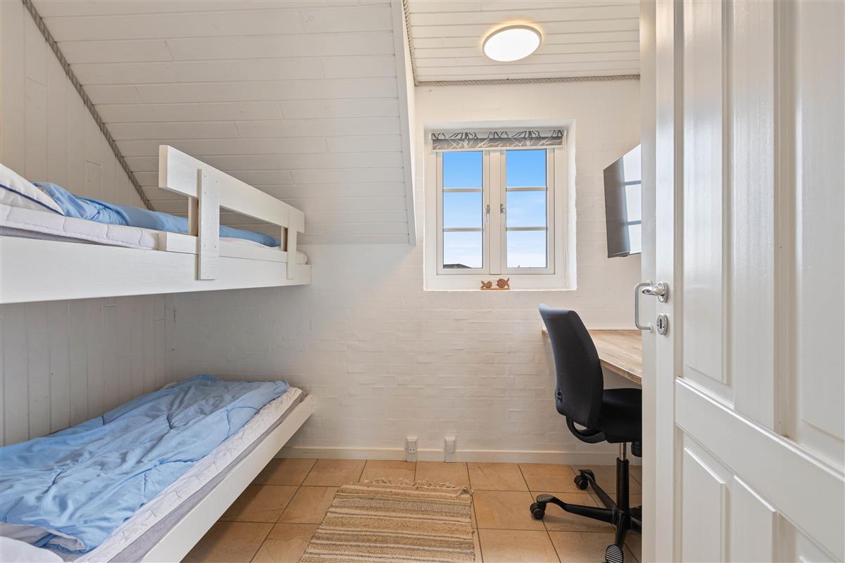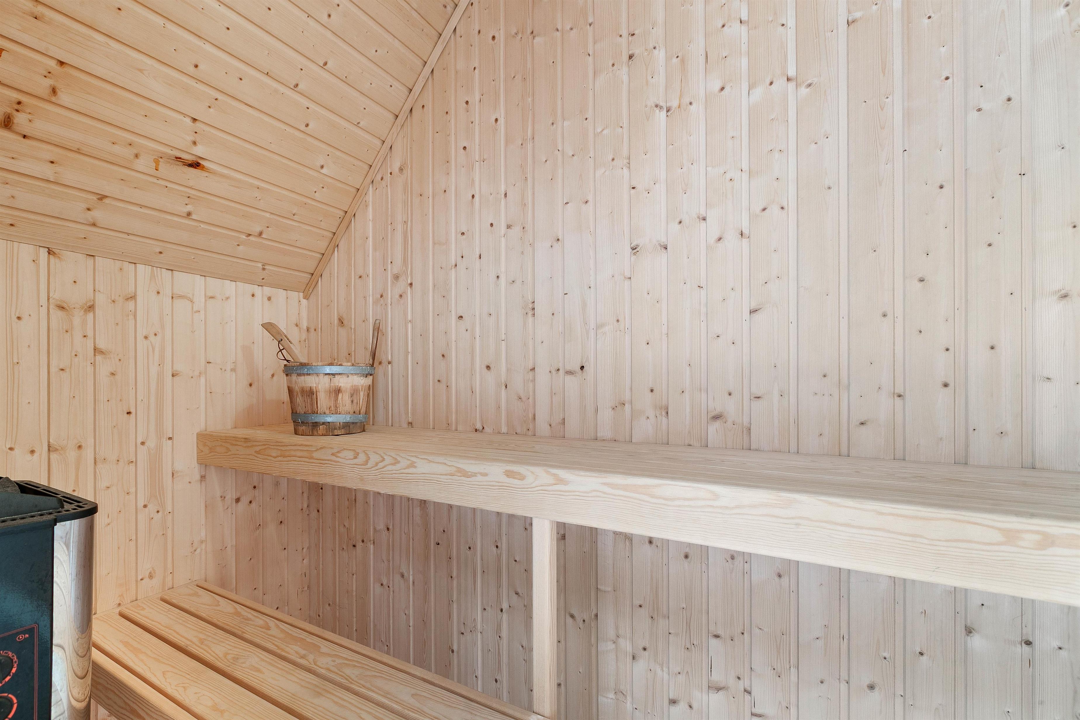 The holiday home has 3 spacious bedrooms with underfloor heating. Two bedrooms feature double beds, while the third has bunk beds for children. The bathroom also benefits from underfloor heating and includes a walk-in shower. Here you'll also find access to the sauna, where you can take a relaxing break from everyday stress.