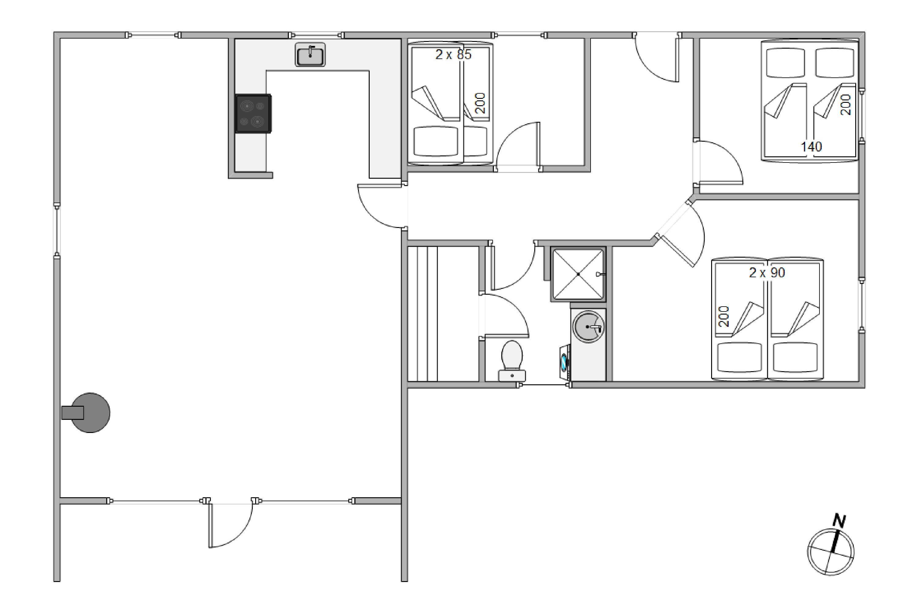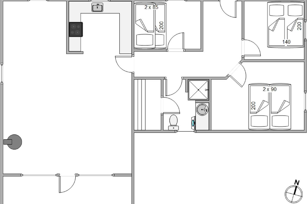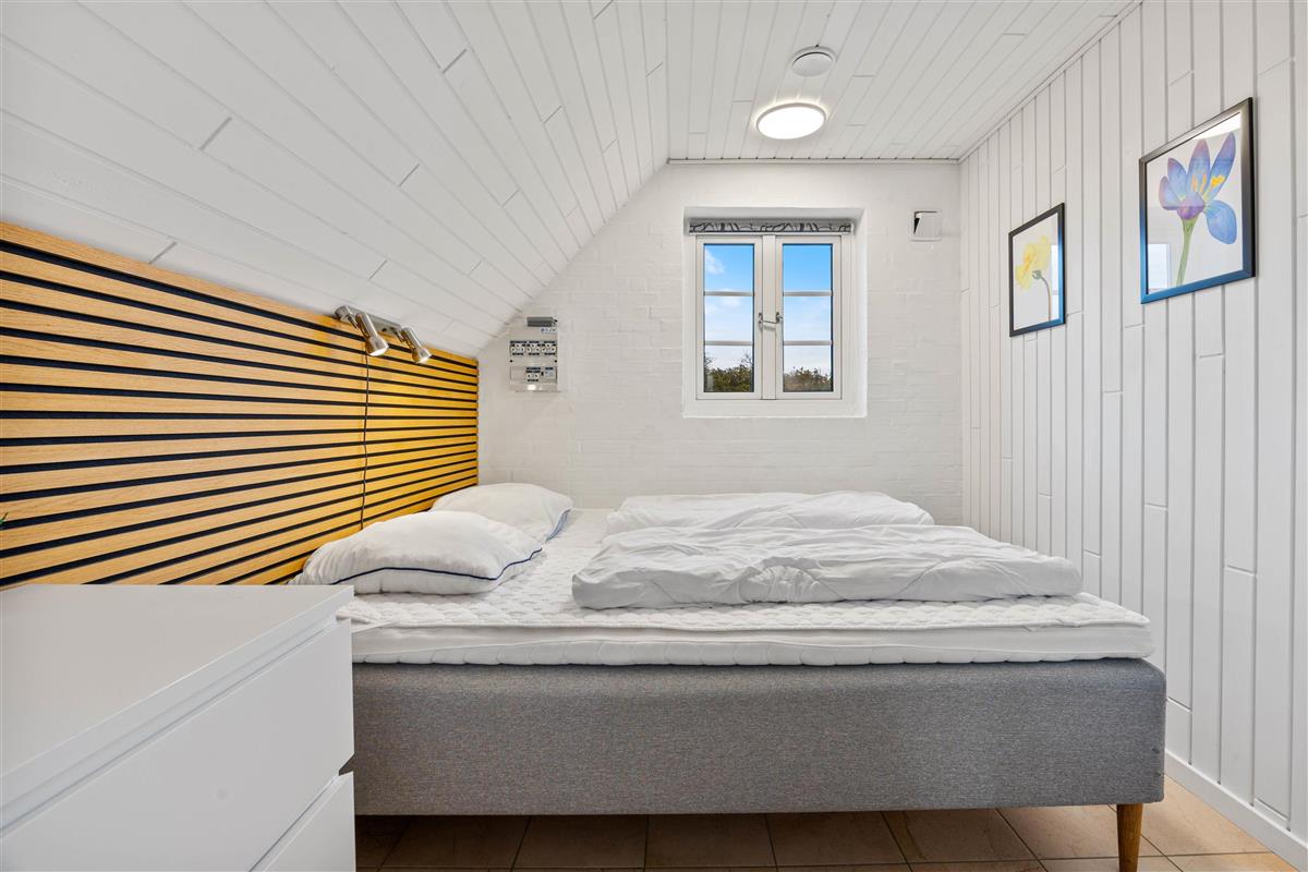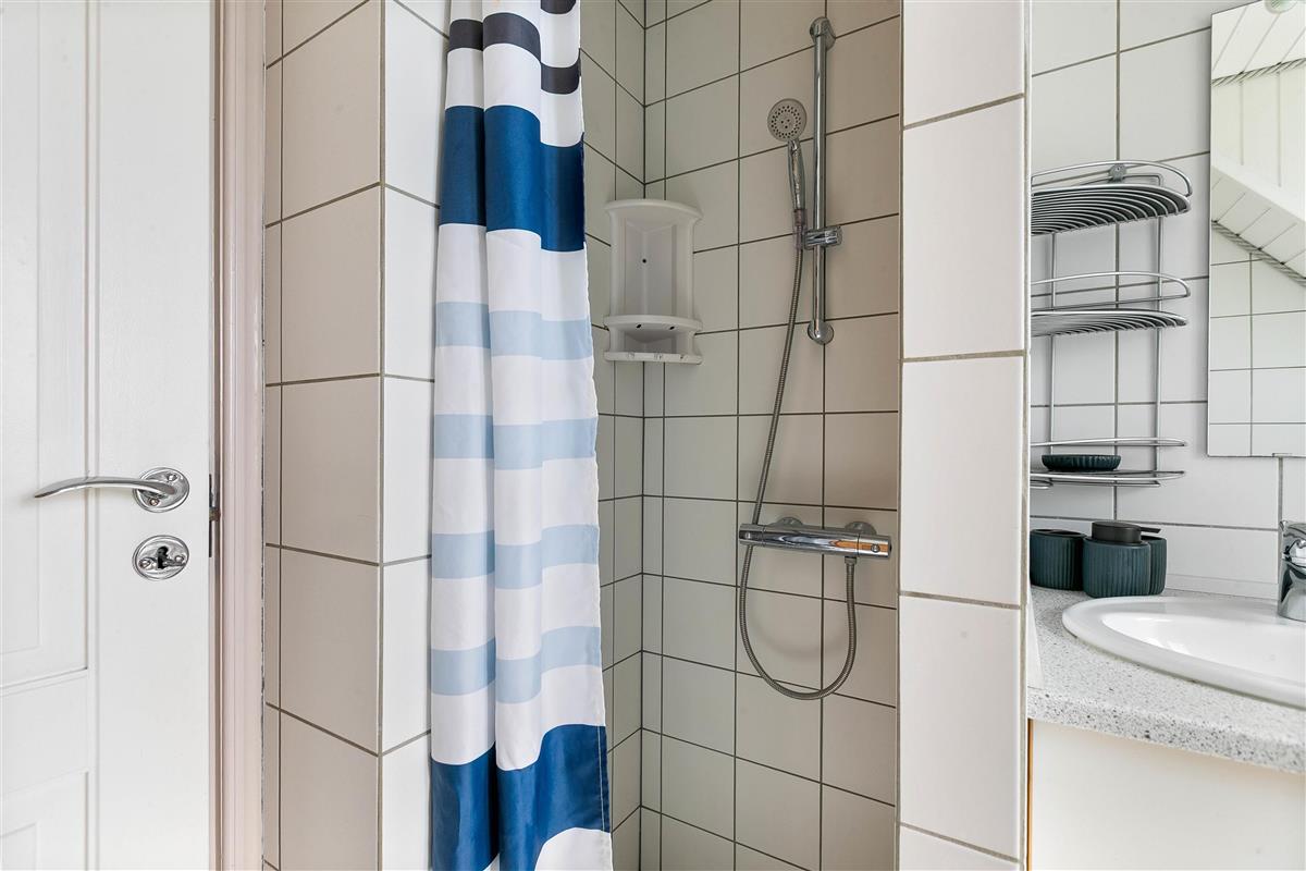 The holiday home has 3 spacious bedrooms with underfloor heating. Two bedrooms feature double beds, while the third has bunk beds for children. The bathroom also benefits from underfloor heating and includes a walk-in shower. Here you'll also find access to the sauna, where you can take a relaxing break from everyday stress.