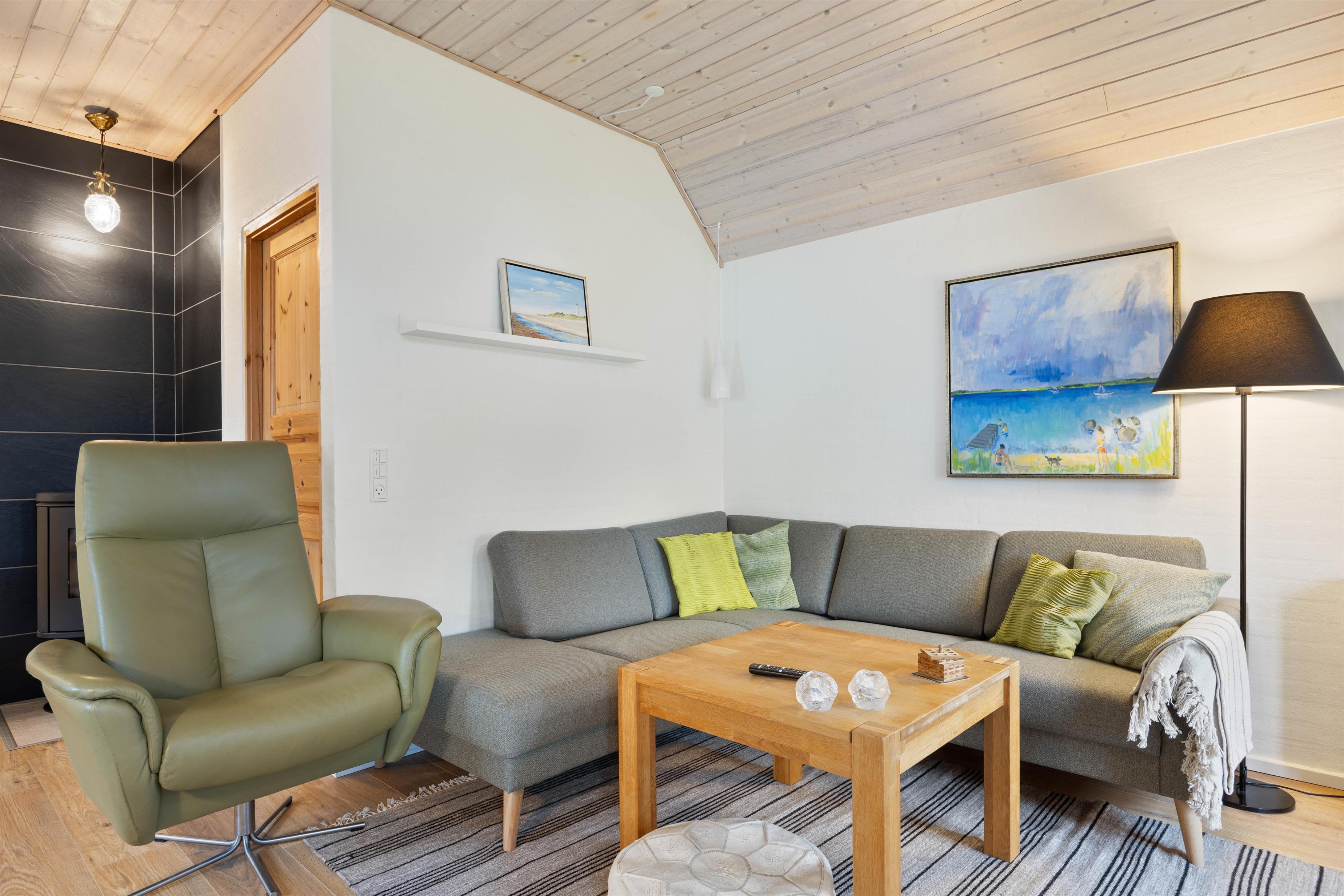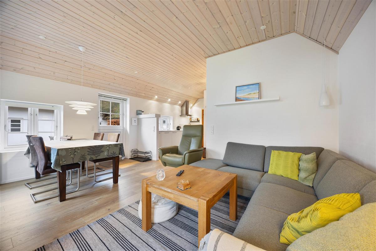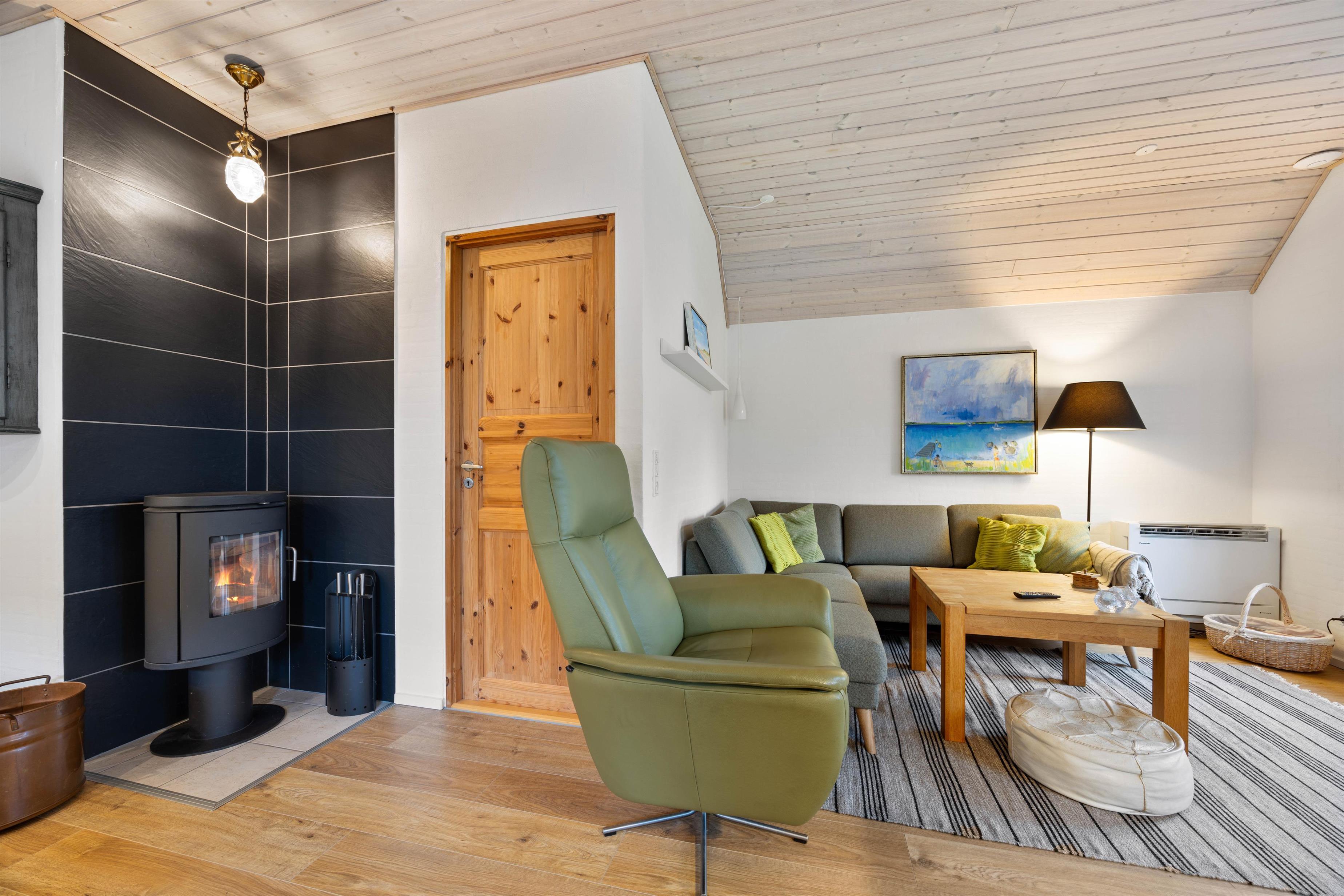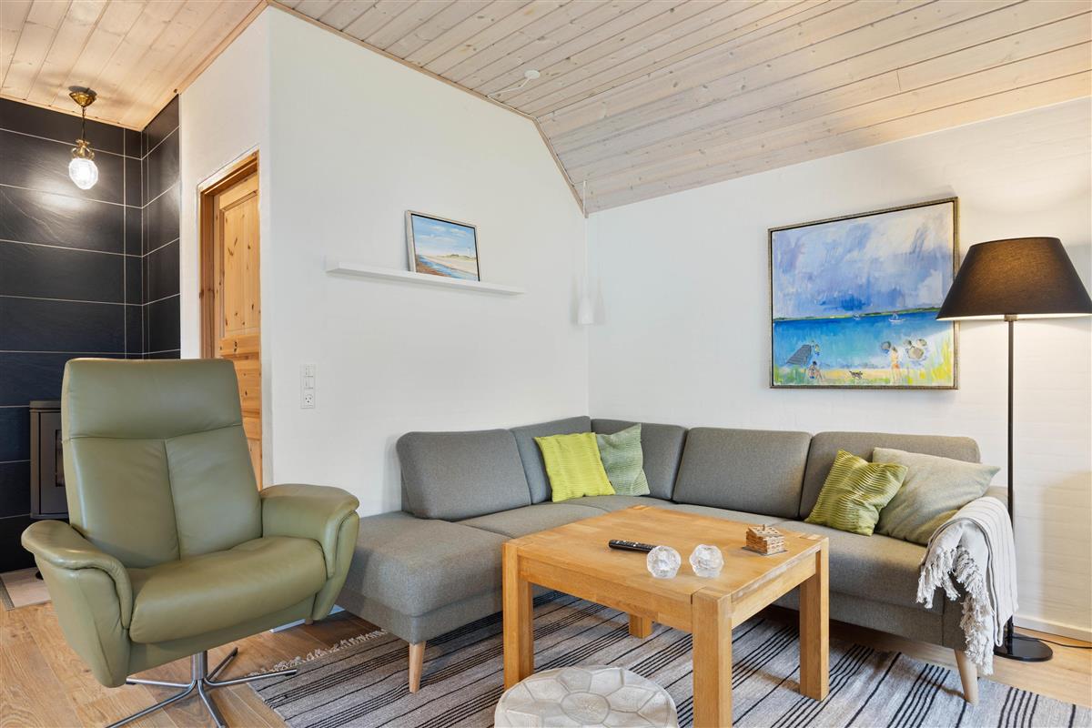 The holiday home is perfectly suited for up to 8 people and two dogs, with two separate living units each accommodating 4 people. Here you can enjoy spending time together while still maintaining your privacy. In the spacious living area, a wood-burning stove invites you to spend cosy evenings by the crackling fire.