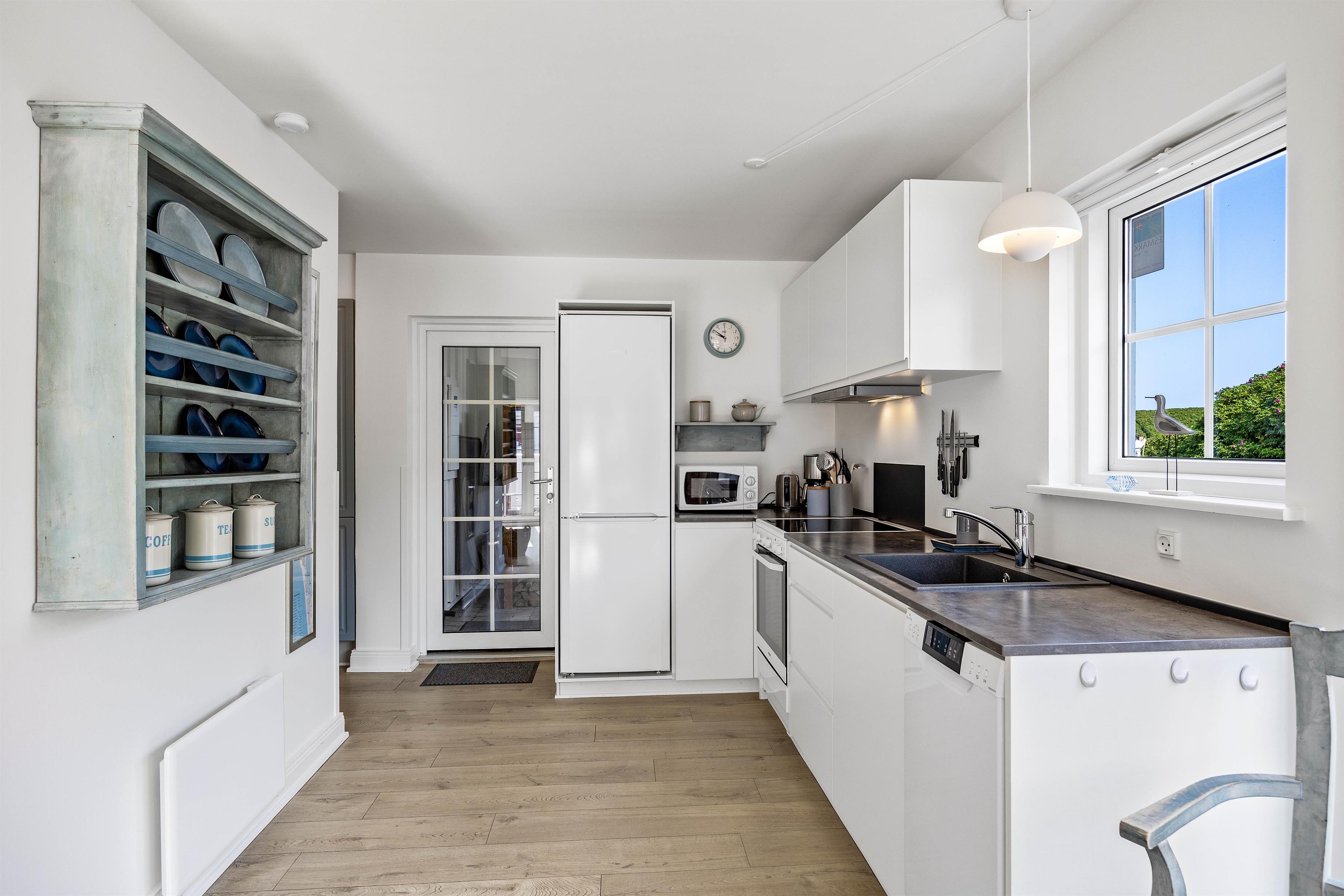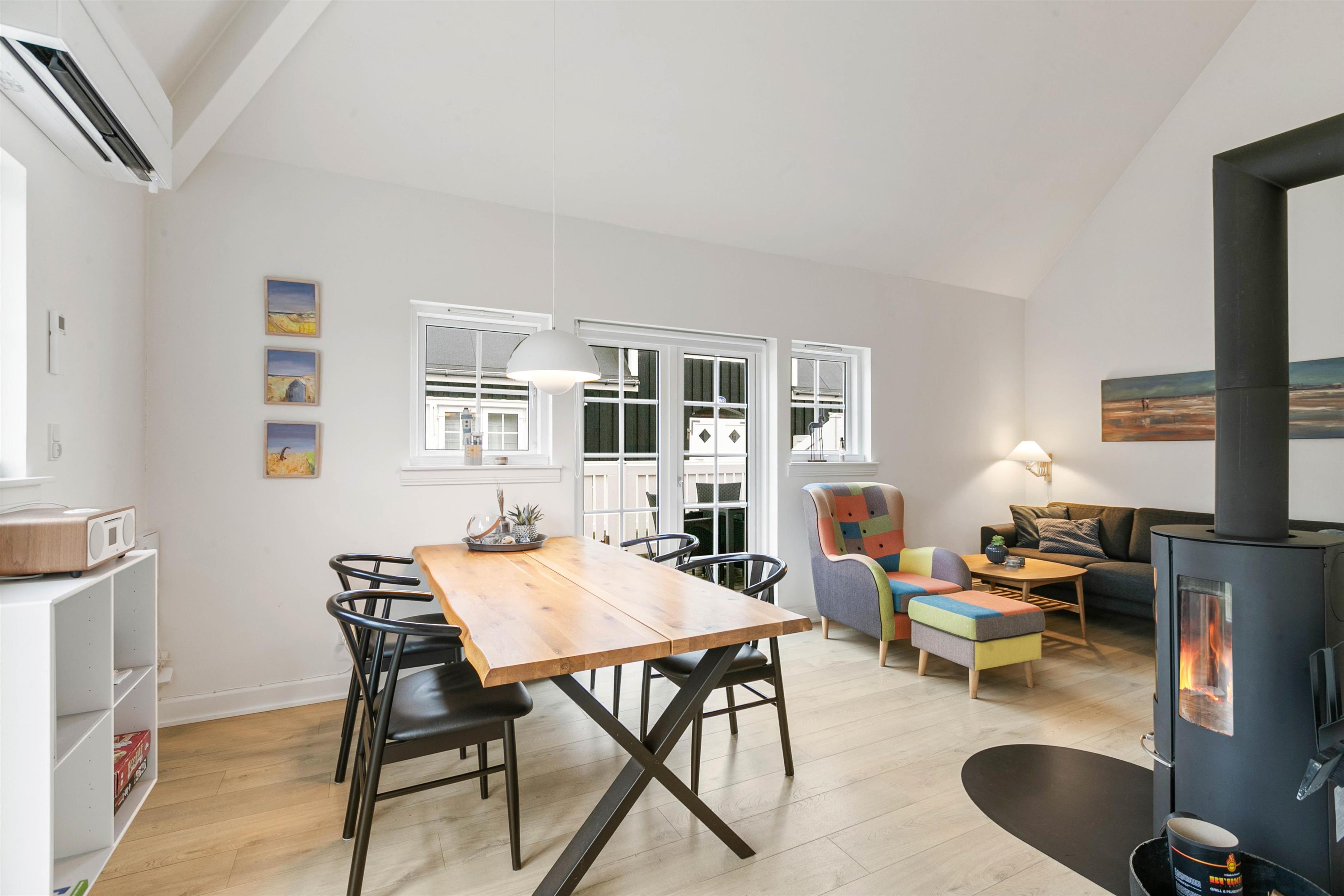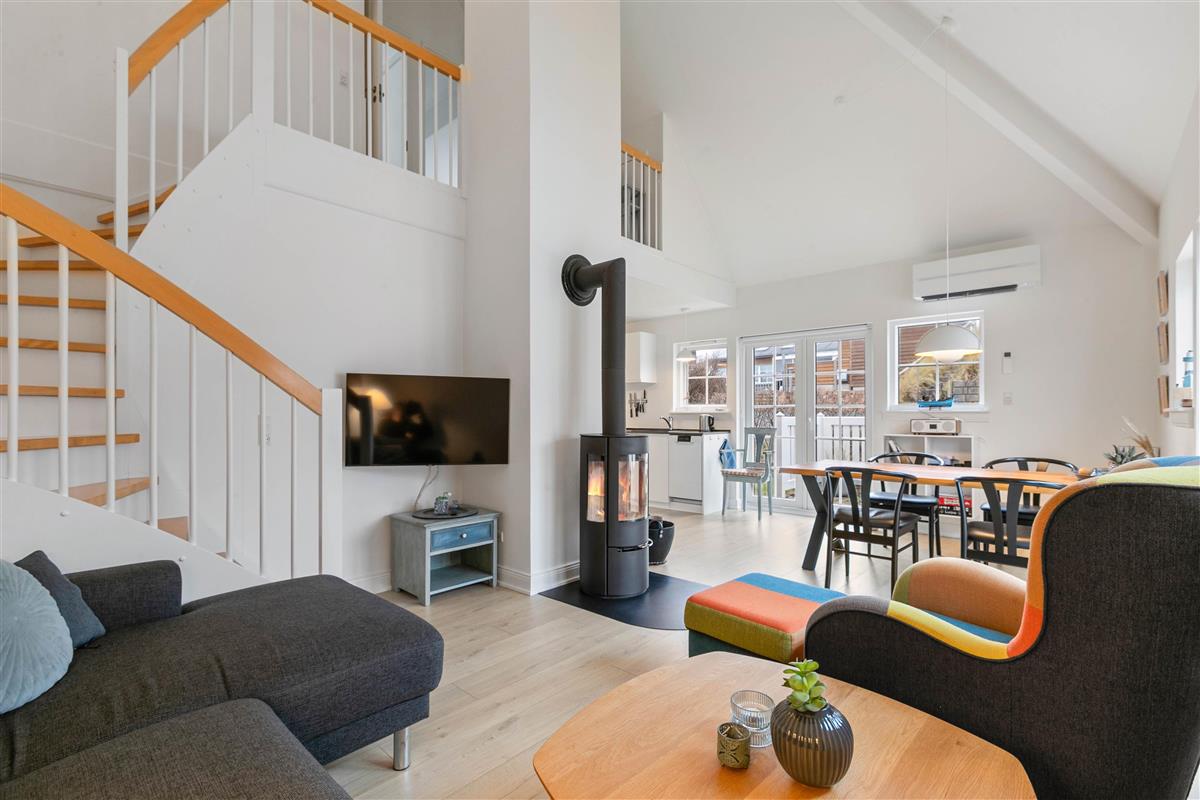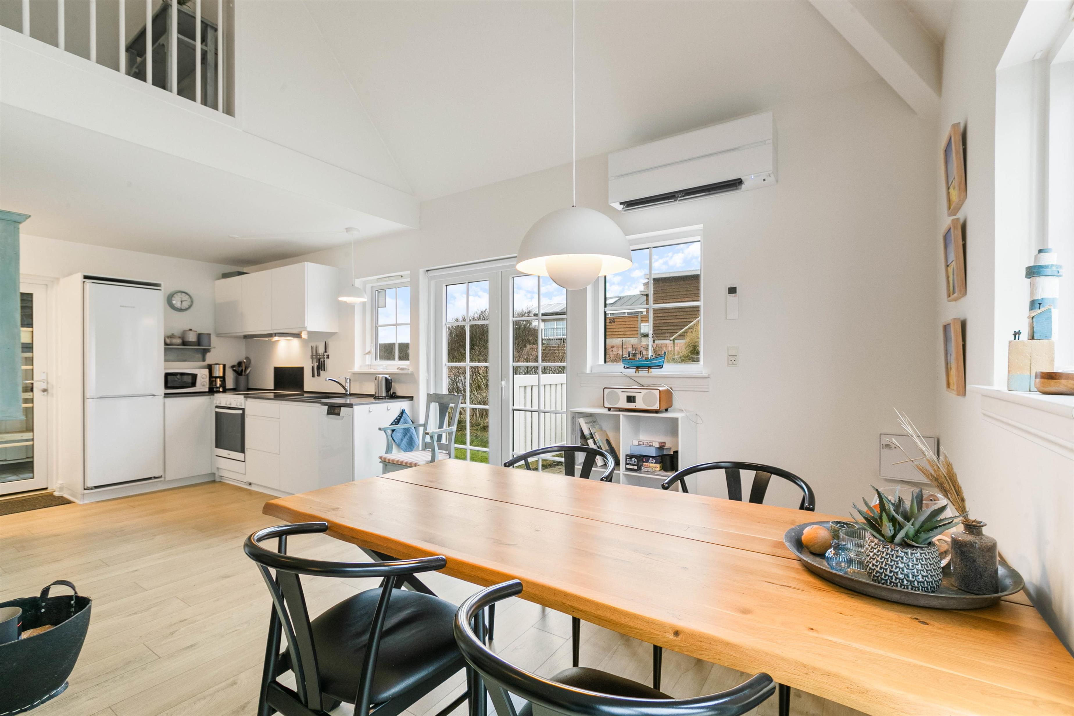 Upon entering, you're welcomed by an entrance hall with a cloakroom providing space for your coats and shoes. From here, you'll find the spacious living area that combines the kitchen, dining area and living room. This is where you can cook together, play games, relax and plan your holiday activities. The living room fireplace provides both warmth and that characteristic holiday atmosphere. The holiday apartment comes equipped with a dishwasher, washing machine and tumble dryer, allowing you to spend less time on housework and more time with family. A modern, energy-efficient heat pump ensures comfortable temperatures throughout the year.