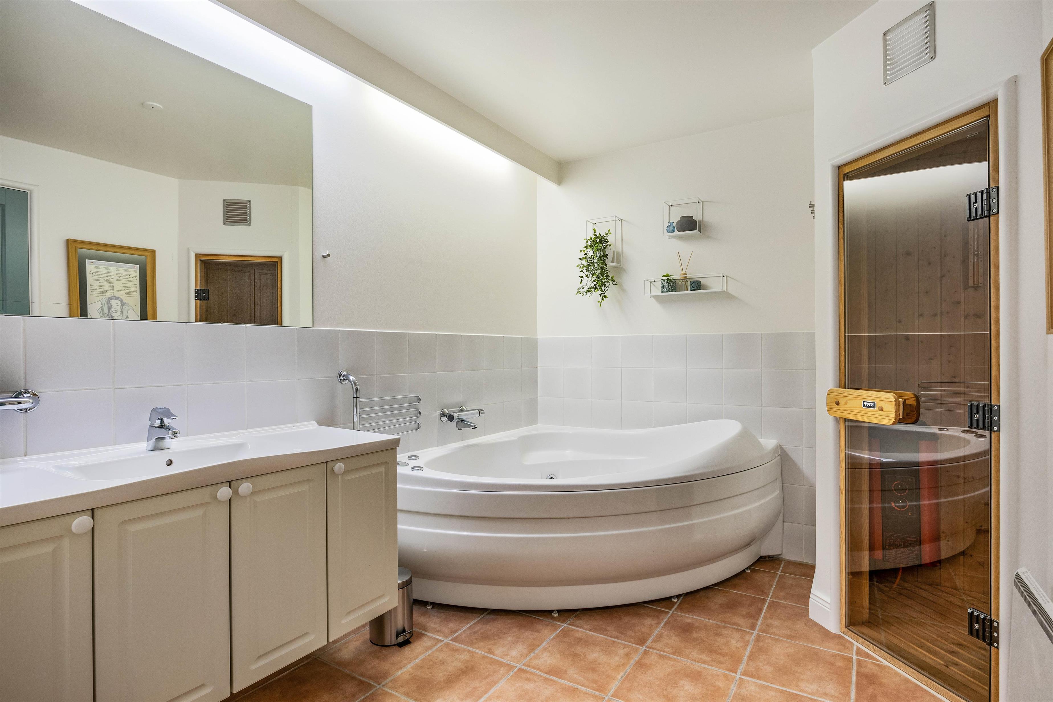 The kitchen, like all the furnishings, is modern and fully equipped with everything needed for daily life. Also on the ground floor, you'll find the main bathroom featuring underfloor heating to keep your feet warm on chilly days. The bathroom houses both the private sauna and whirlpool - perfect for warming up and unwinding after a long walk. There's also a separate guest toilet, ensuring uninterrupted enjoyment of your wellness facilities.